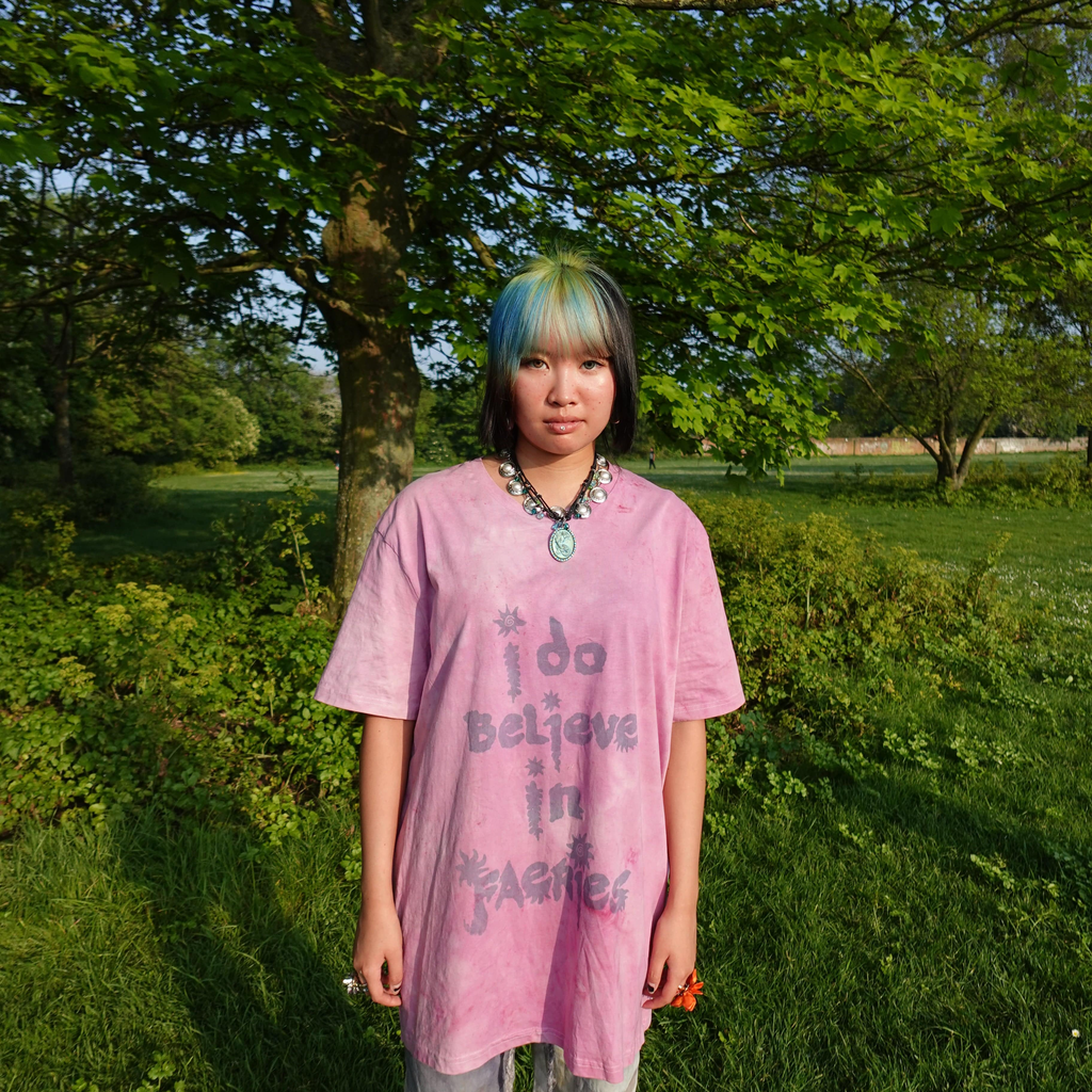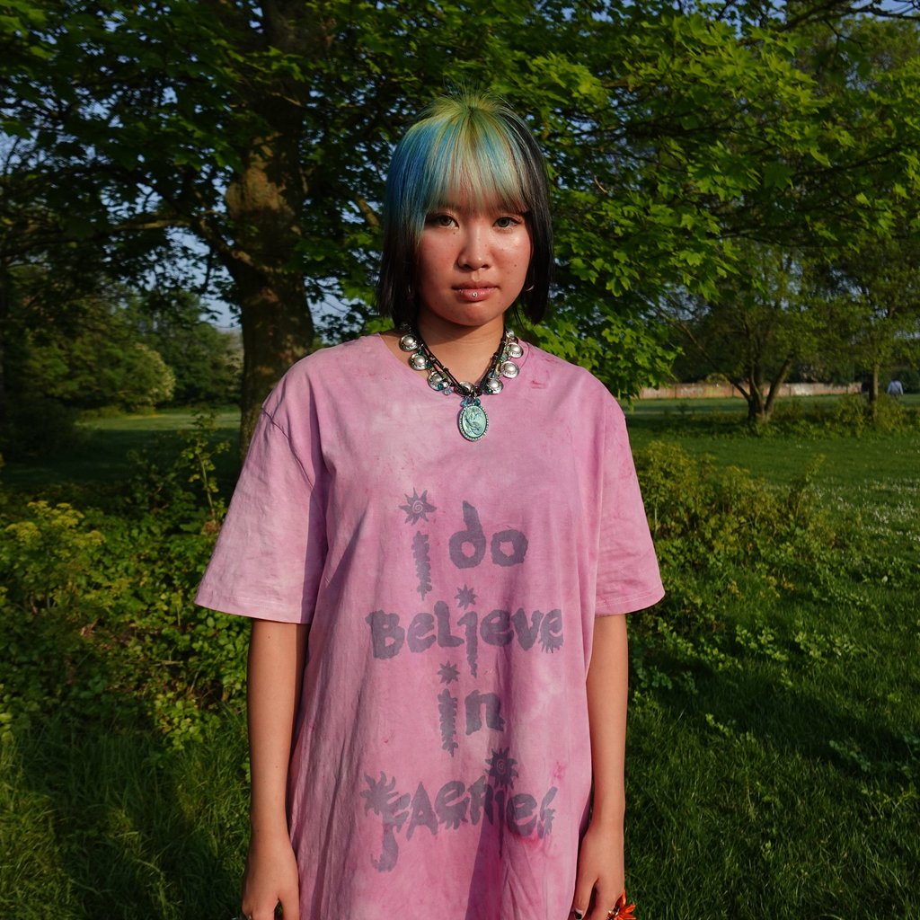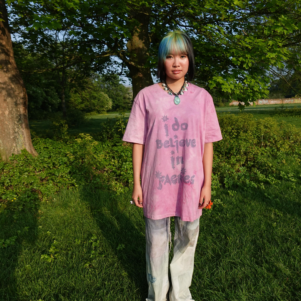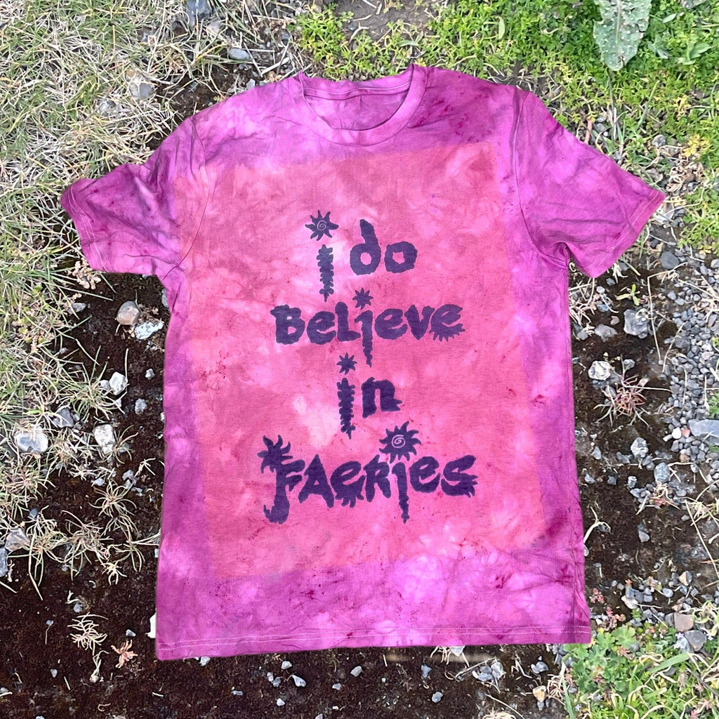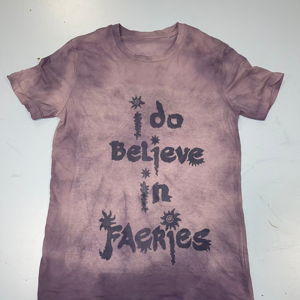 The I Do Believe in Faeries Tshirt has been screenprinted with handmade bark ink, with crushed selenite crystals for anti-anxiety properties. Neutral fit and made with salvaged organic cotton.