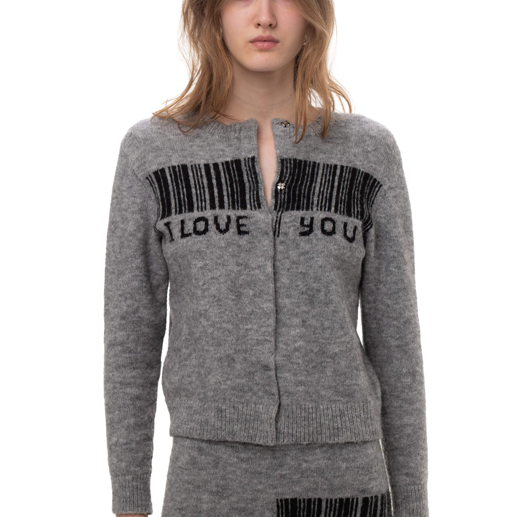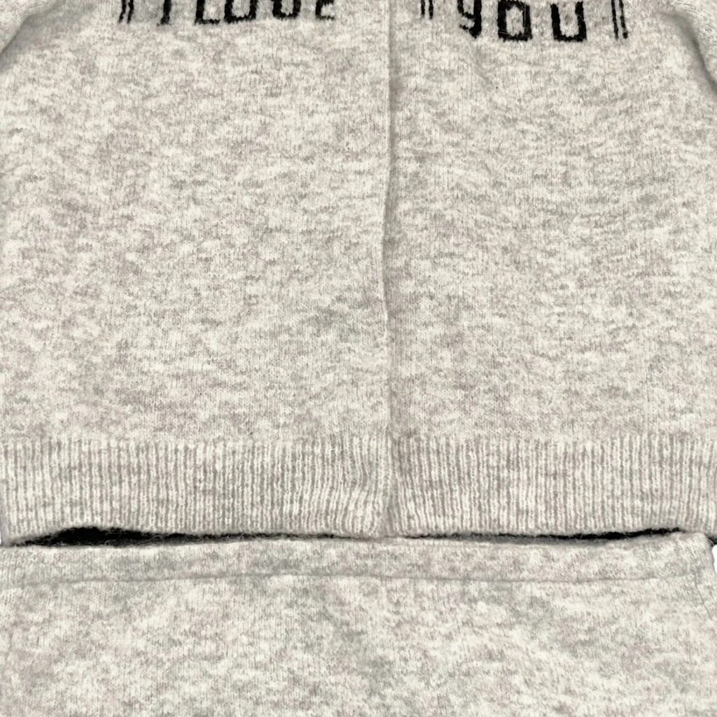 Machine knit wool and cashmere top featuring a graphic design at front. Long sleeves and stretch knit. Hidden snap closure at front.