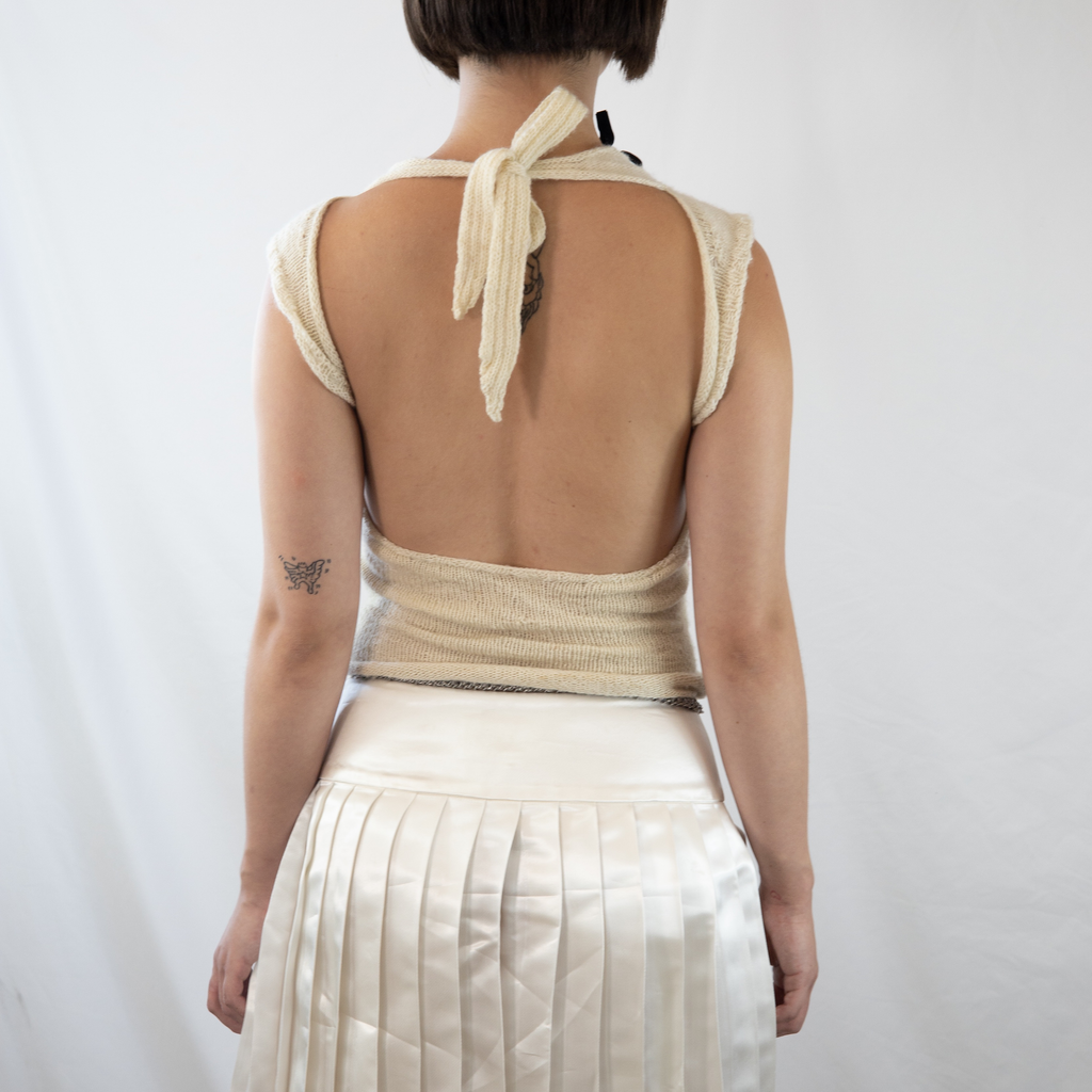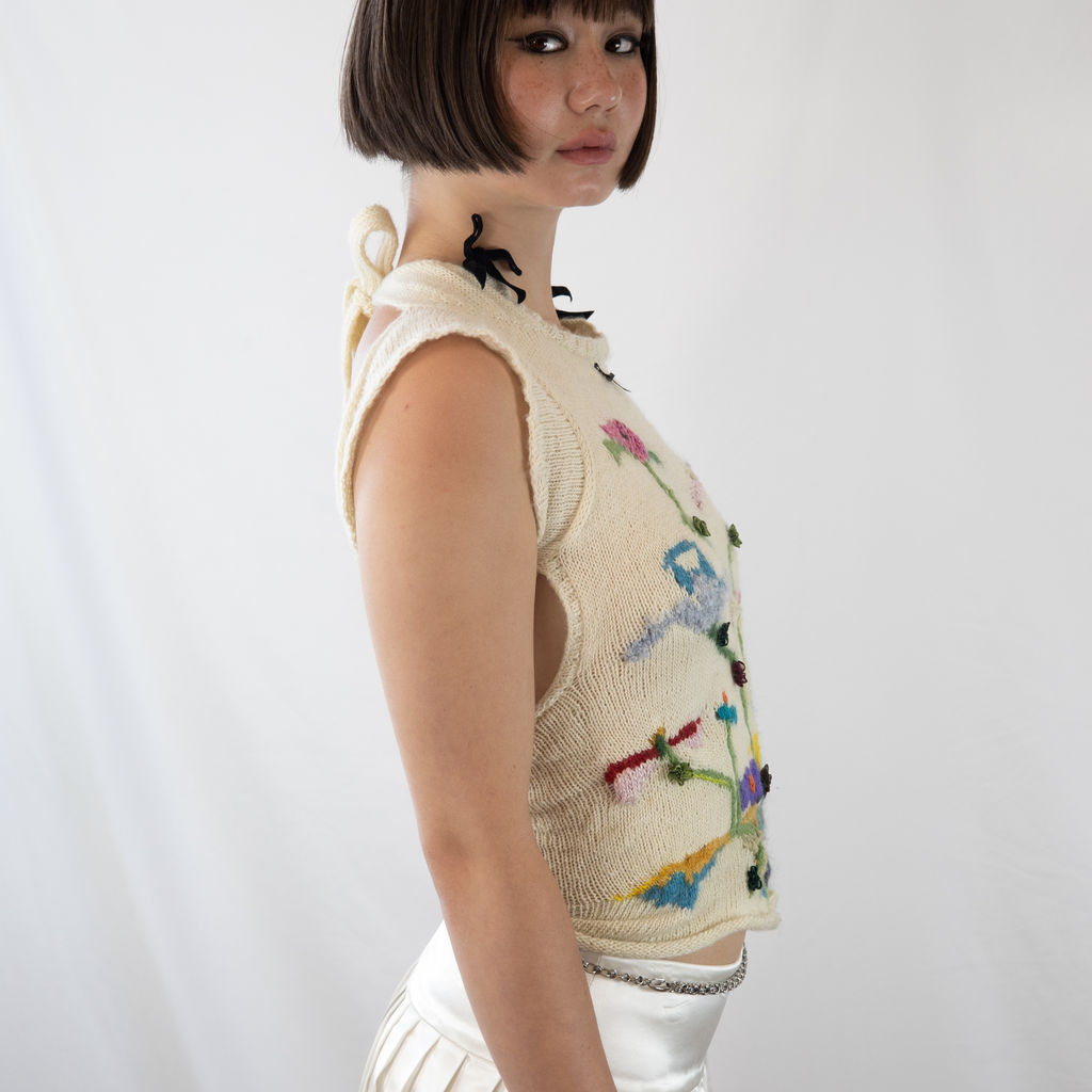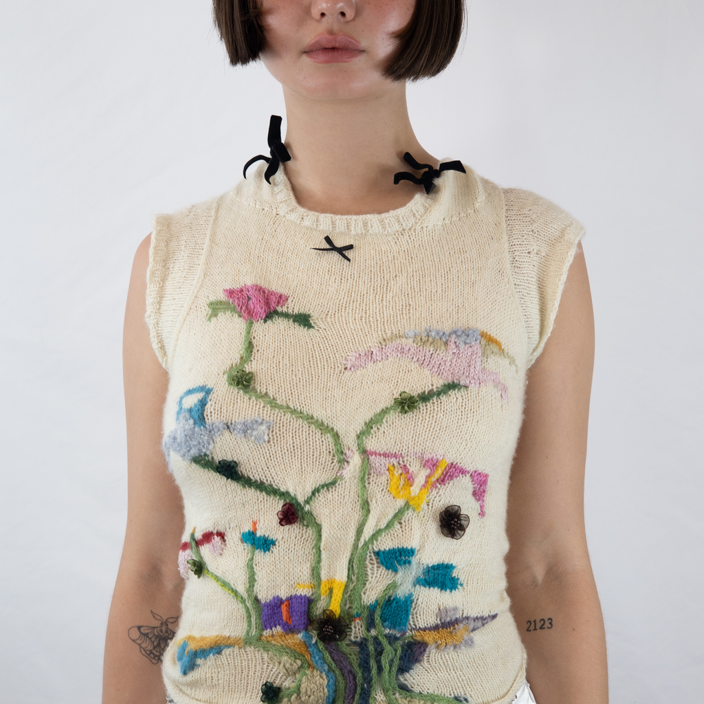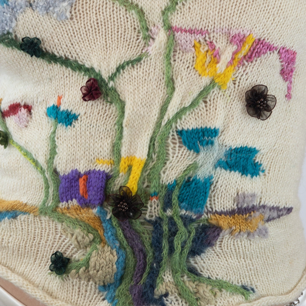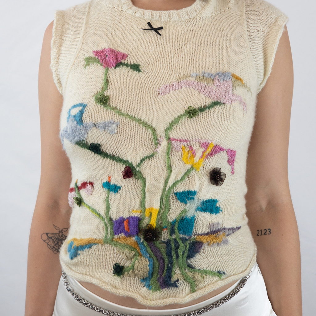 This Intarsia Painting Top was hand-knit over the course of a week with a skein of 50/50 silk merino mohair sourced in Williamsburg NYC from a female shop owner. Knit with a multitude of yarns; mohair, wool, silk, cotton, etc. GRACE GUI Studio can recreate any selection of flowers desired.