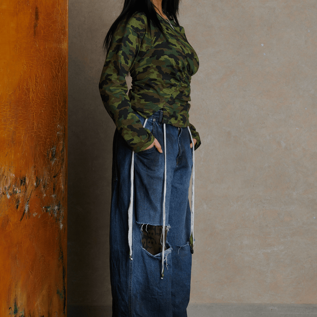 Denim 11OZ. Low rise with spliced panels. Frayed seams. Denim stretches half a size.