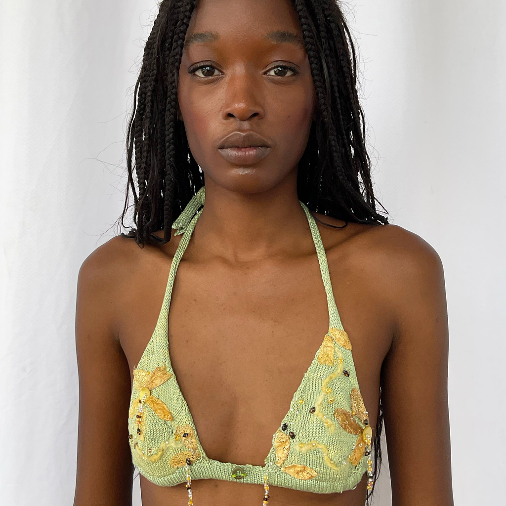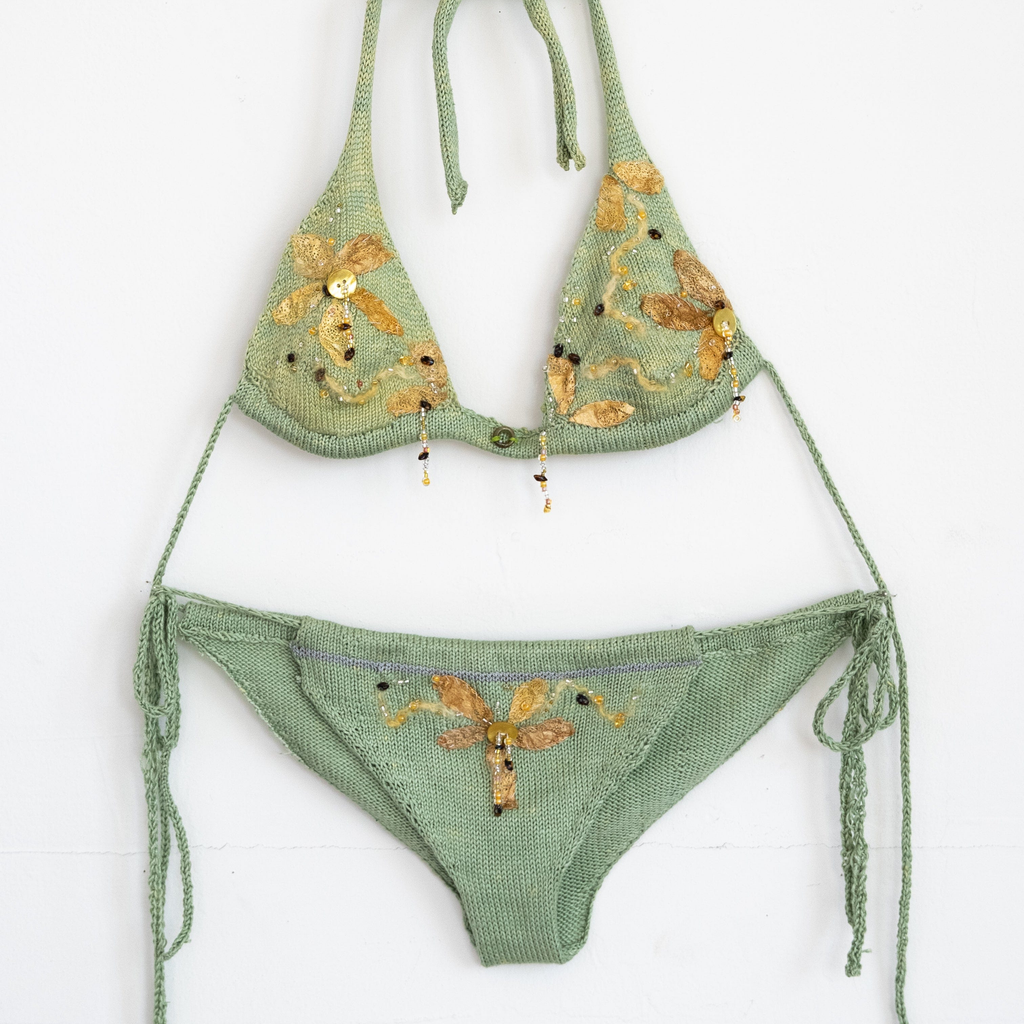 This Jade Bikini set by GRACE GUI is knit with 100% Ahimsa Peace Silk sourced from North Carolina, embroidered with a genuine jade pendant, wild silk cocoons, mother pearl buttons and glass seed beads; the felting is wensleydale lamb locs from Pennsylvania.