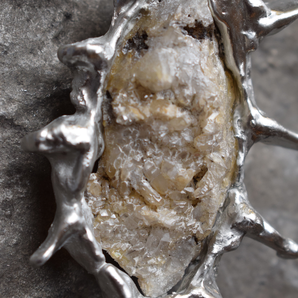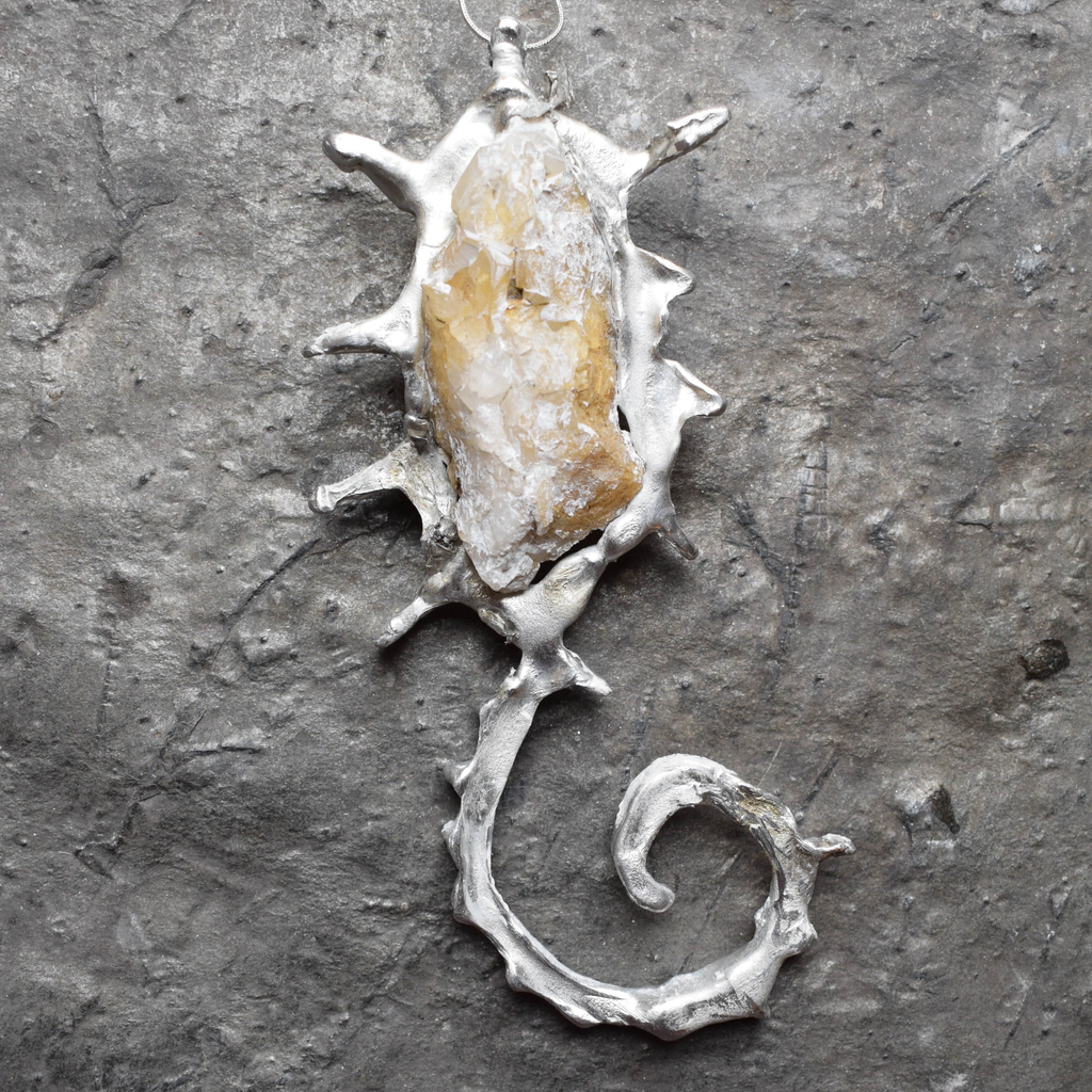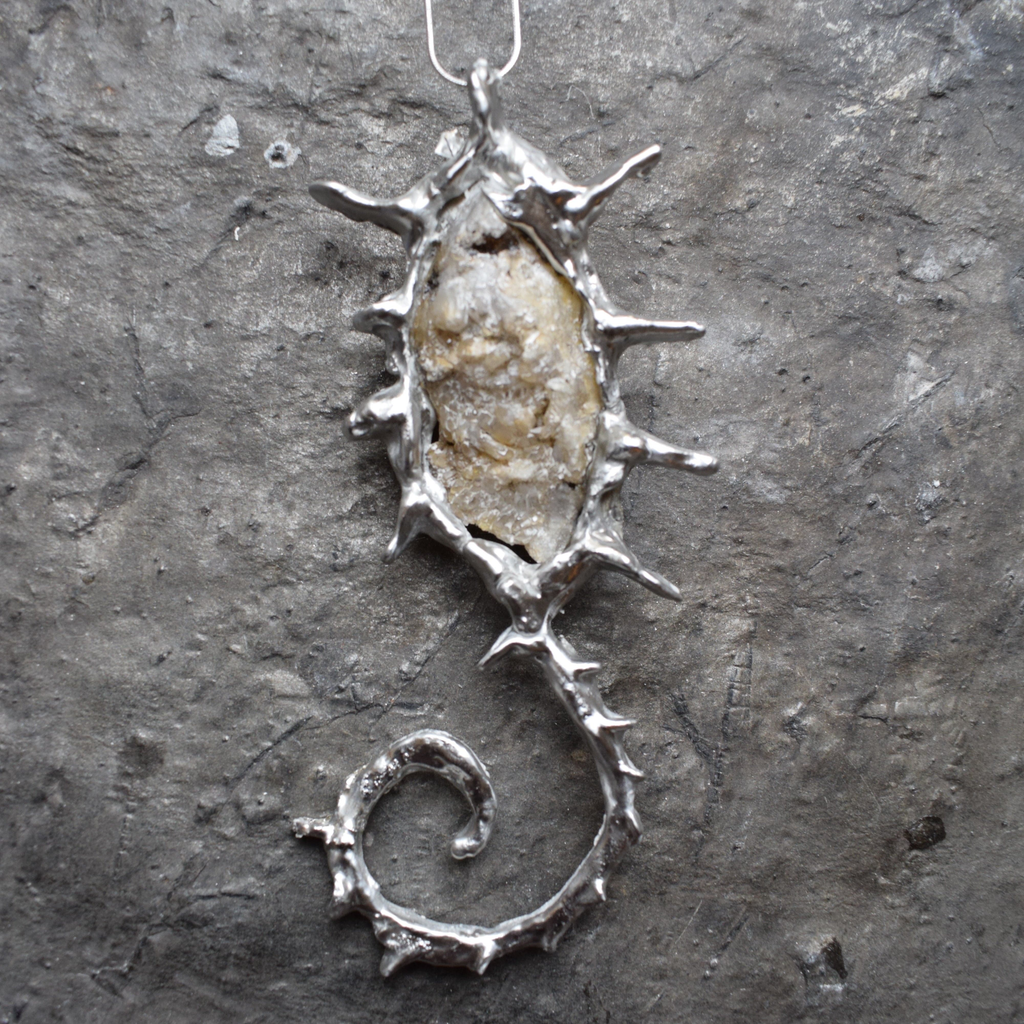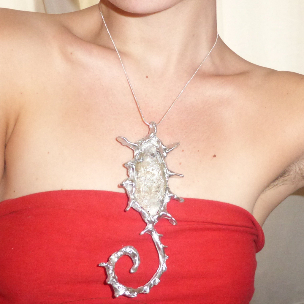 Anniken started making jewellery from stones and crystals in 2021. The materials were collected from when she travelled in a van through Europe. A casual interest in metals and minerals was the impetus for the jewellery making. Casting organically came about through curiosity, trial, and error. Local clay was used, excavated from the local forest, recycled tin from various recycling stores in Norway, and natural objects from multiple areas, for example; pyrite from the fjords of Sogn, druses from the Dolomites in Italy, crystals from Switzerland or quartz from Østmarka in Oslo.