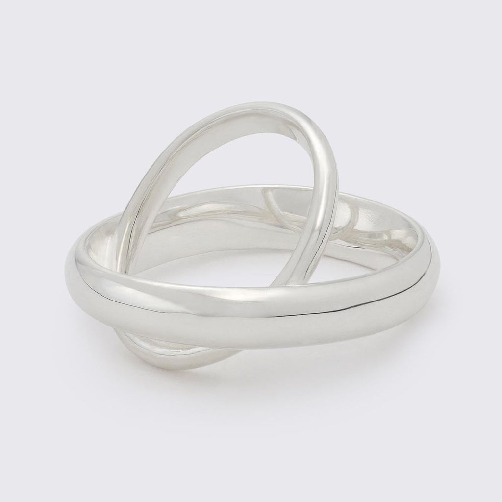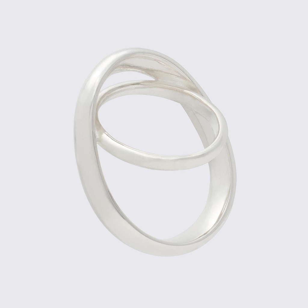 JUSTUS our layered ring, orbiting the finger. Two rings sit on an axis for a dynamic and elliptical interplay. We suggest wearing on one of the outer fingers (index or pinky).