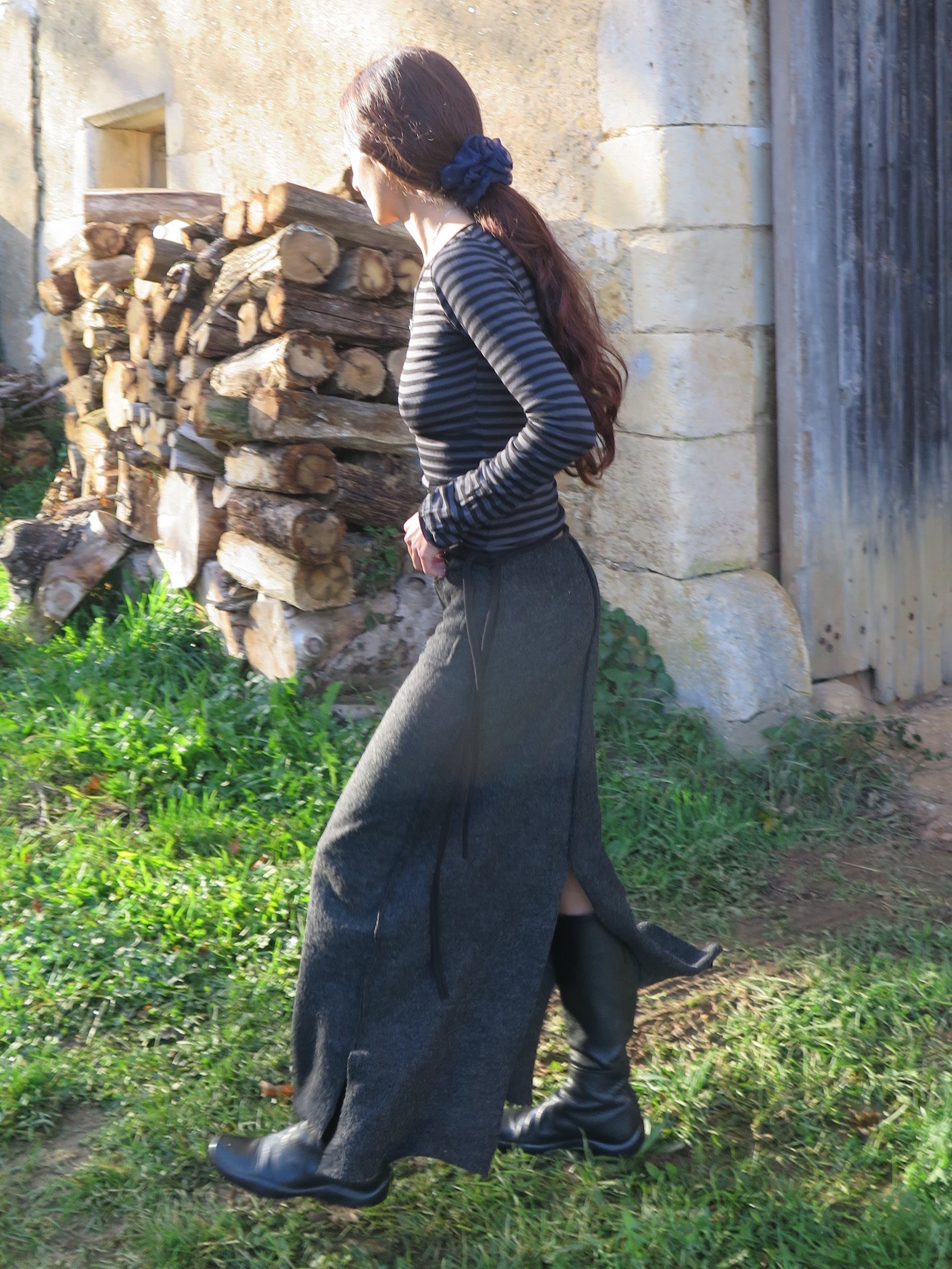 Grey skirt with two front pockets. Long slot in the back and small slots front and sides with raw edges. Elastic band at the waist .