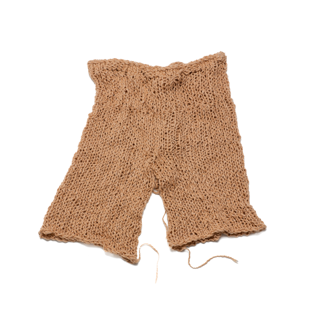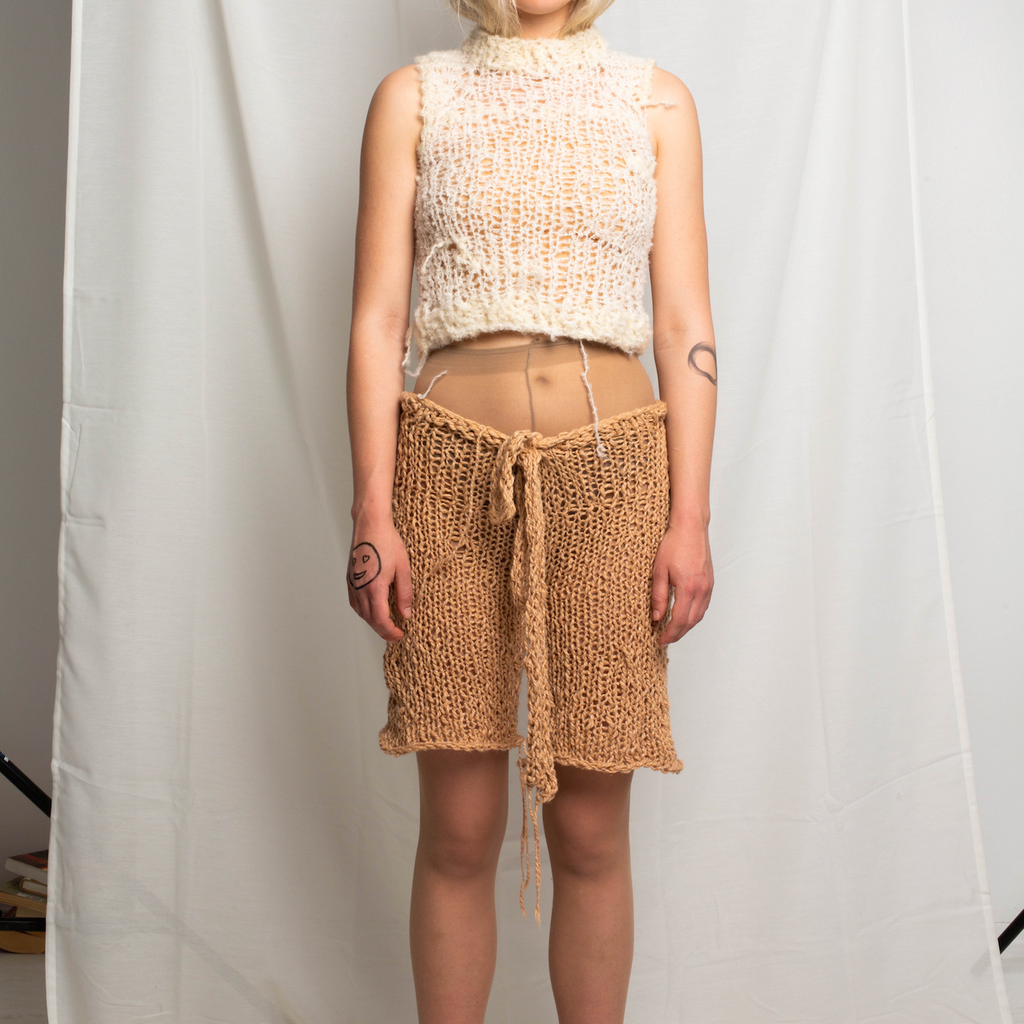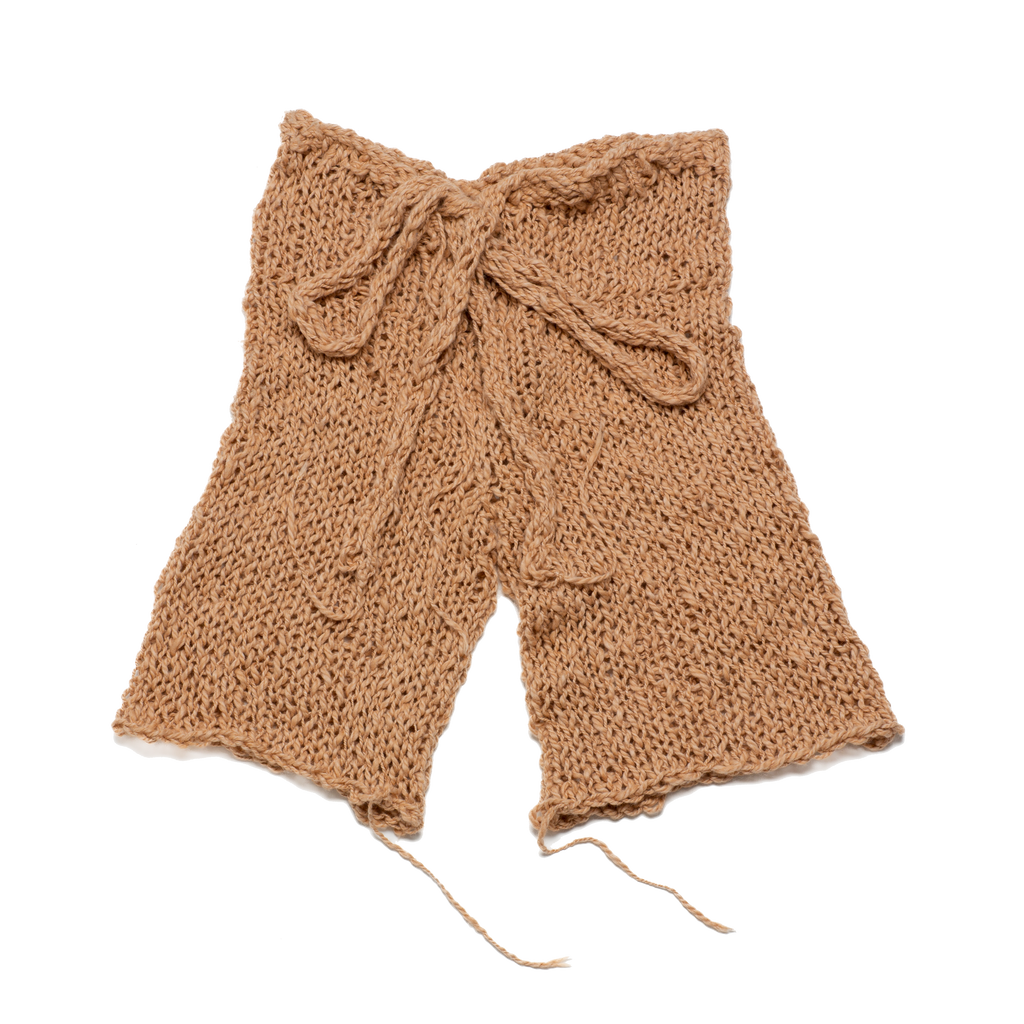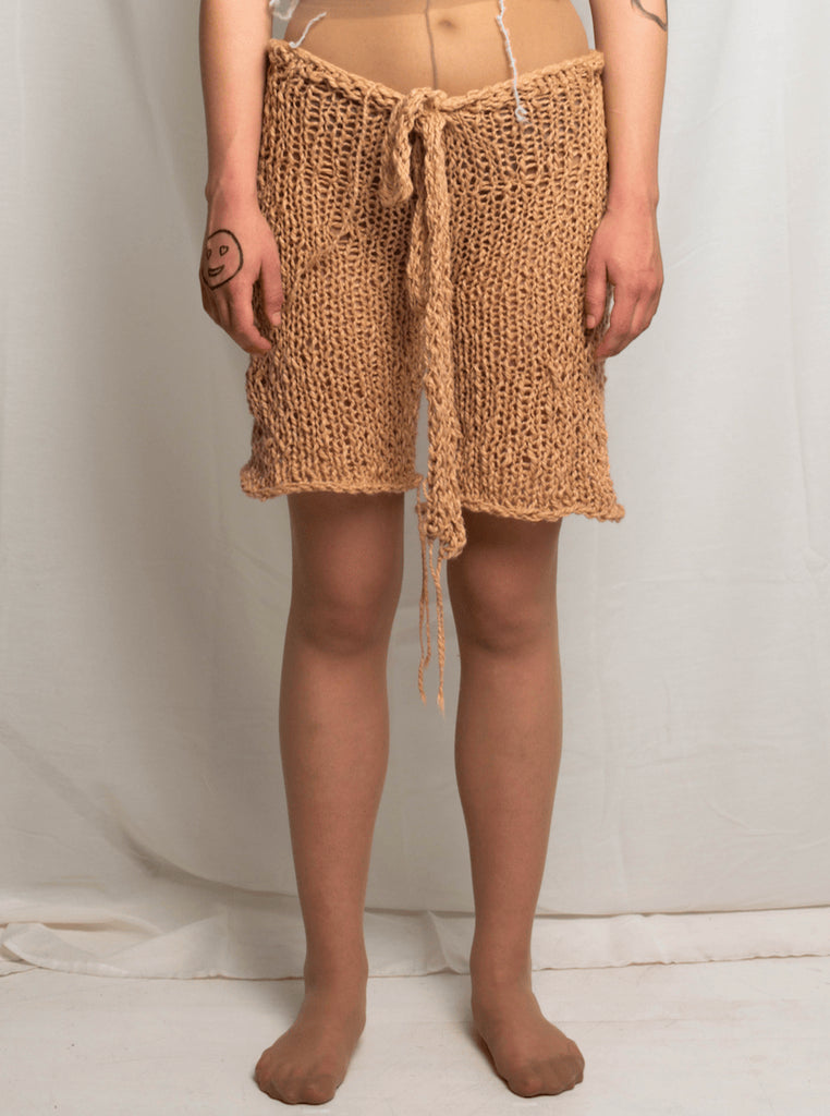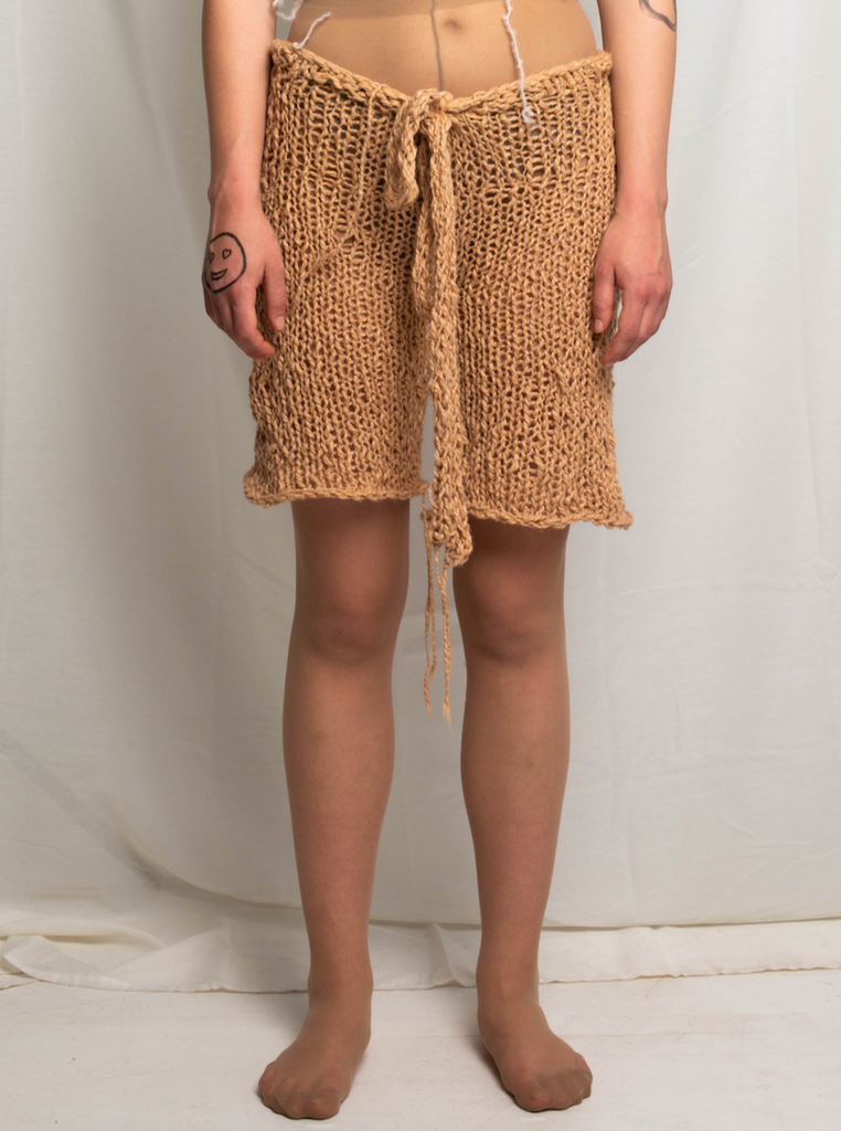 Knit Cotton ShortsHand knit loose shorts with a low rise fit and tie waist.