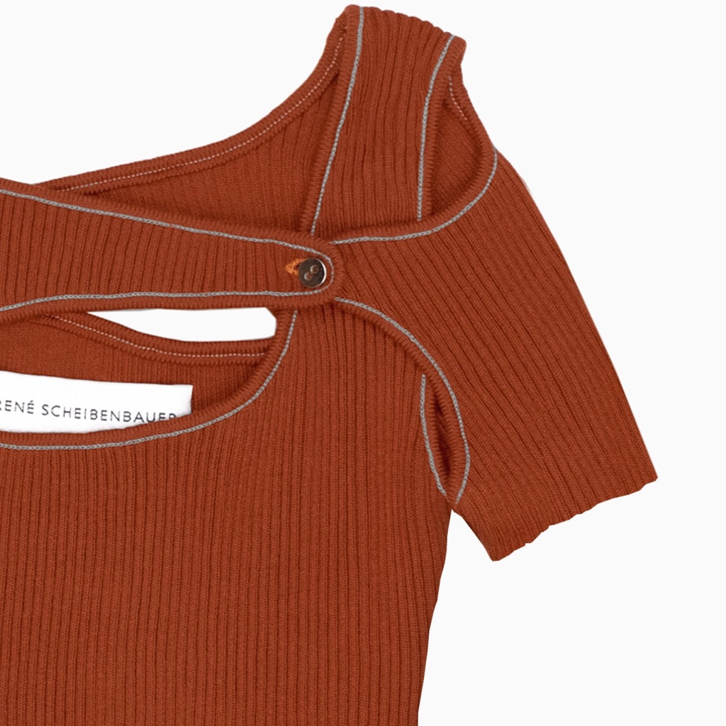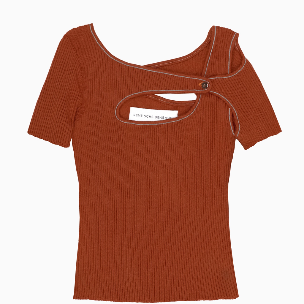 Fully fashioned ribbed knit top made from GOTS certified organic cotton with contrast trim linking detail.