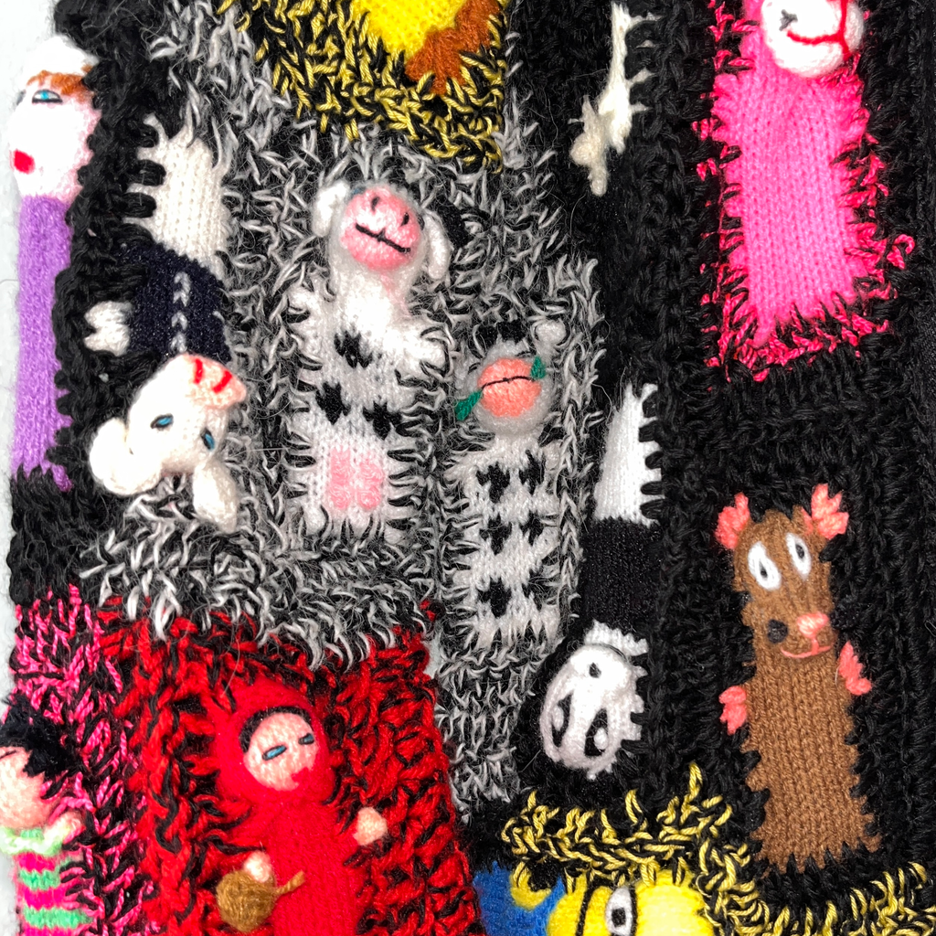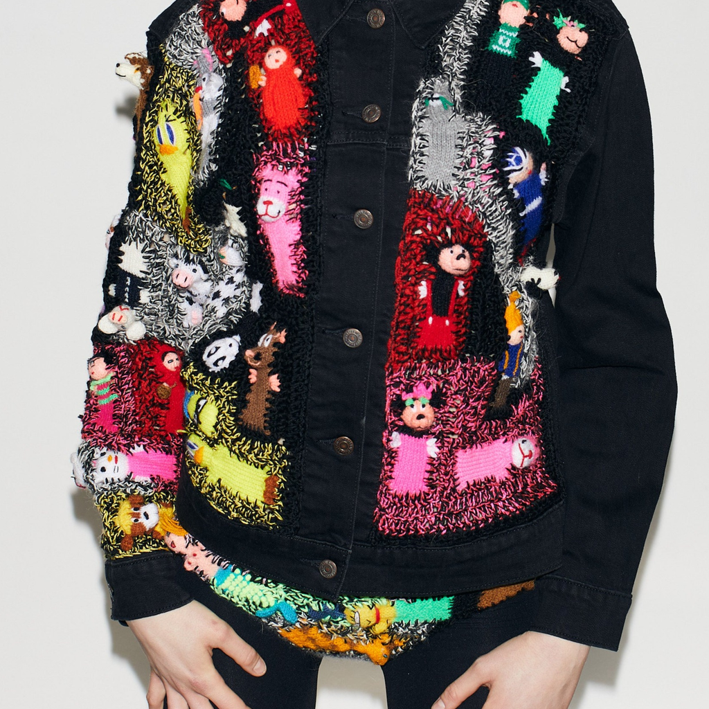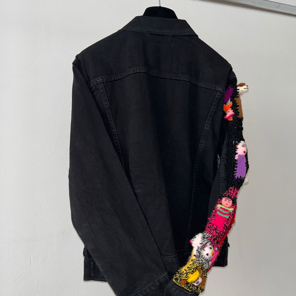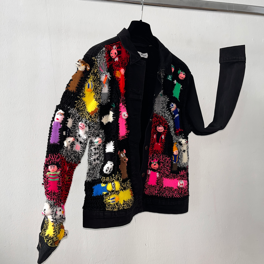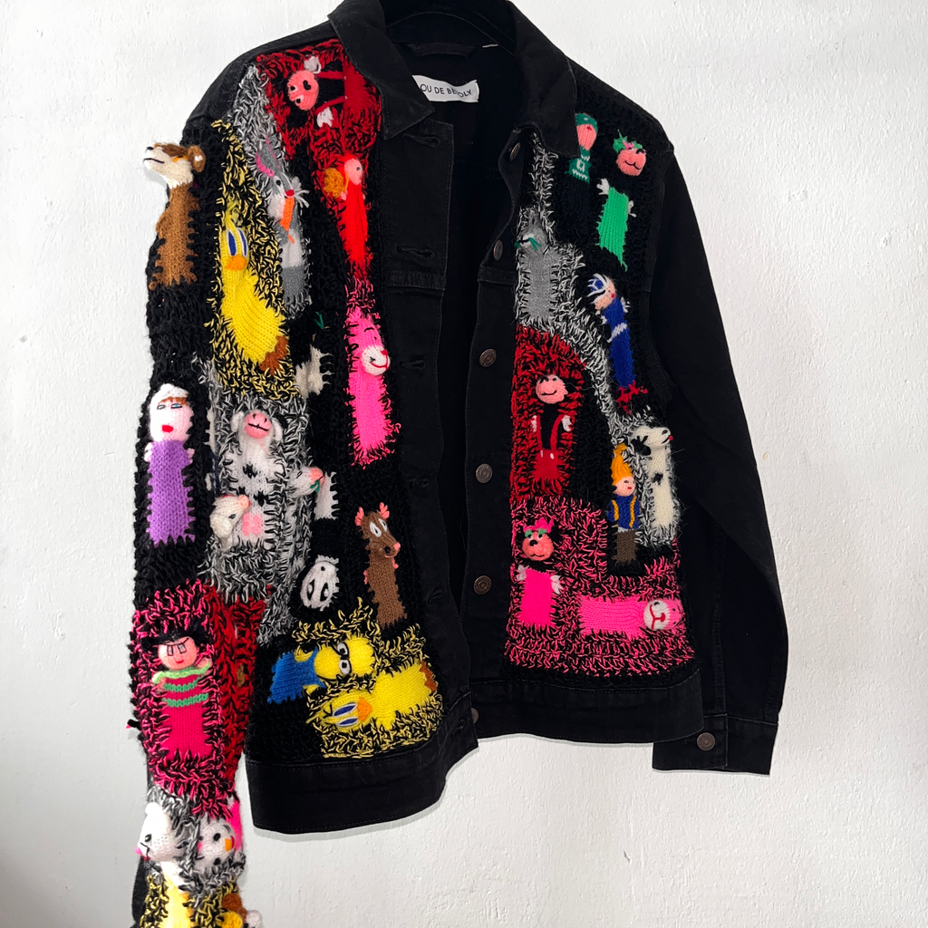 Knitted and crocheted dolls Denim jacket by Lou de Bètoly. With knitted front and right arm.