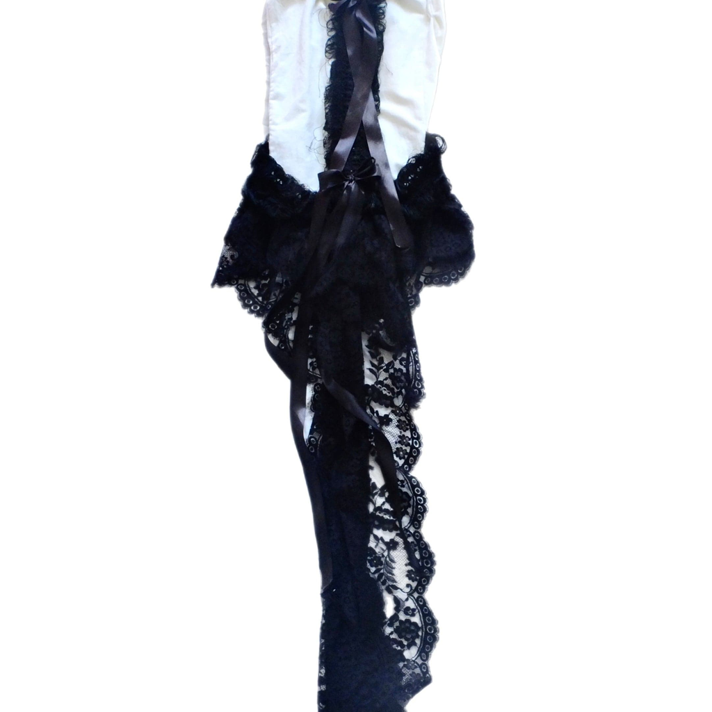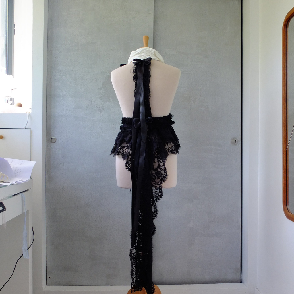 Velvet draped vest from the Opera collection with a train made of vintage lace and metallic closure detail.