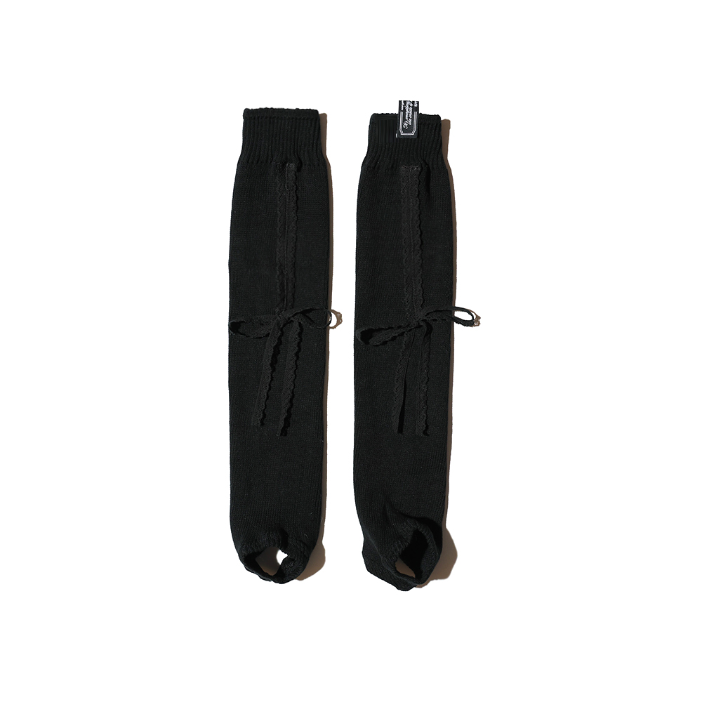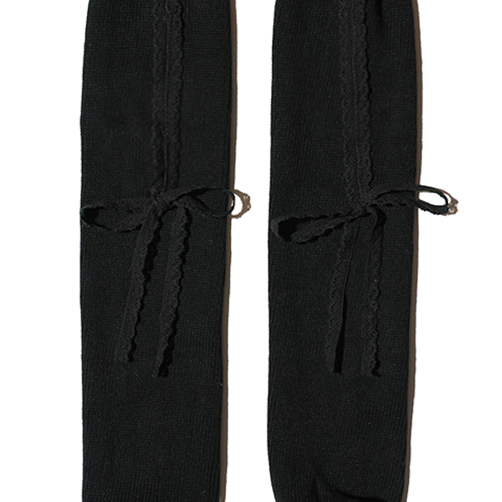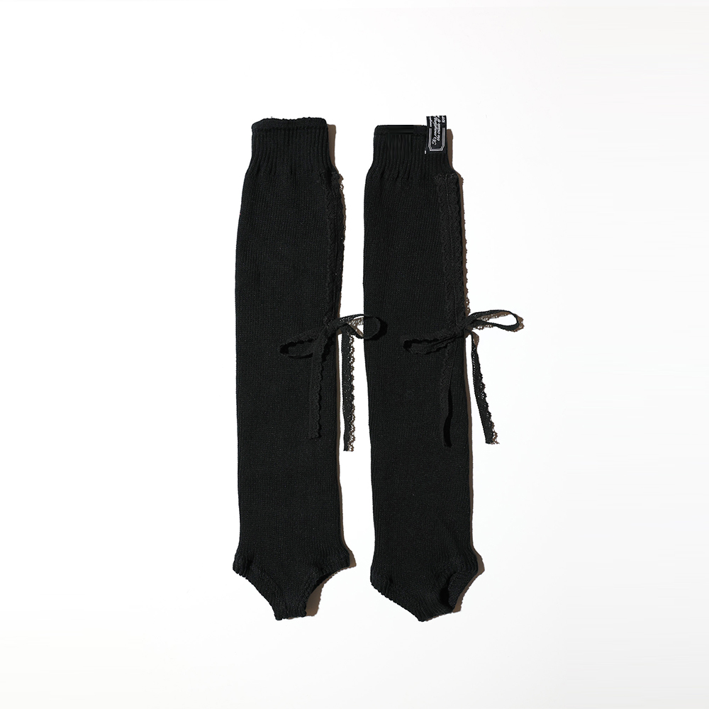 Lace ribbon leg warmers by SAENGIN STUDIOS.