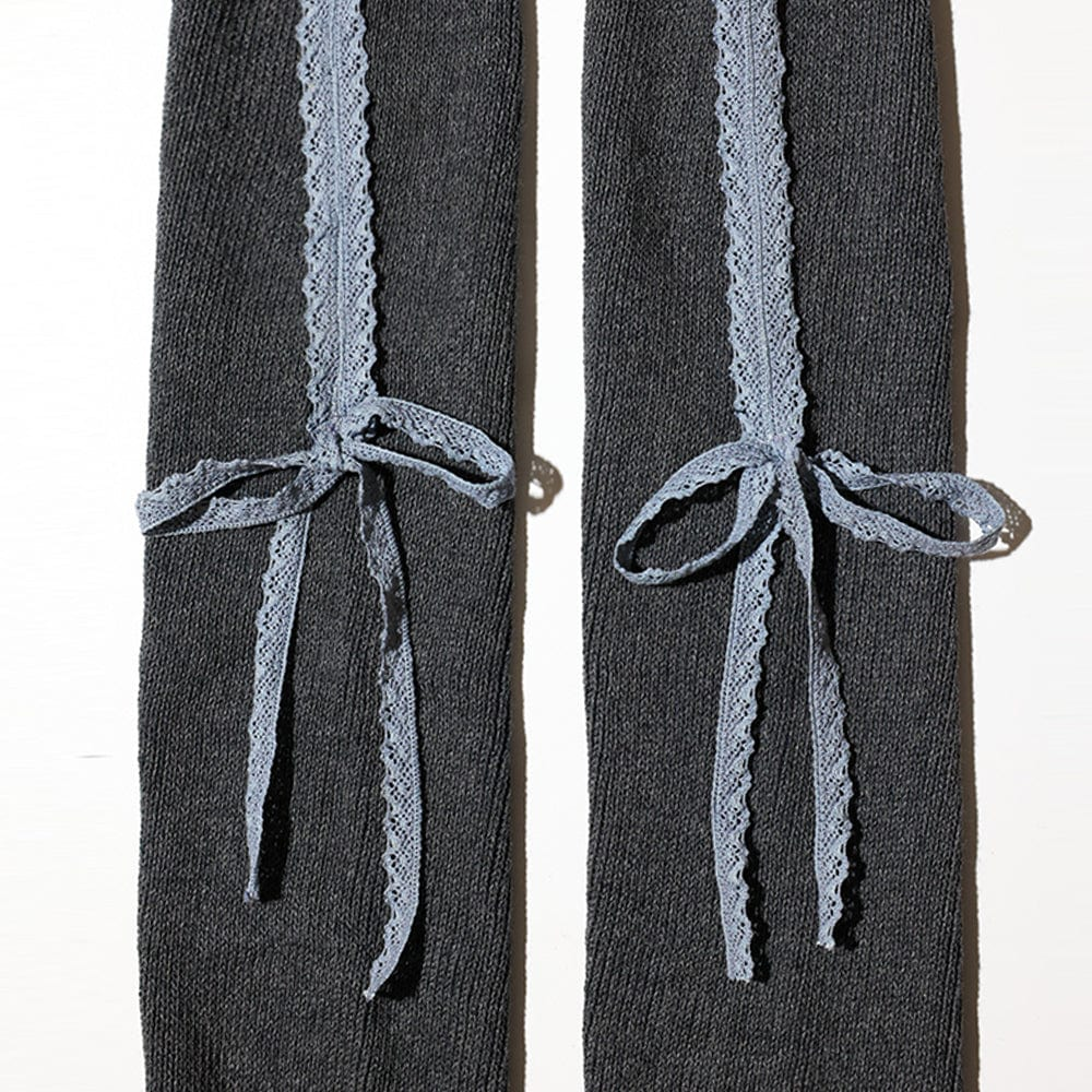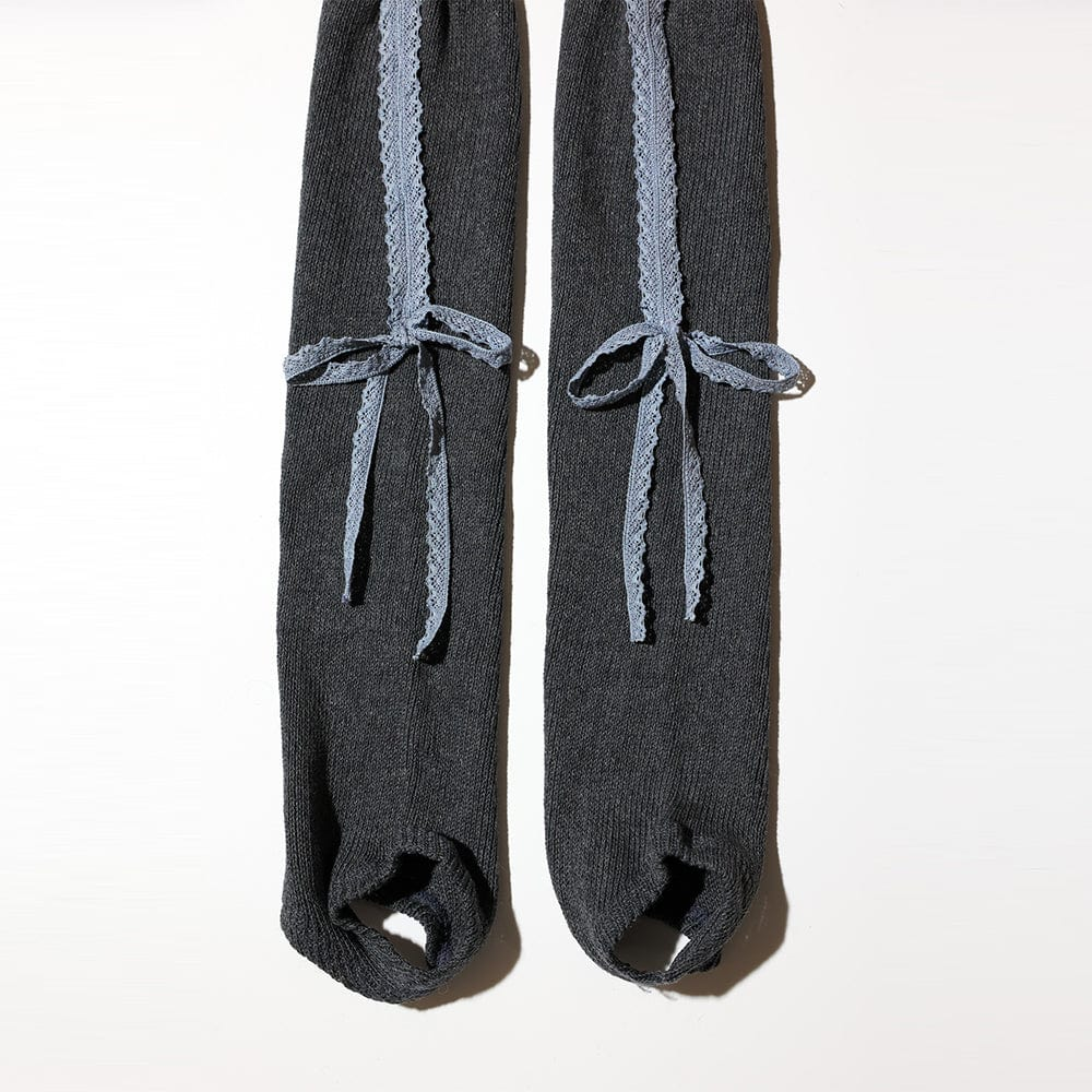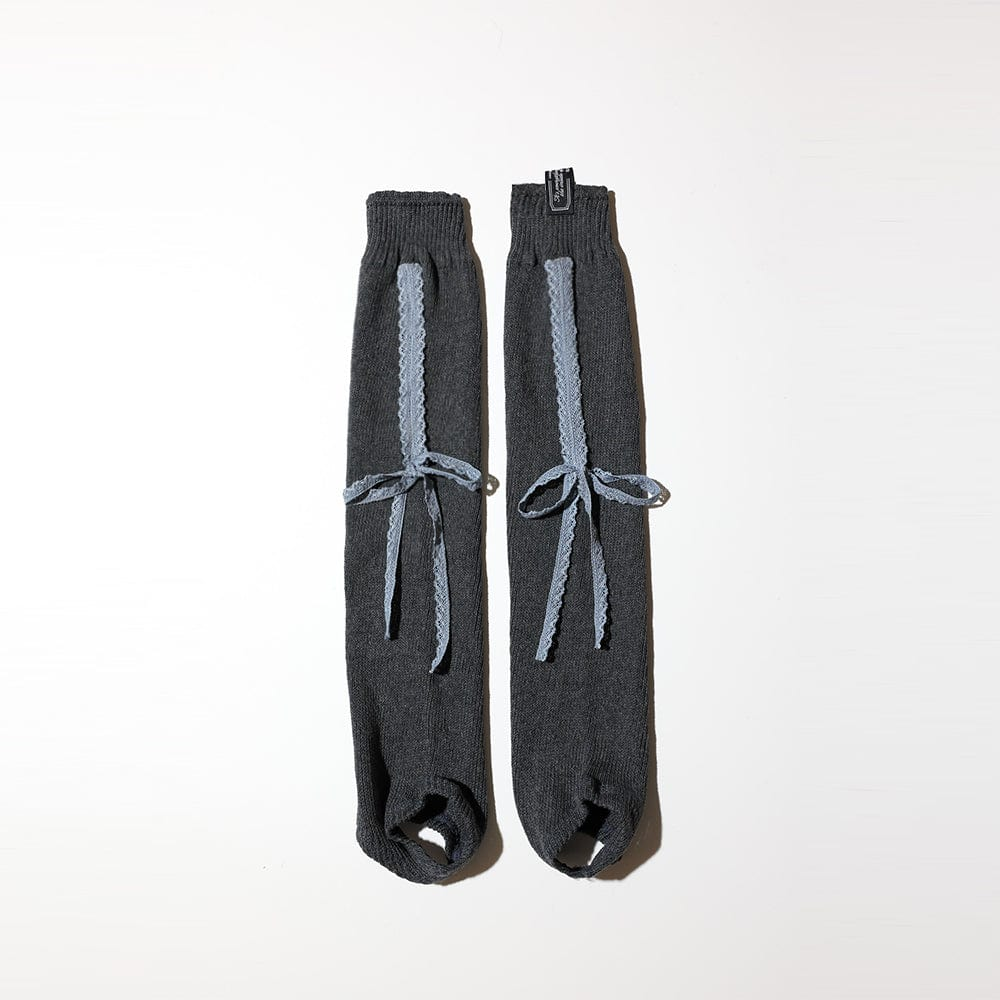 Lace ribbon leg warmers by SAENGIN STUDIOS.
