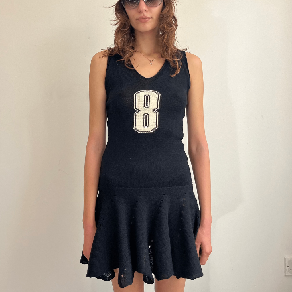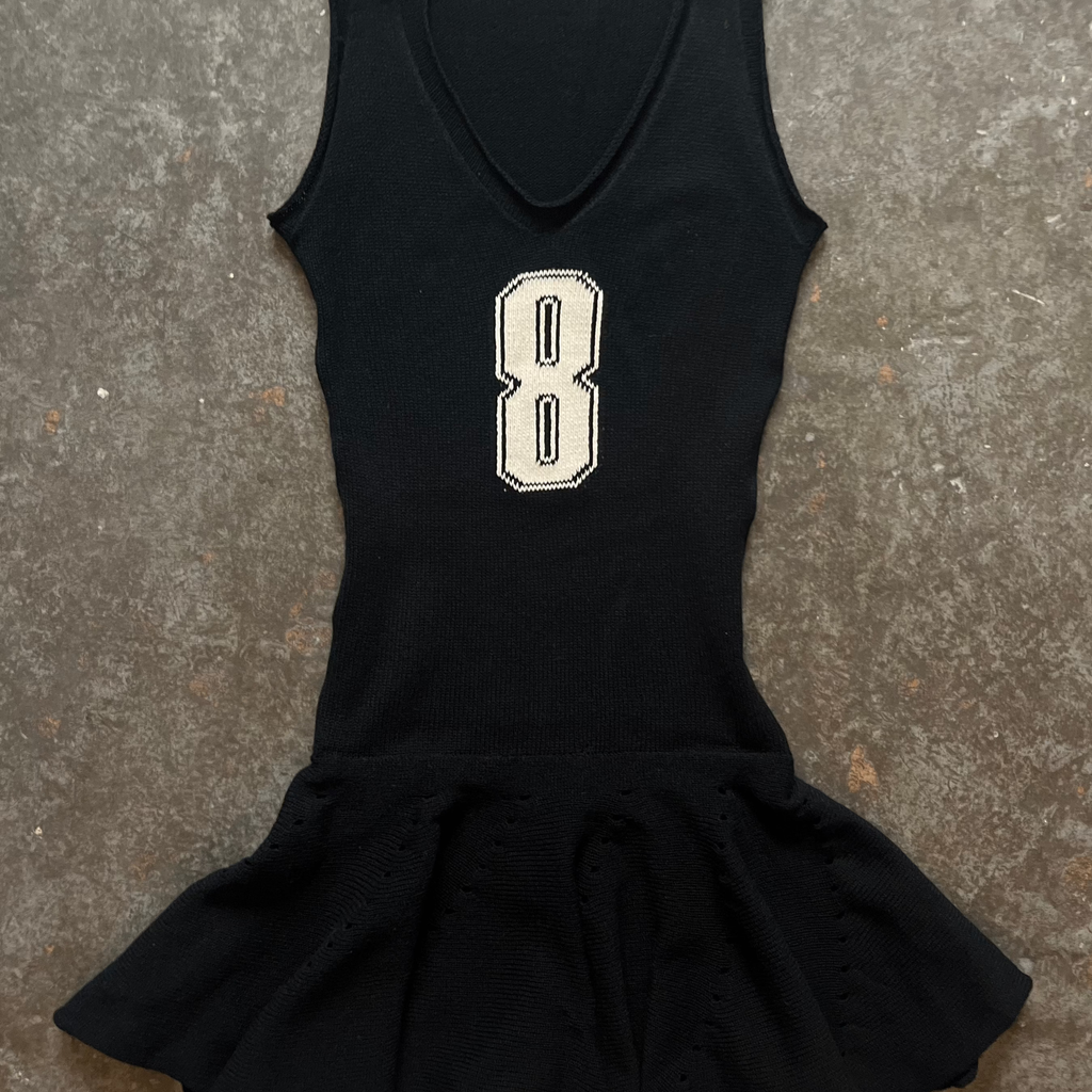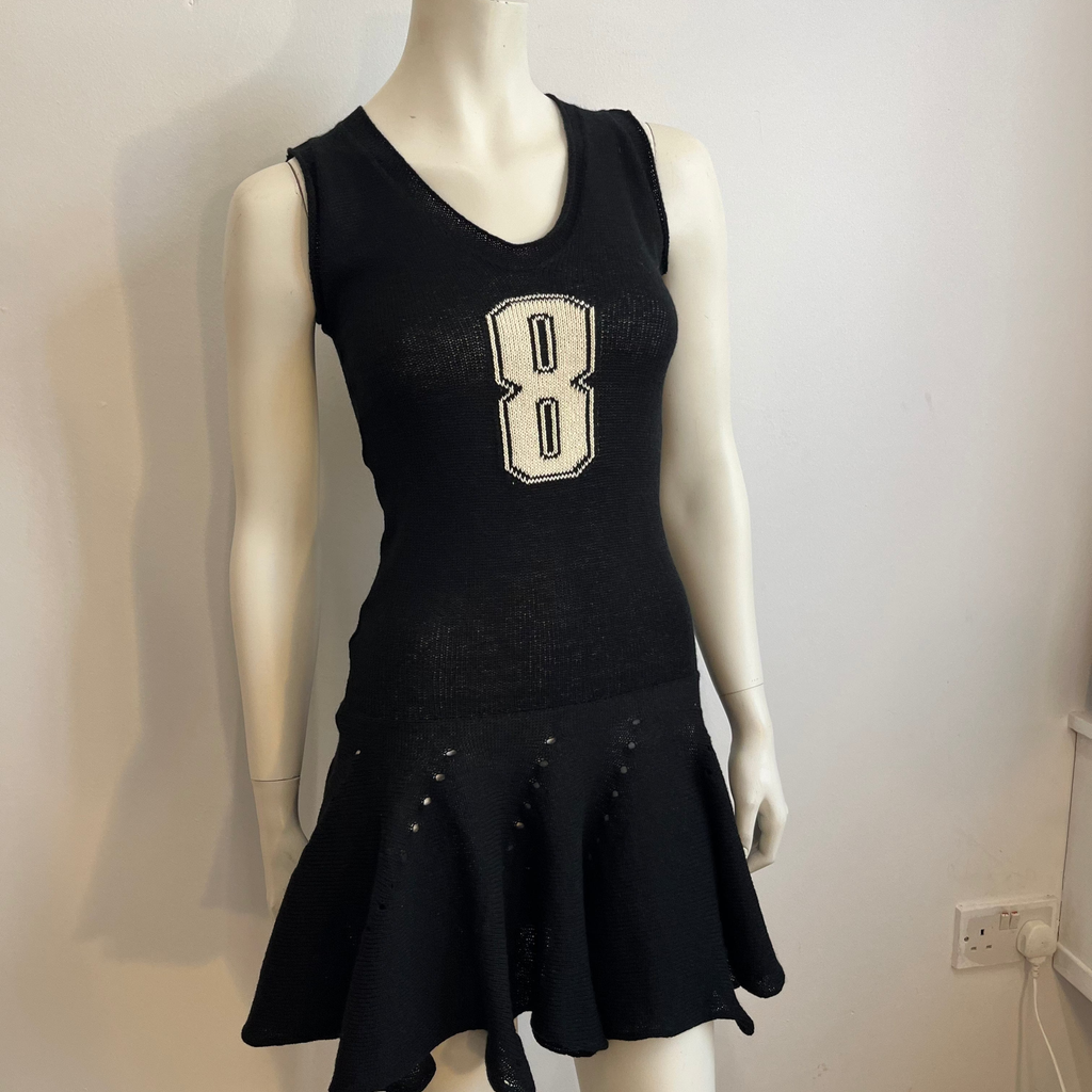 The lambswool mini dress by Lilies of the Valley features a drop waist, ruffle skirt and number graphic.Size S, this item is stretchy.This piece was handmade in London with minimal waste.
