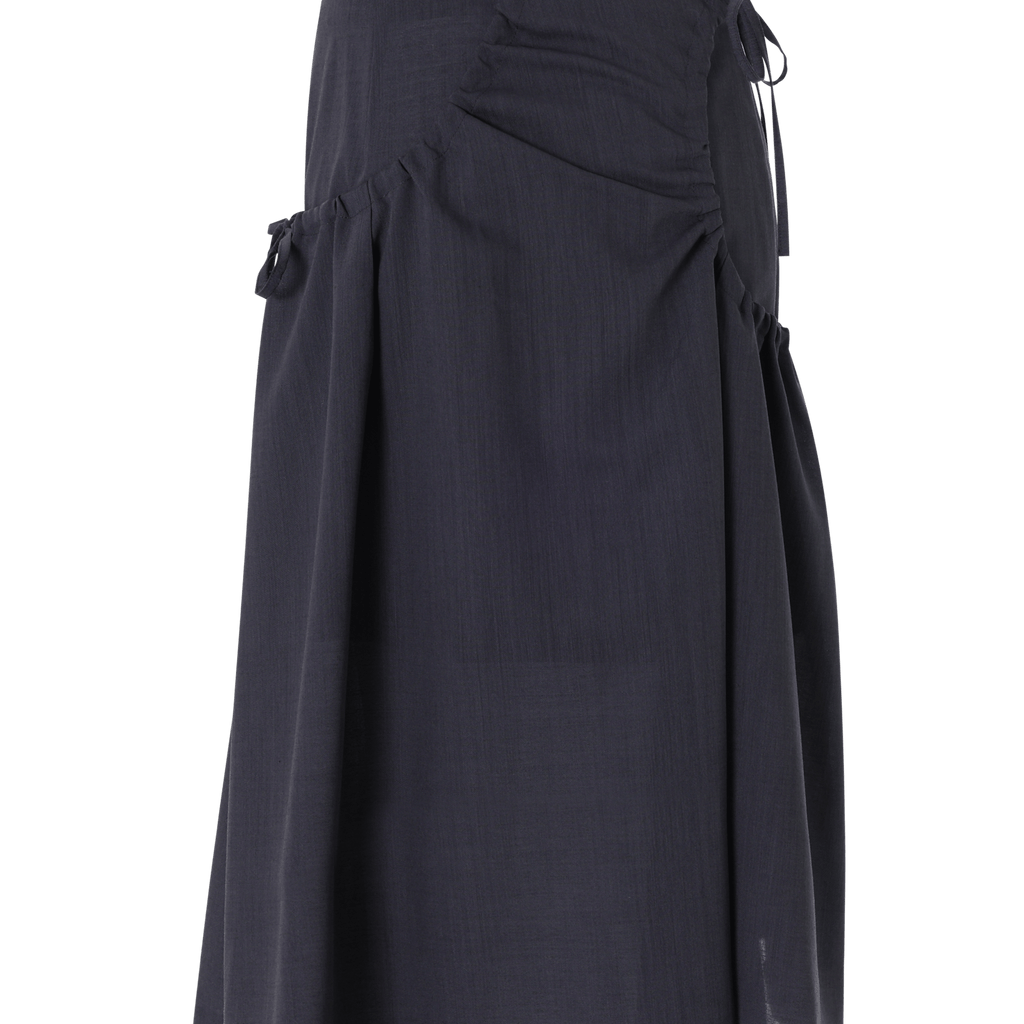 This is a skirt inspired by the top of the Teshima building. It's made of soft summer wool material. It incorporates side shirring, allowing for various styling options.