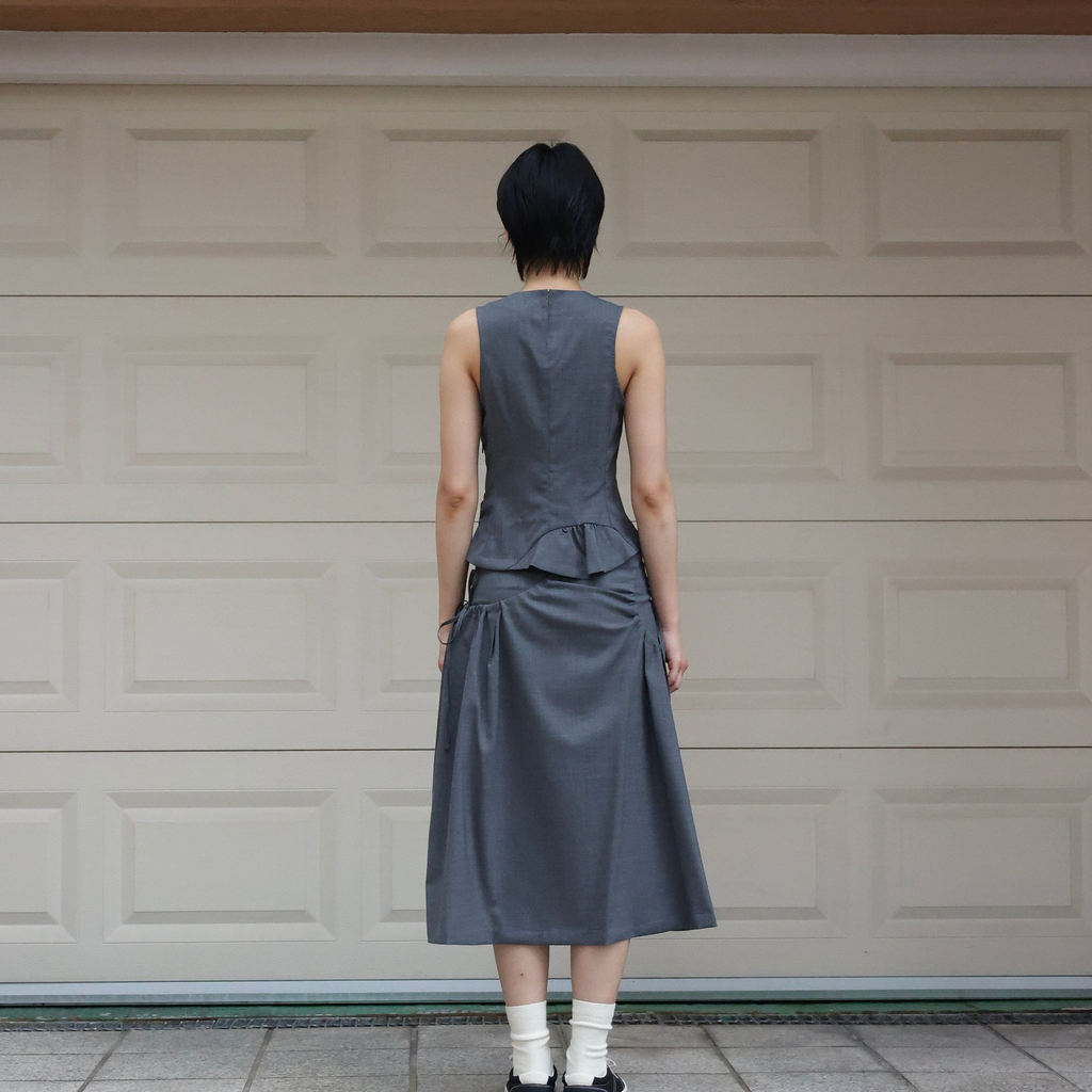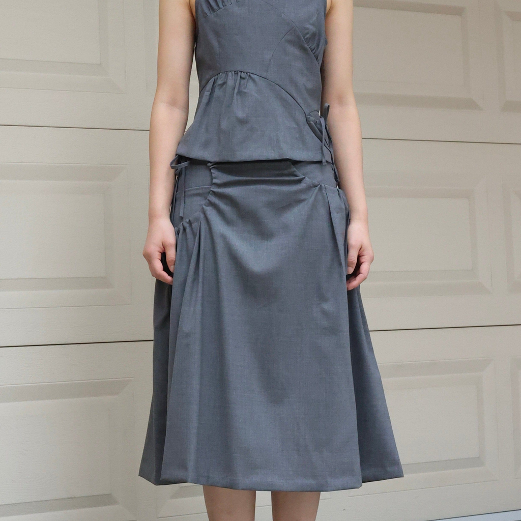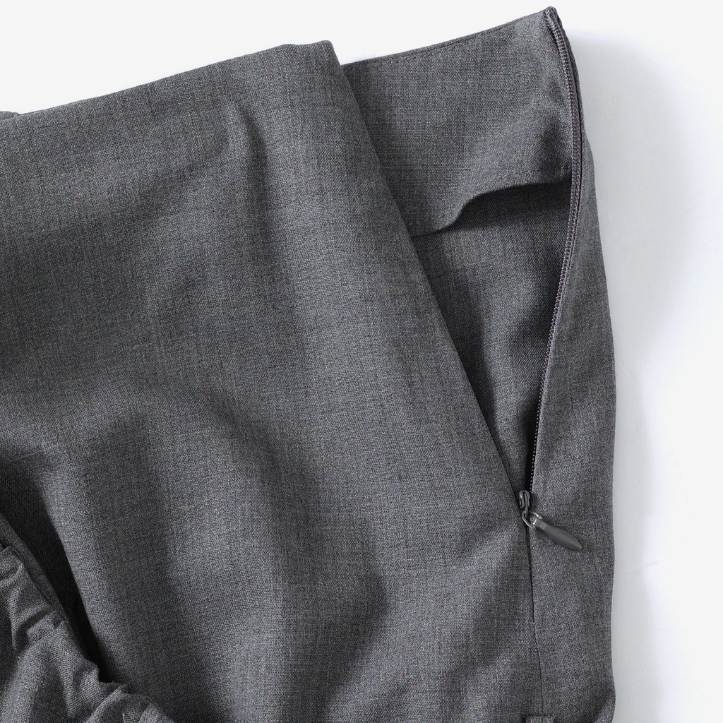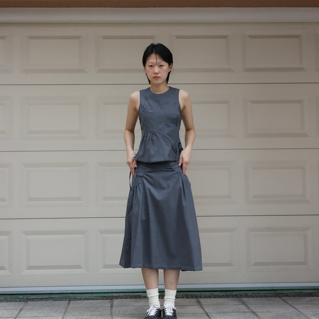 This is a skirt inspired by the top of the Teshima building. It's made of soft summer wool material. It incorporates side shirring, allowing for various styling options.