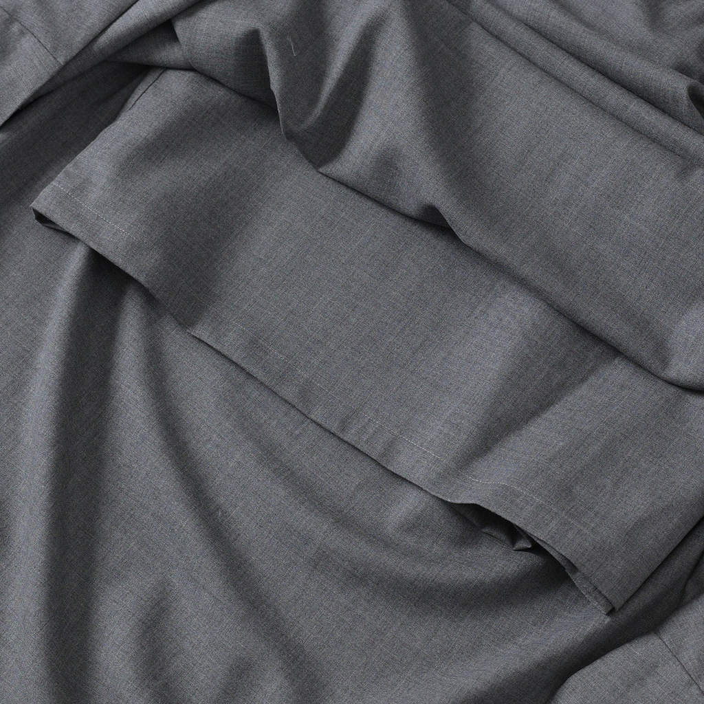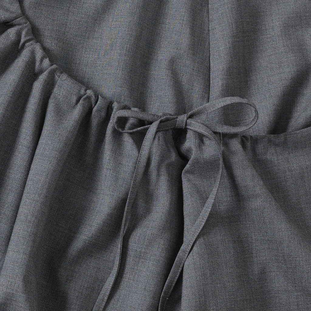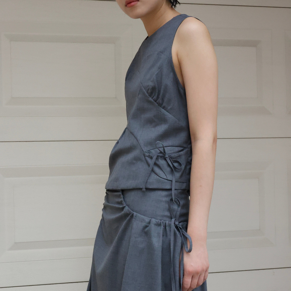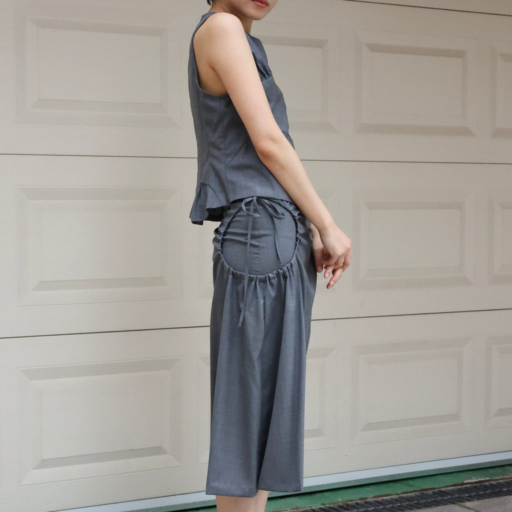 This is a skirt inspired by the top of the Teshima building. It's made of soft summer wool material. It incorporates side shirring, allowing for various styling options.