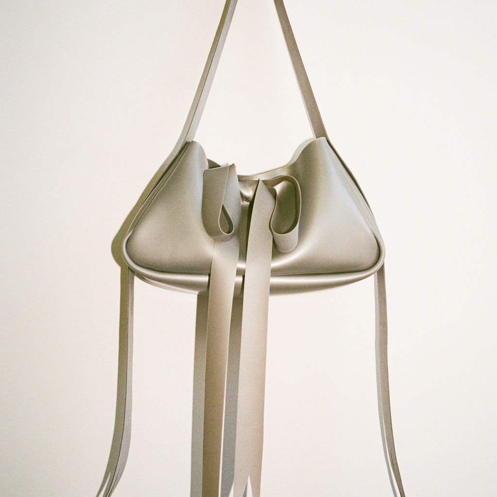 Handcrafted latex handbag made from thick rubber with snap fastening, metal rivets and bow detail at the front.