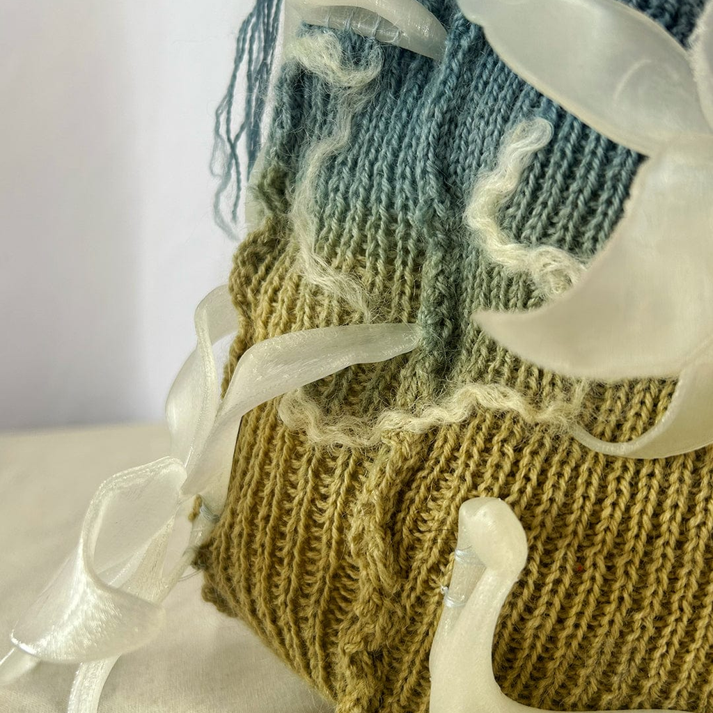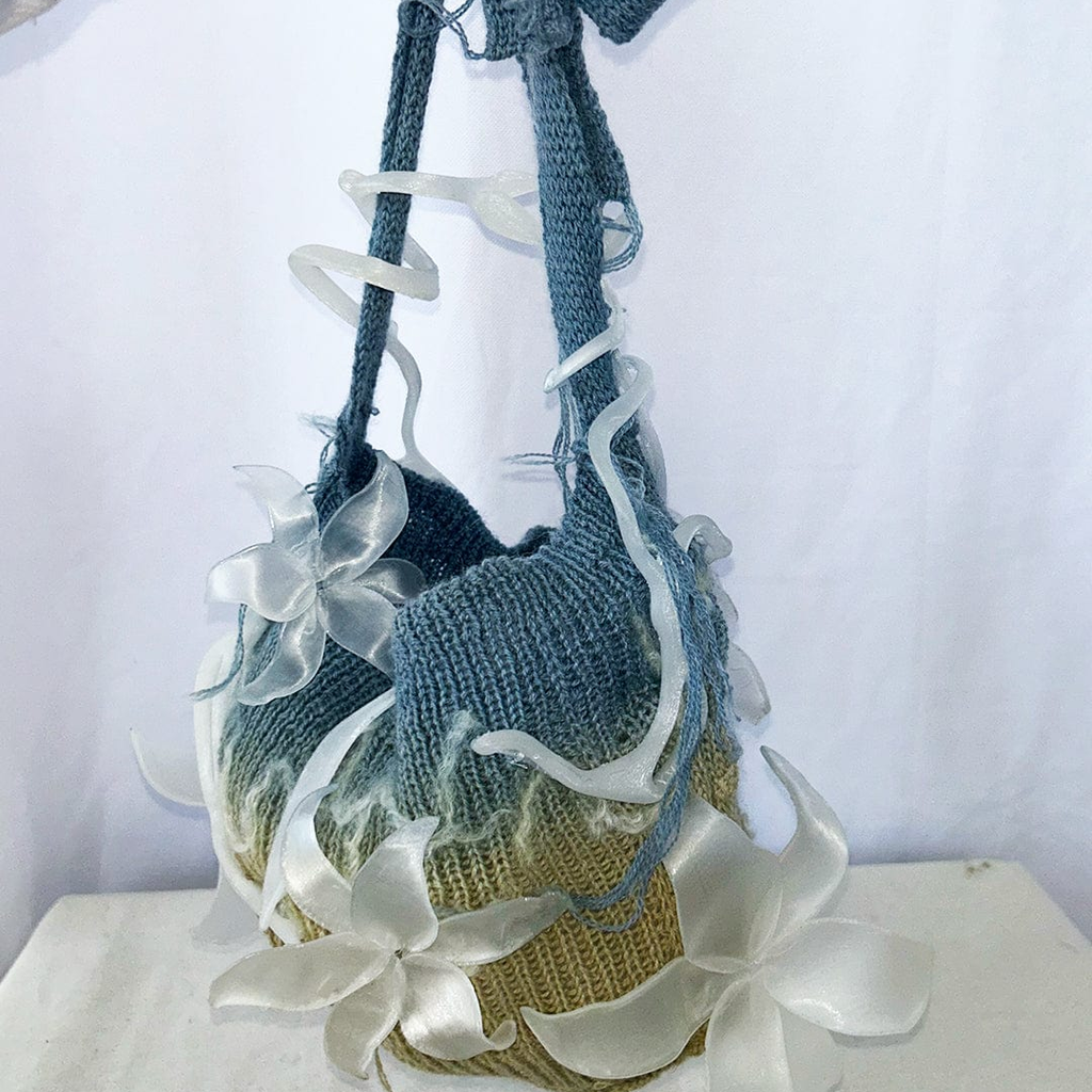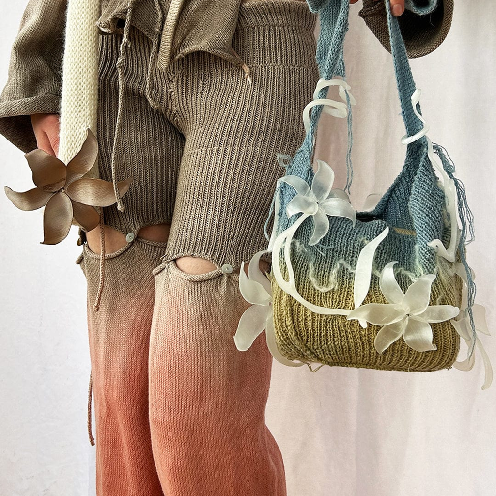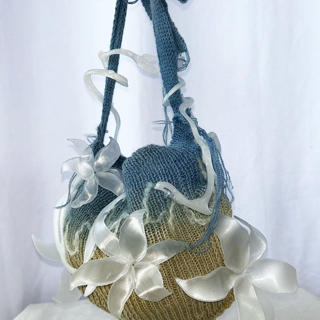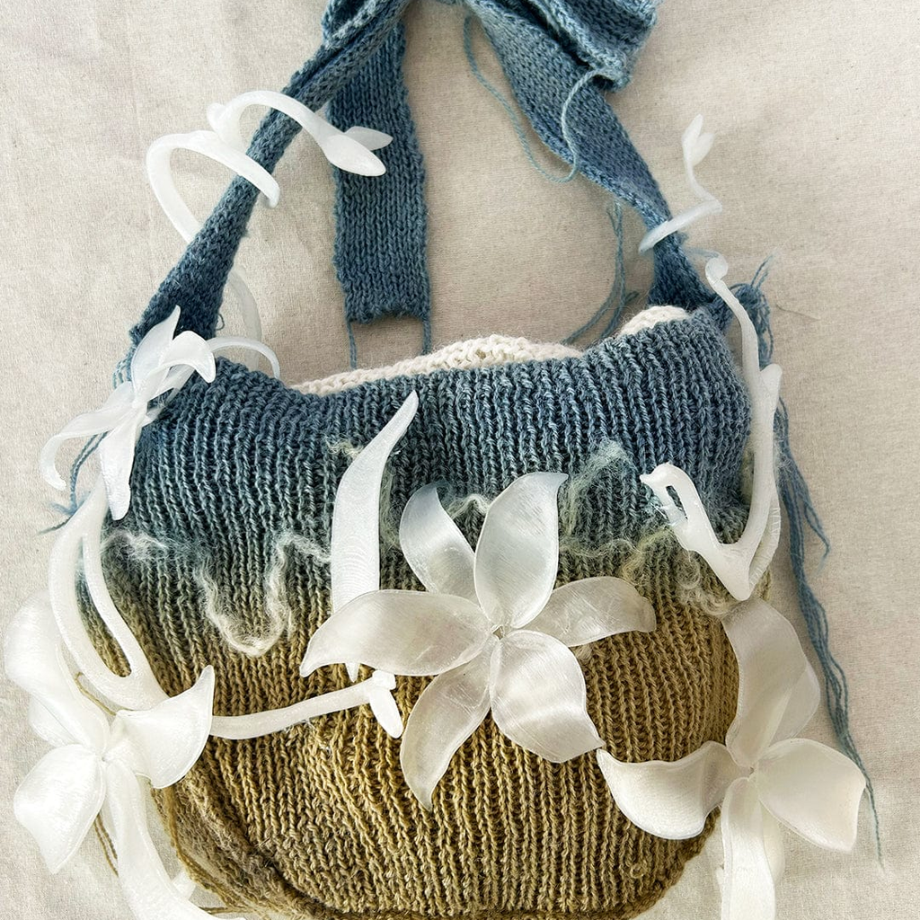 This Laurel Cluster Shoulder Bag is knit with 100% wool yarn from Springvale, Maine, 100% Wensleydale Lamb yarn from Burdett, New York, and naturally dyed with Indigo sourced locally in NYC. The surface is finished with embellishments that are 3D printed in Los Angeles, CA, with biodegradable PLA made from sugarcane and cornstarch.