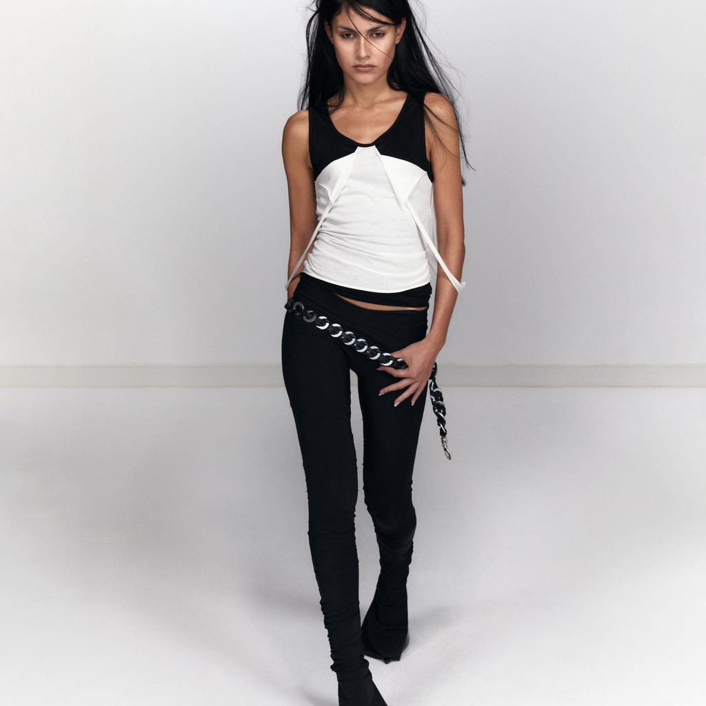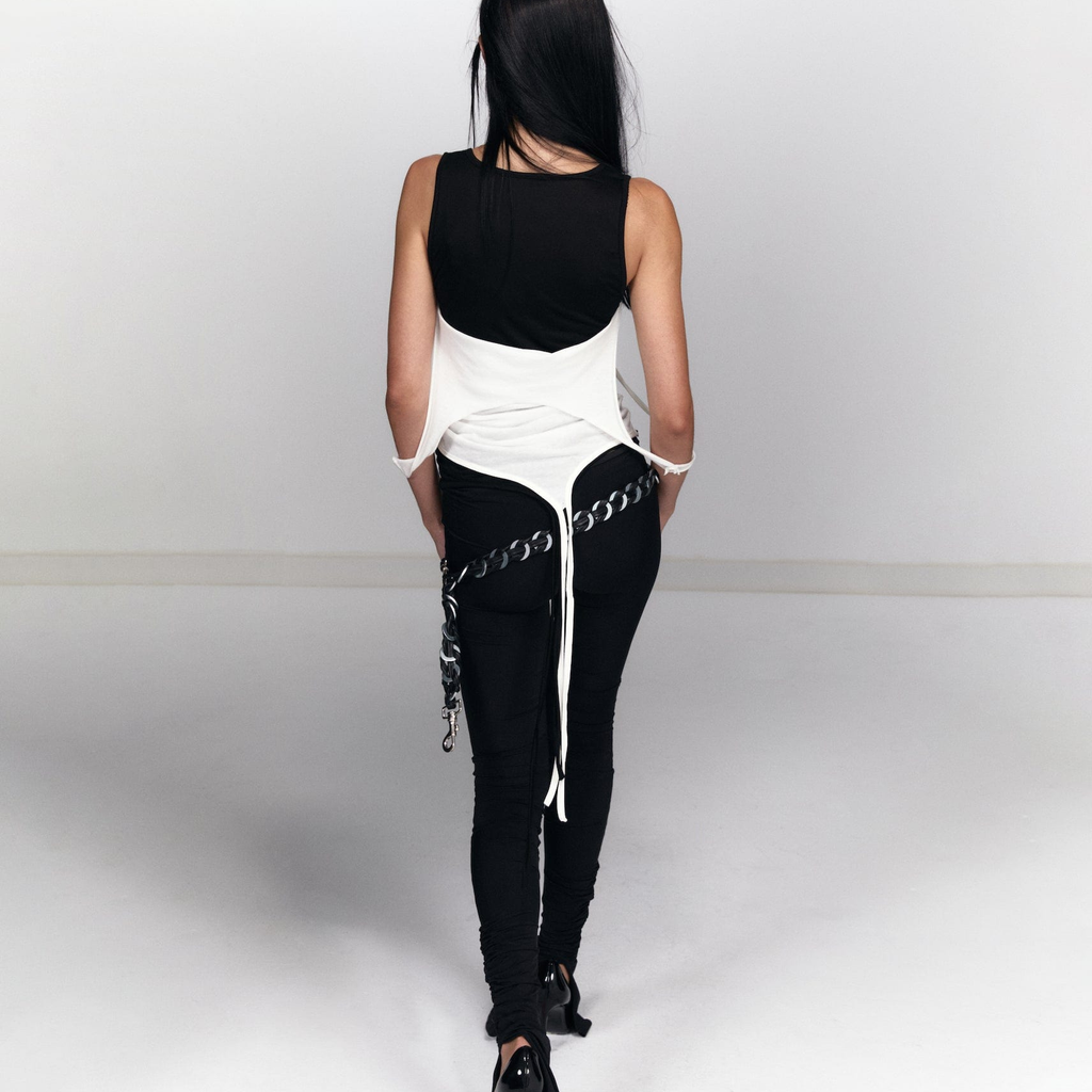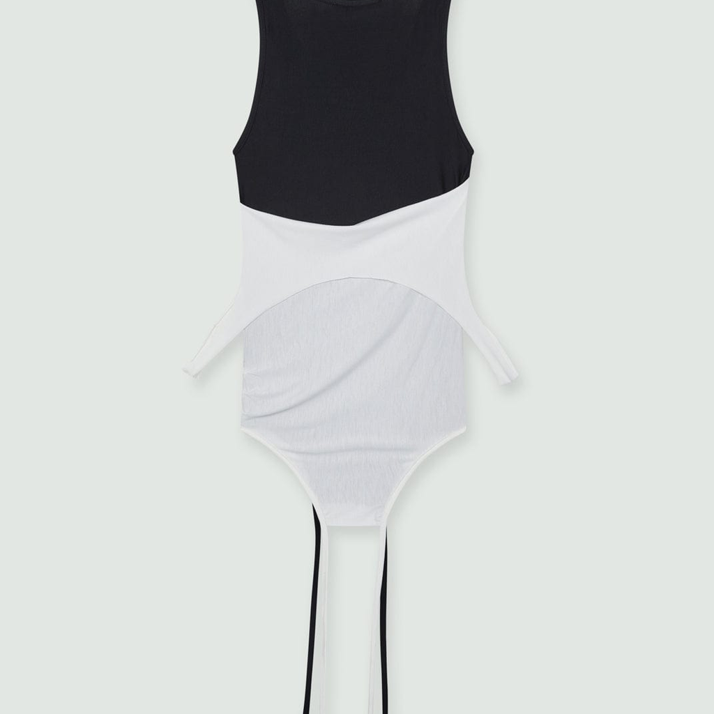 Black and white viscose cotton tank top. Double layer effect with a light elastic fabric. Slim fit with central back hanging cords.