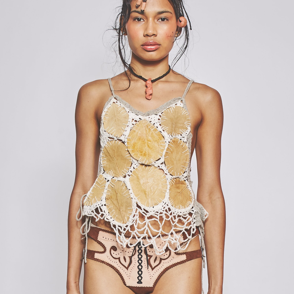 Patchwork crochet top with natural Cerrado leaves and recycled cotton.