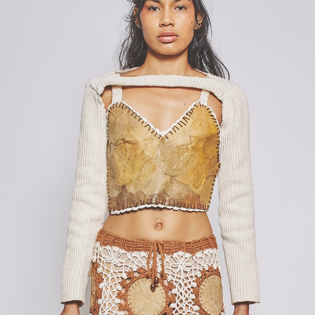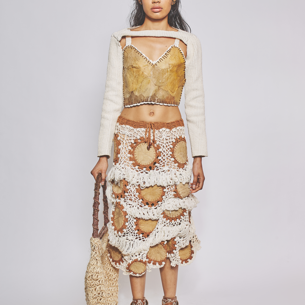 Handmade crochet tank top with natural Cerrado leaves and organic cotton.