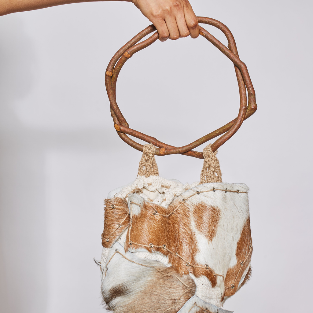 Goatskin patchwork bag with recycled cotton inserts, cotton lining and vine handle.