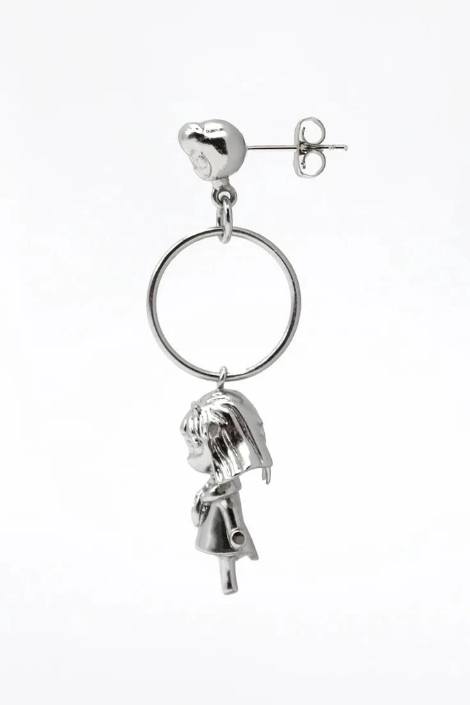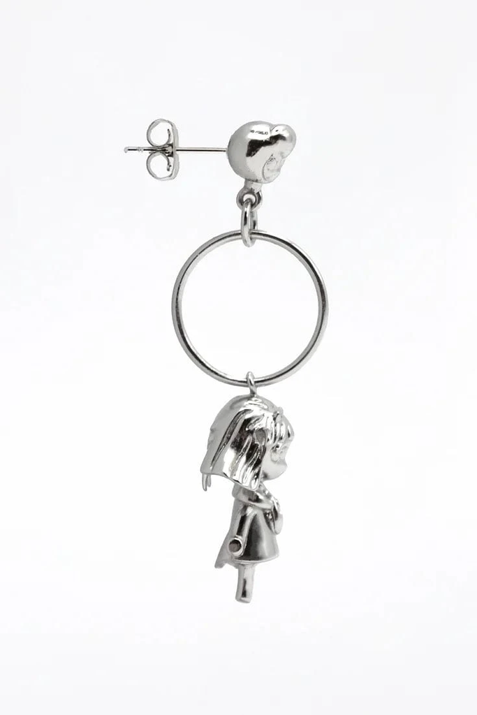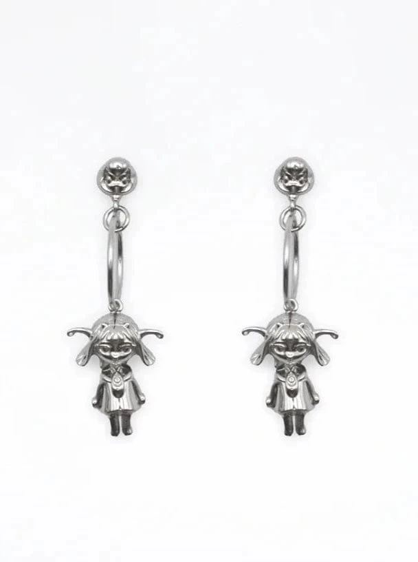 Pair of drop hoop earrings featuring signature Charm face at stud and Lil charm at drop.