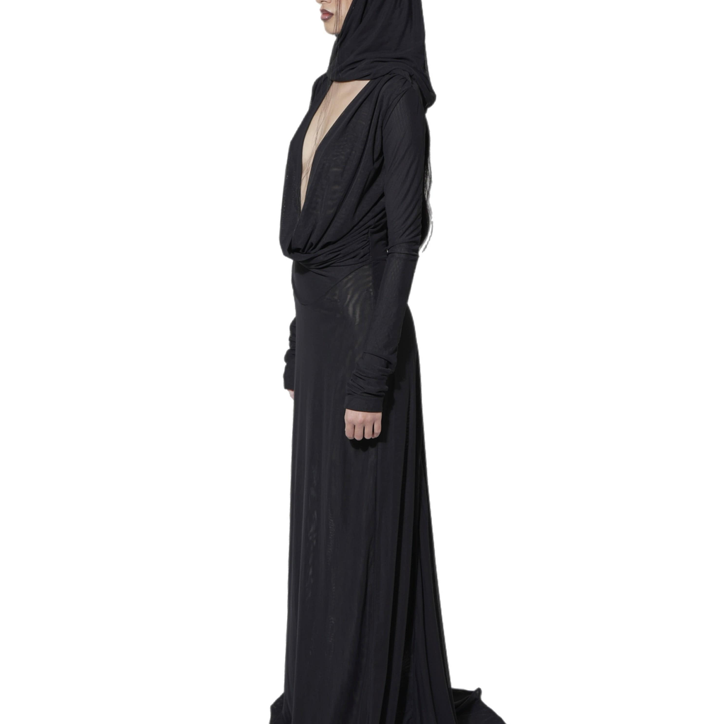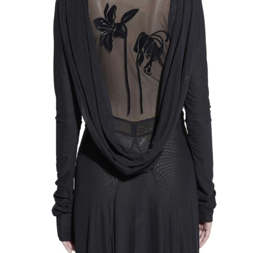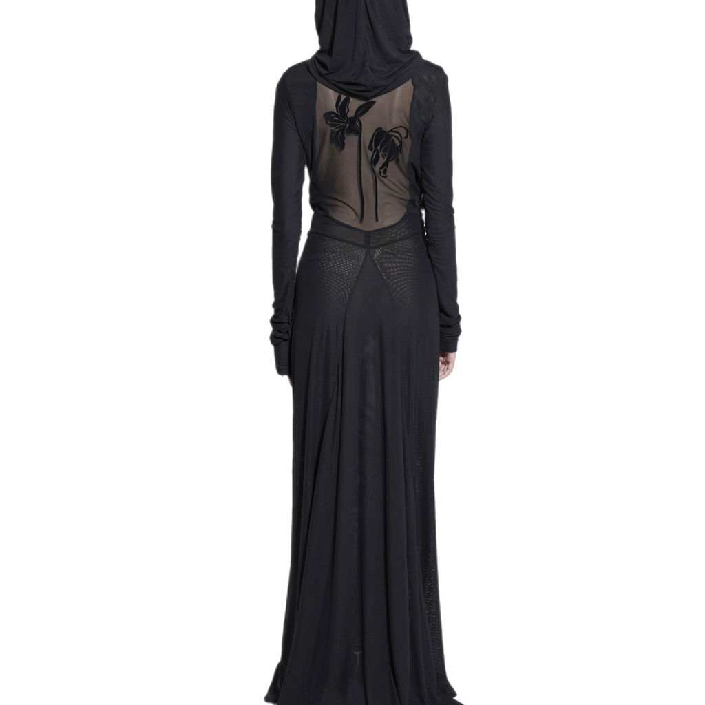 Mesh floor length dress, plunging neckline, bias cut skirt with train, longsleeve, adjustable hood, transparent back with flock applique.