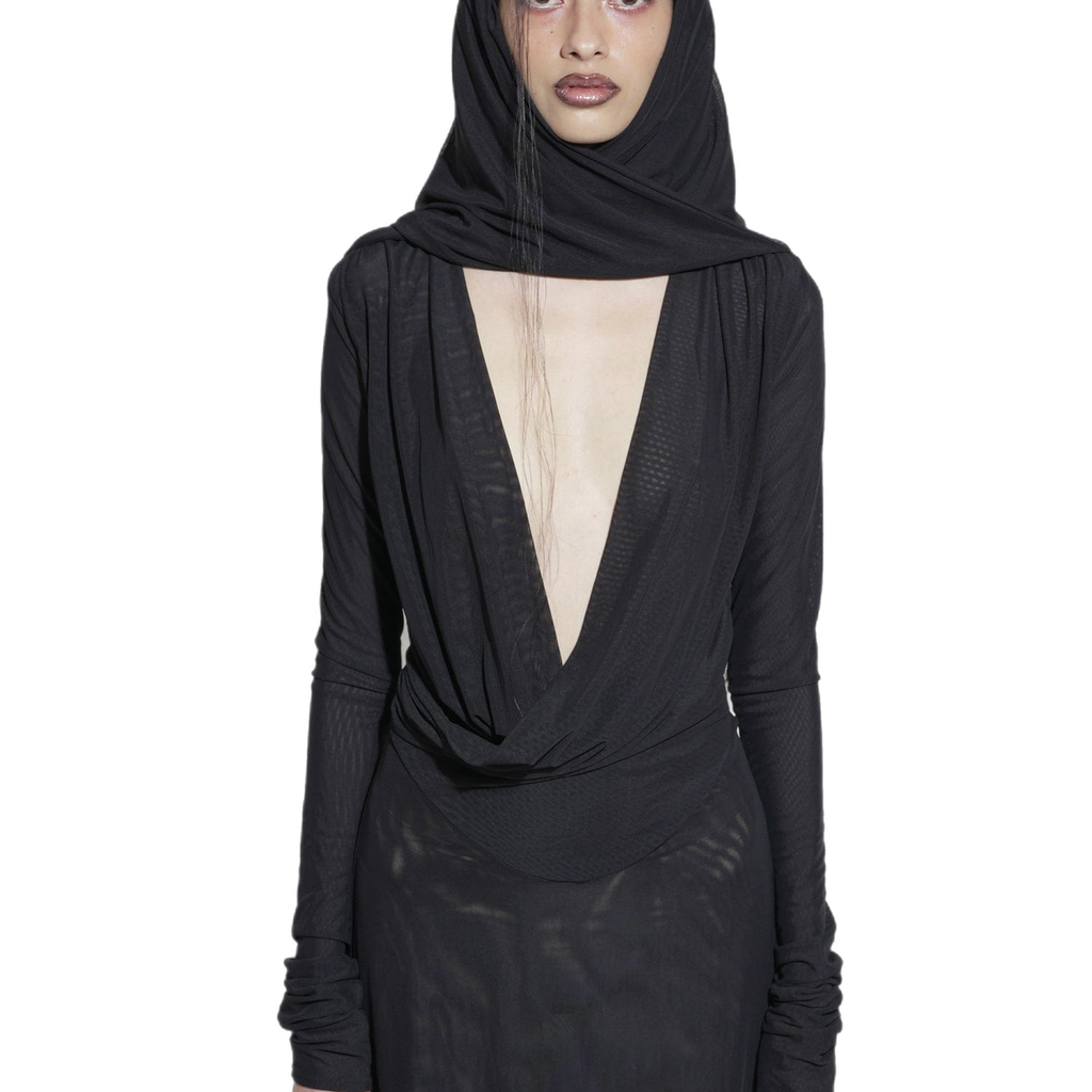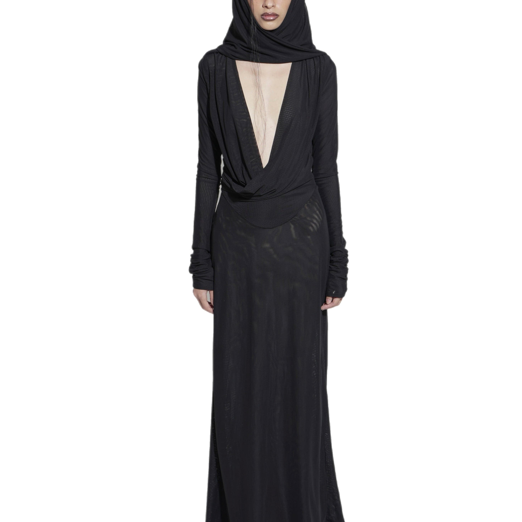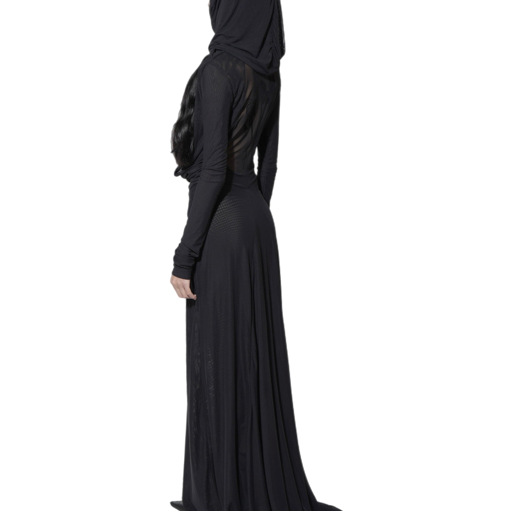 Mesh floor length dress, plunging neckline, bias cut skirt with train, longsleeve, adjustable hood, transparent back with flock applique.