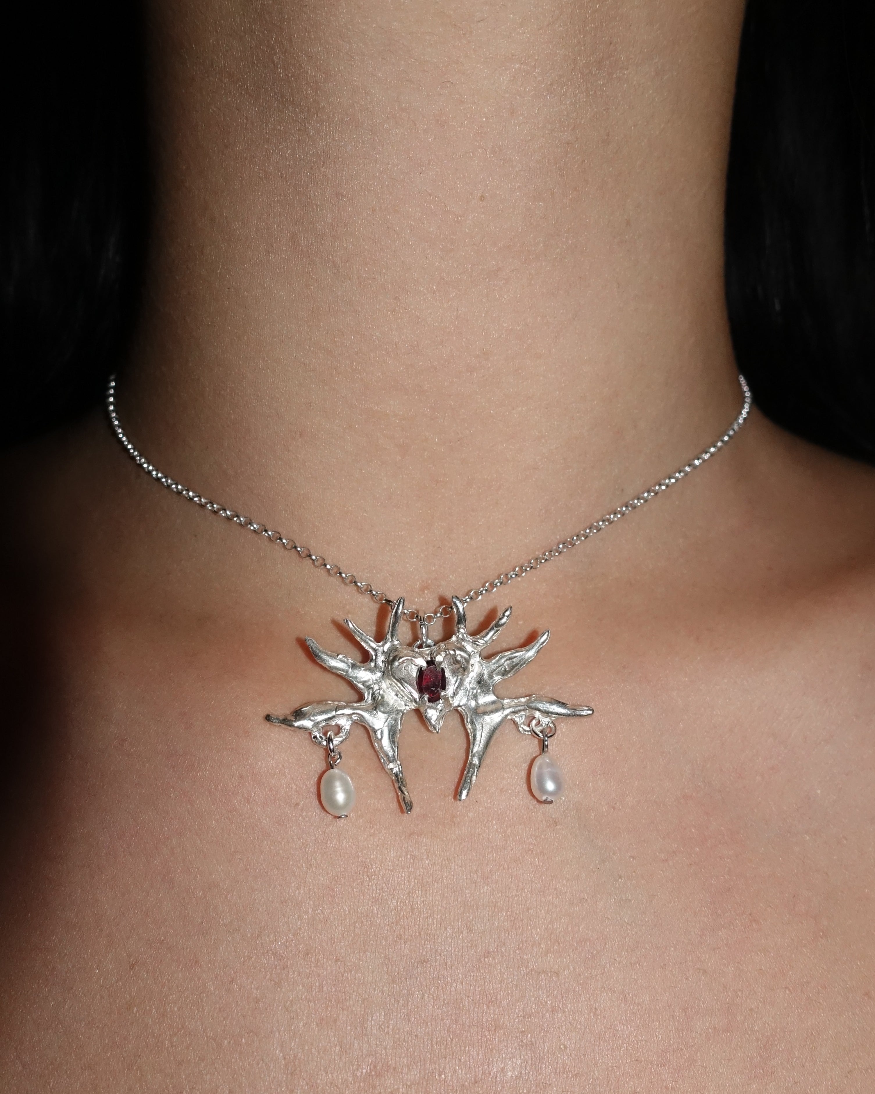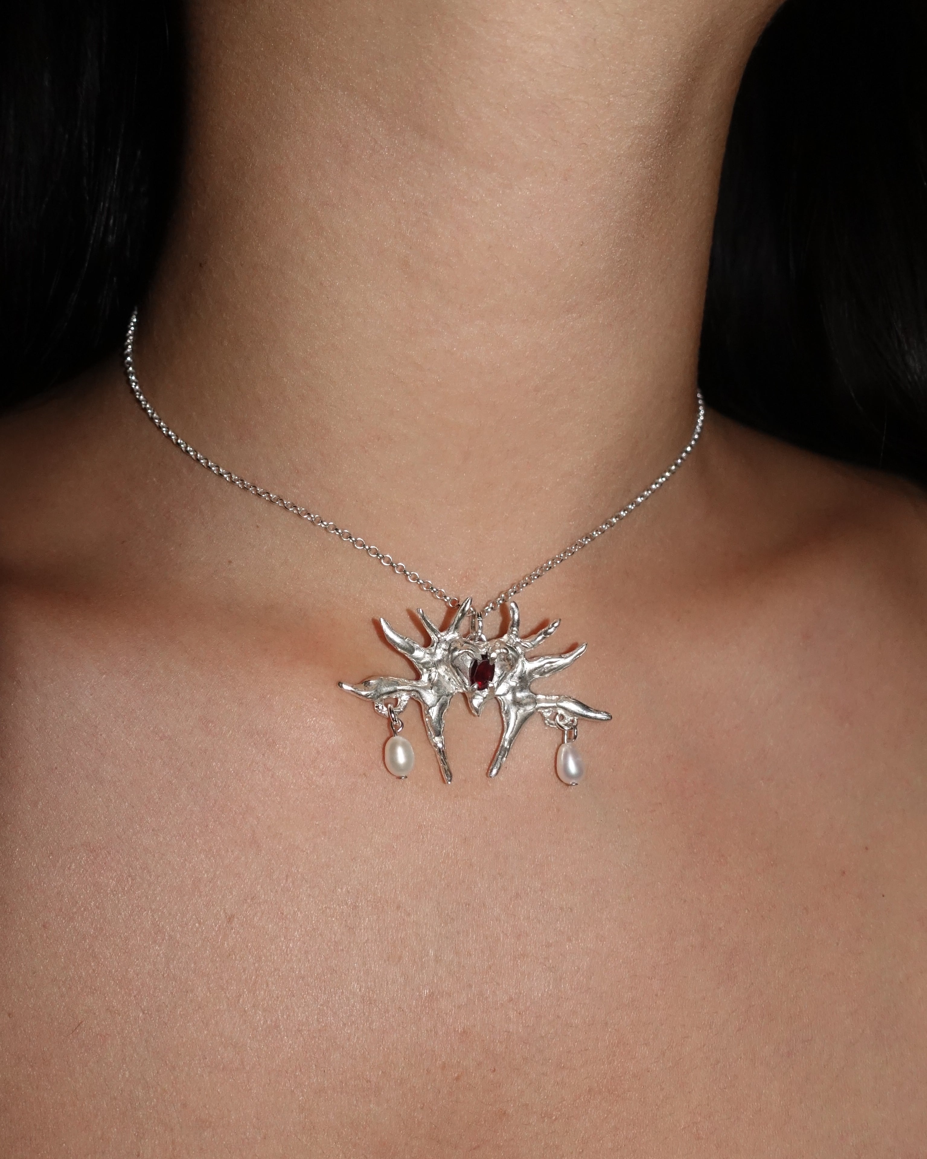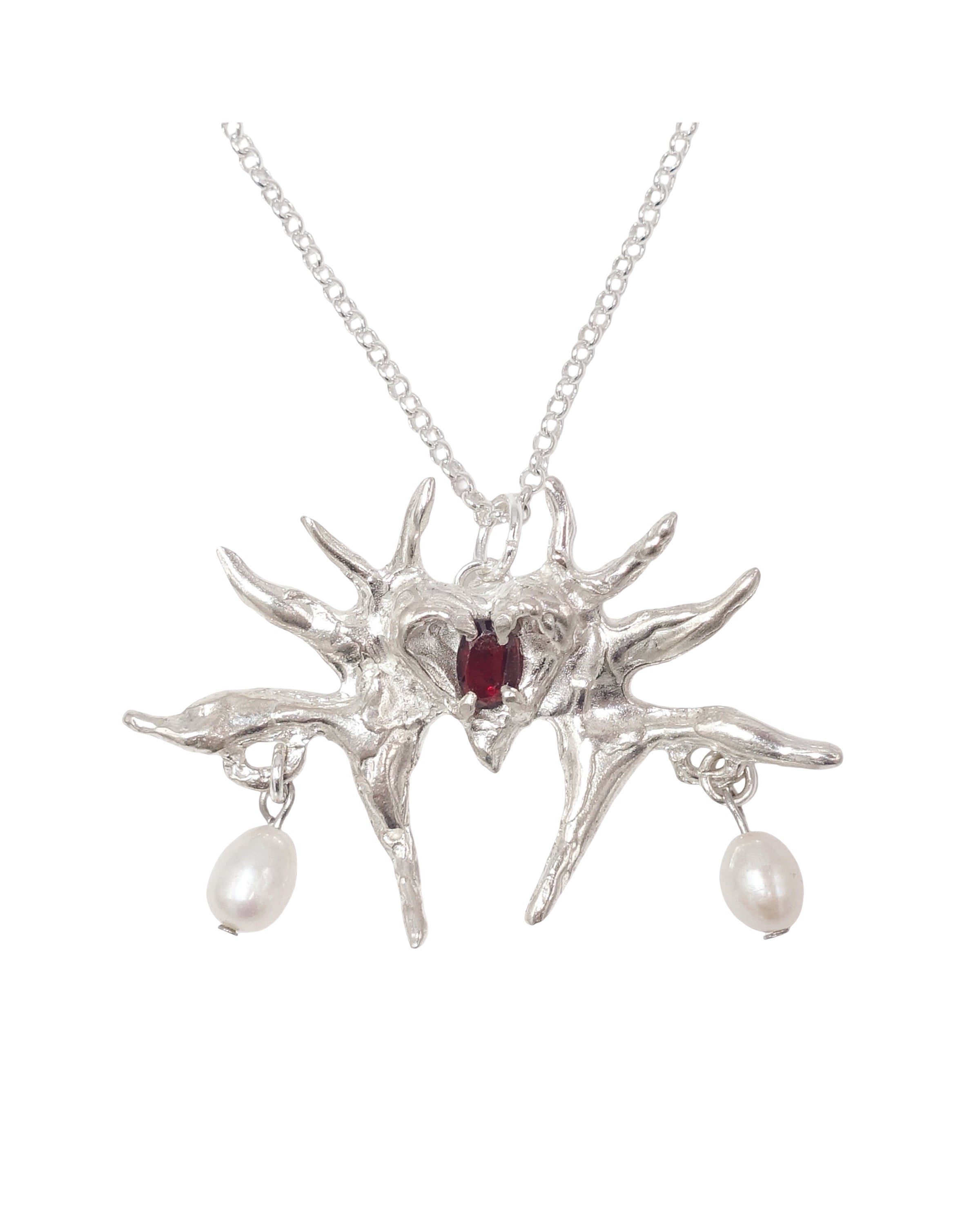 Handmade sterling silver signature silhouette butterfly pendant necklace with natural garnet stone setting.