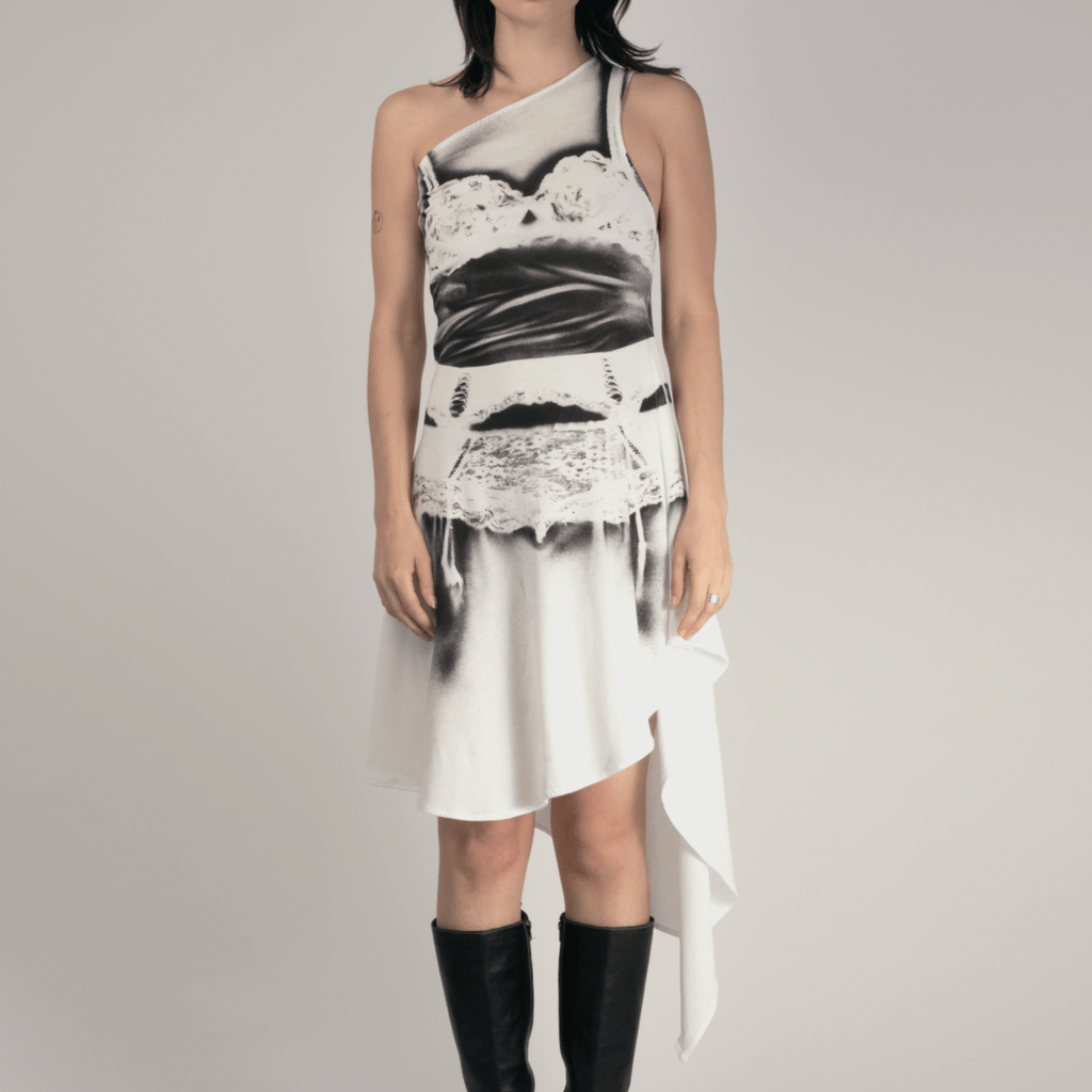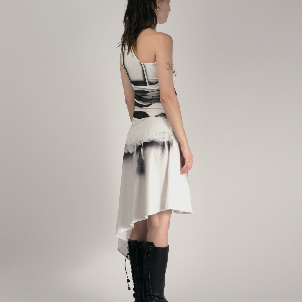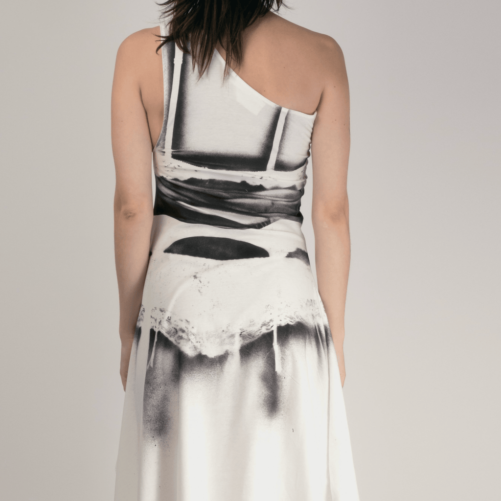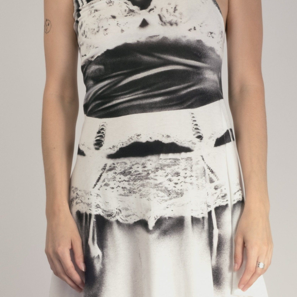 Dress made in the Paris atelier, spray painted individually with vintage lingerie making every print completely unique.