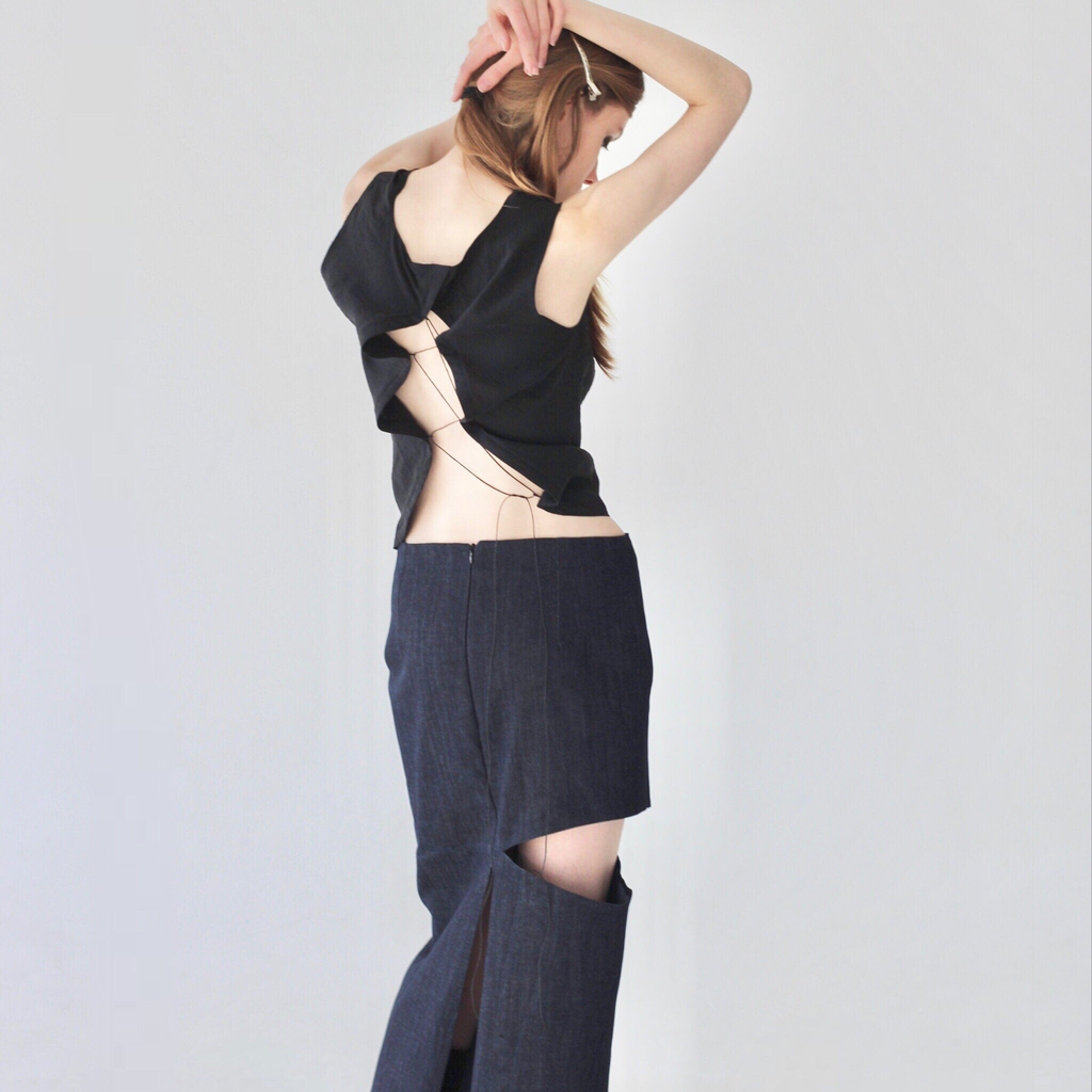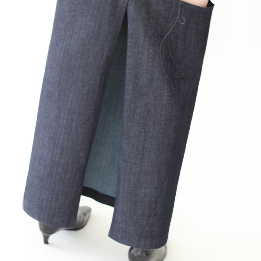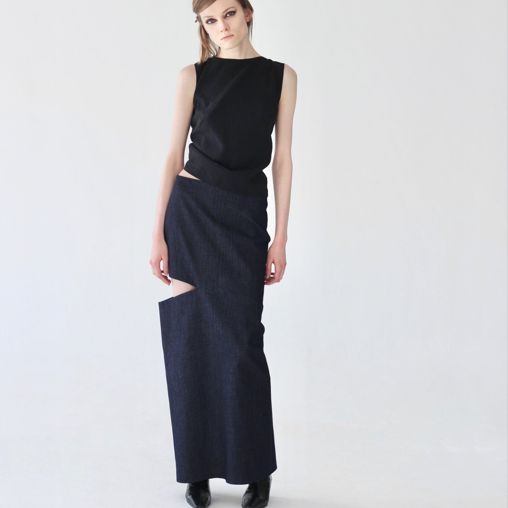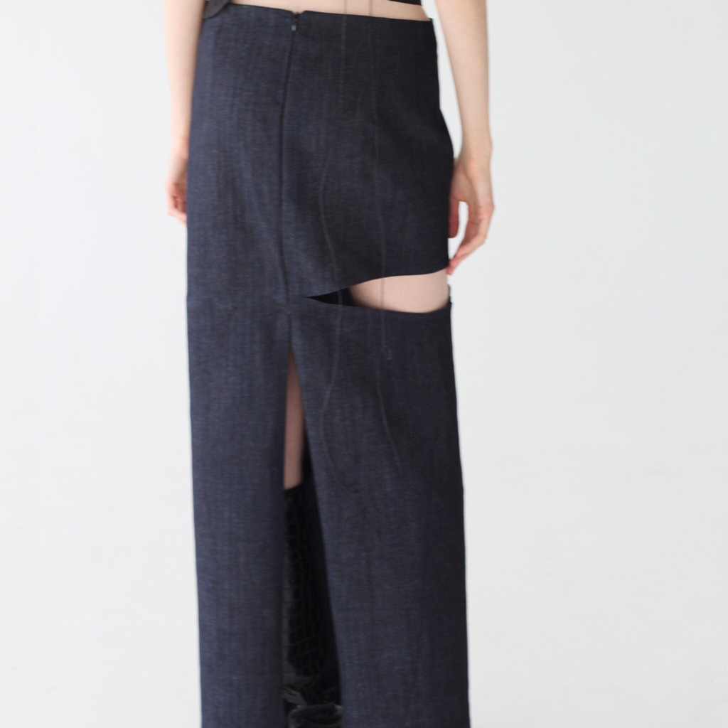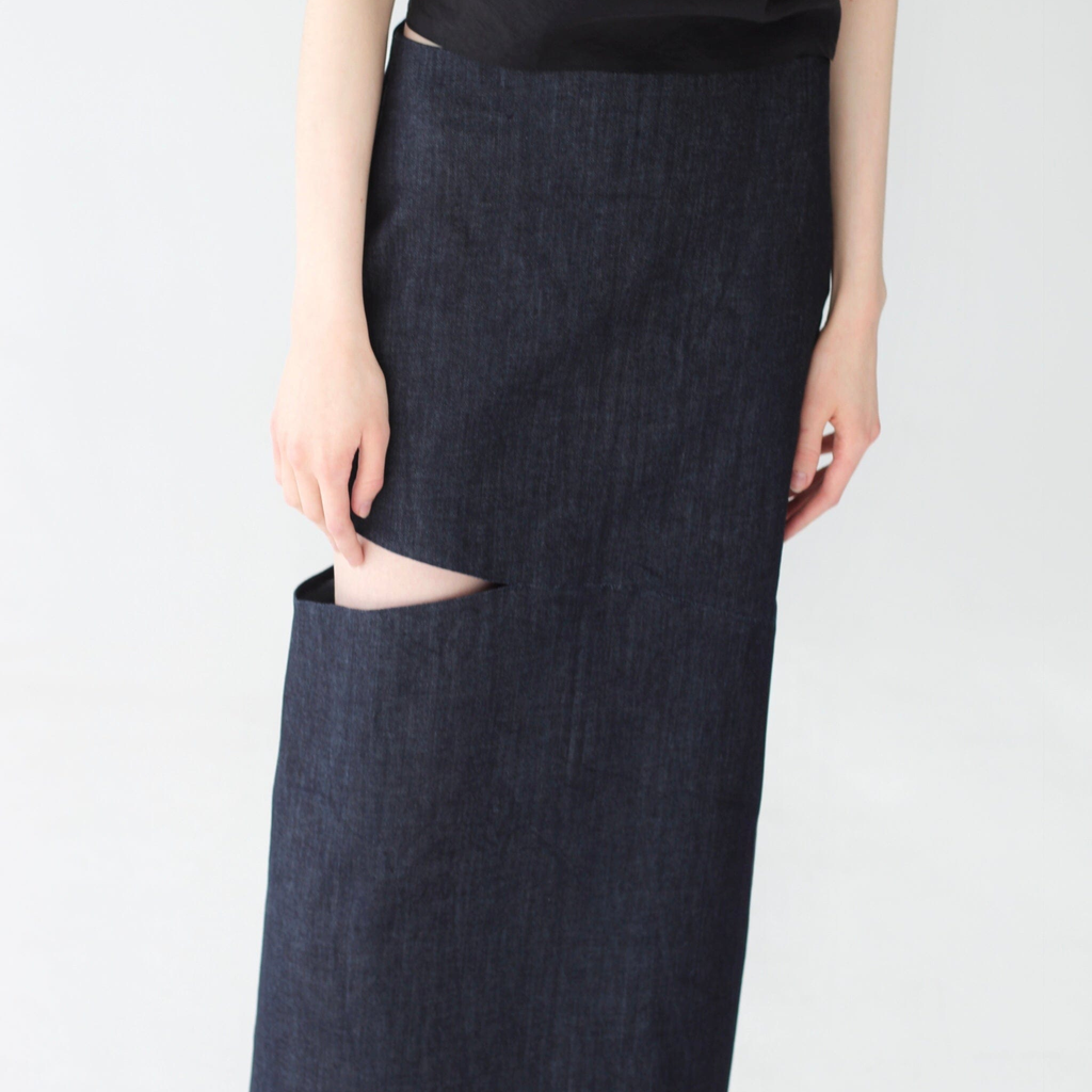 A long straight-cut skirt made from dense denim with an elegant slit, giving the skirt unique geometric shapes.
