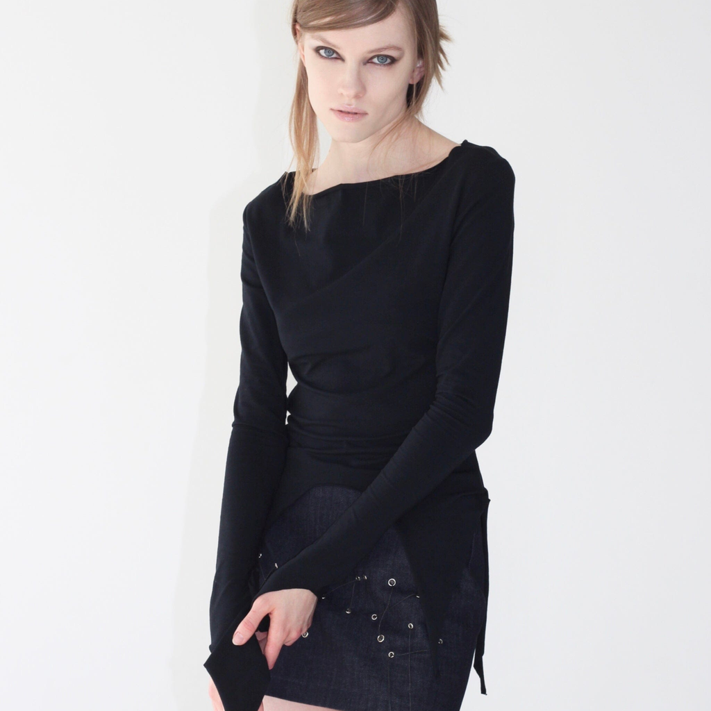 Longsleeve with sharp details, and unique back with slits for your wings, double-layered fabric on the chest, and hand-crafted side pleats made from soft Italian tricot.