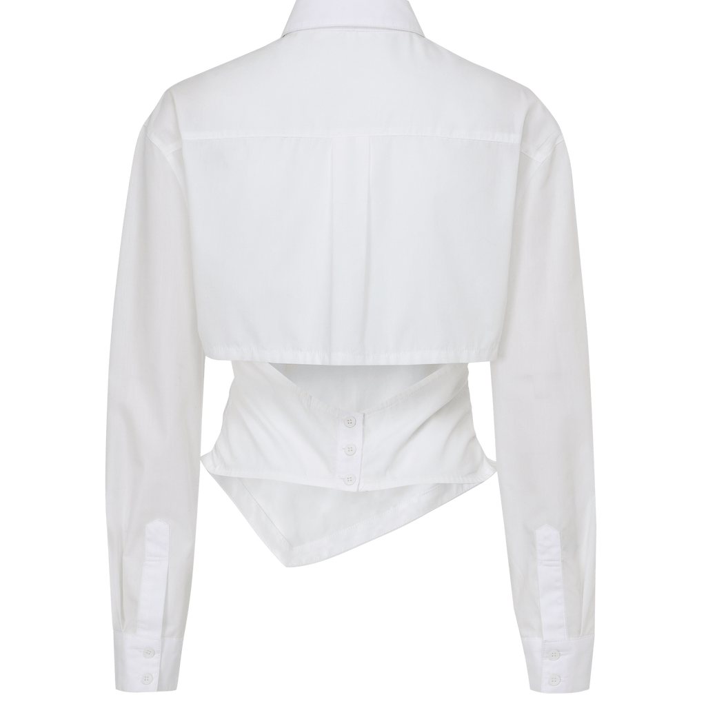 It features a design that wraps around the waist. The necktie is adjustable. The back can be opened and closed with buttons.