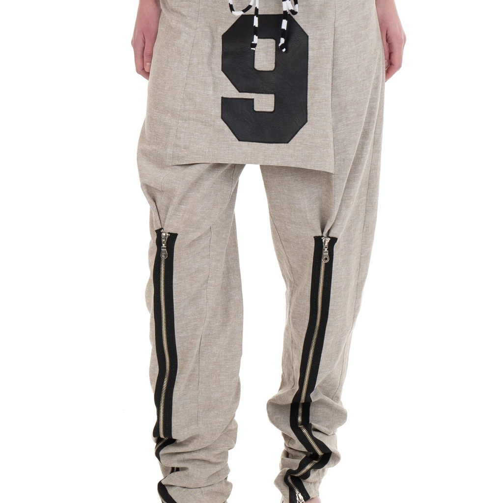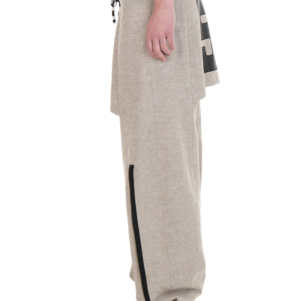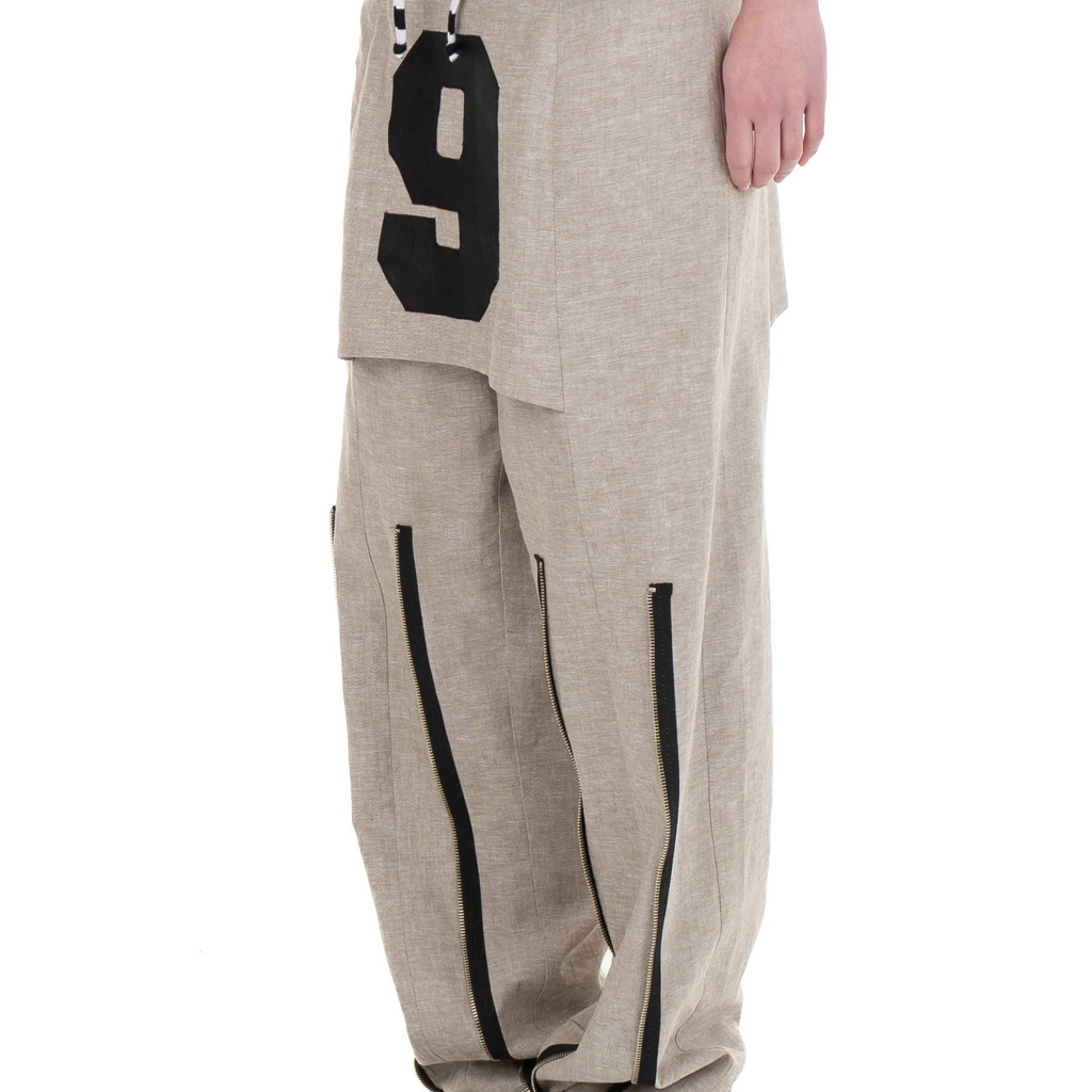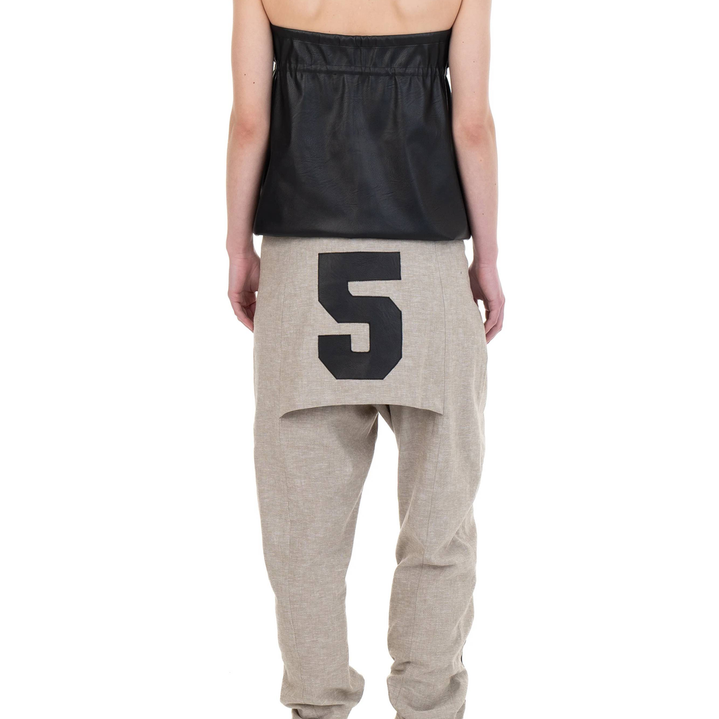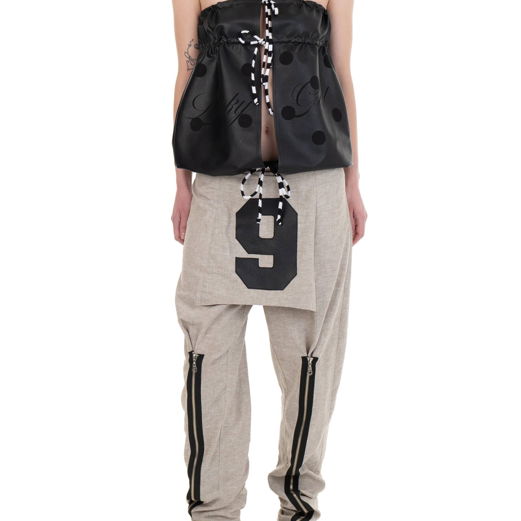 Straight cut, low waisted, linen trousers. Featuring a skirt design front and back. Hidden zip closure at side. Front and back pocket. Featuring a faux leather number applique and long ties. Exposed zip at front.
