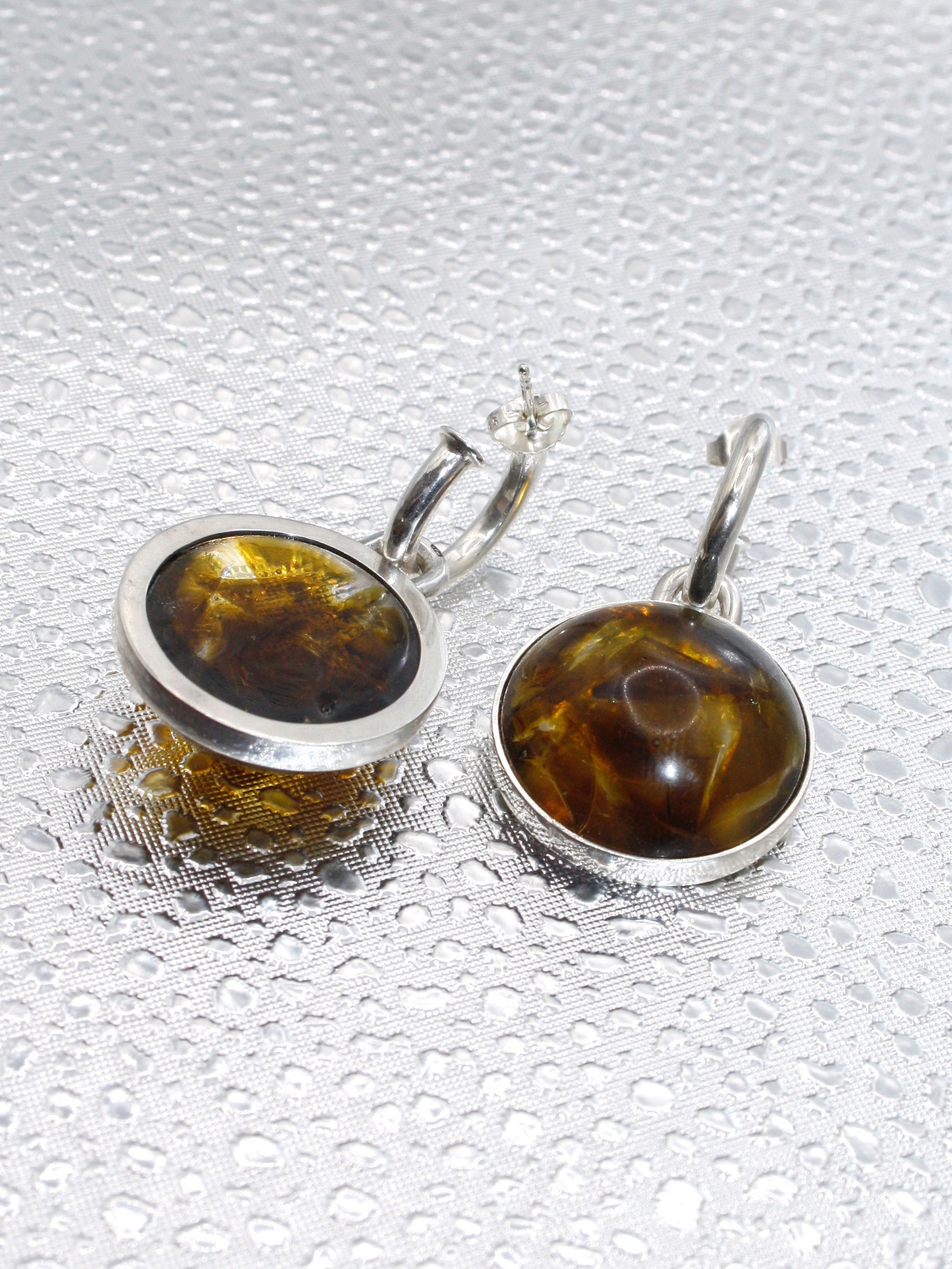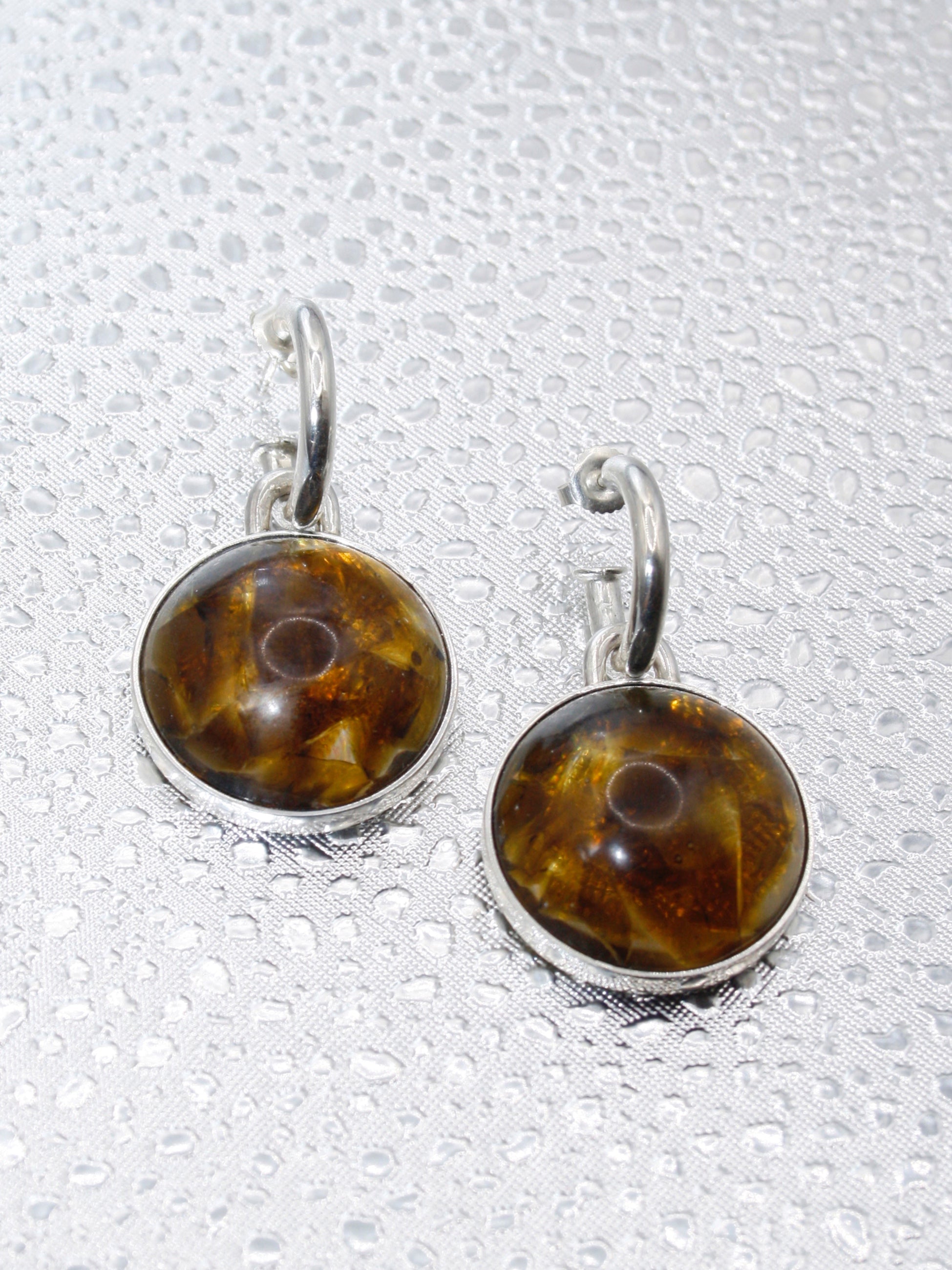 Recycled sterling silver, recycled glass, epoxy resinHandmade earrings crafted from recycled sterling silver, featuring chunky silver hoops, featuring resin casted stone drops made from recycled beer bottles.