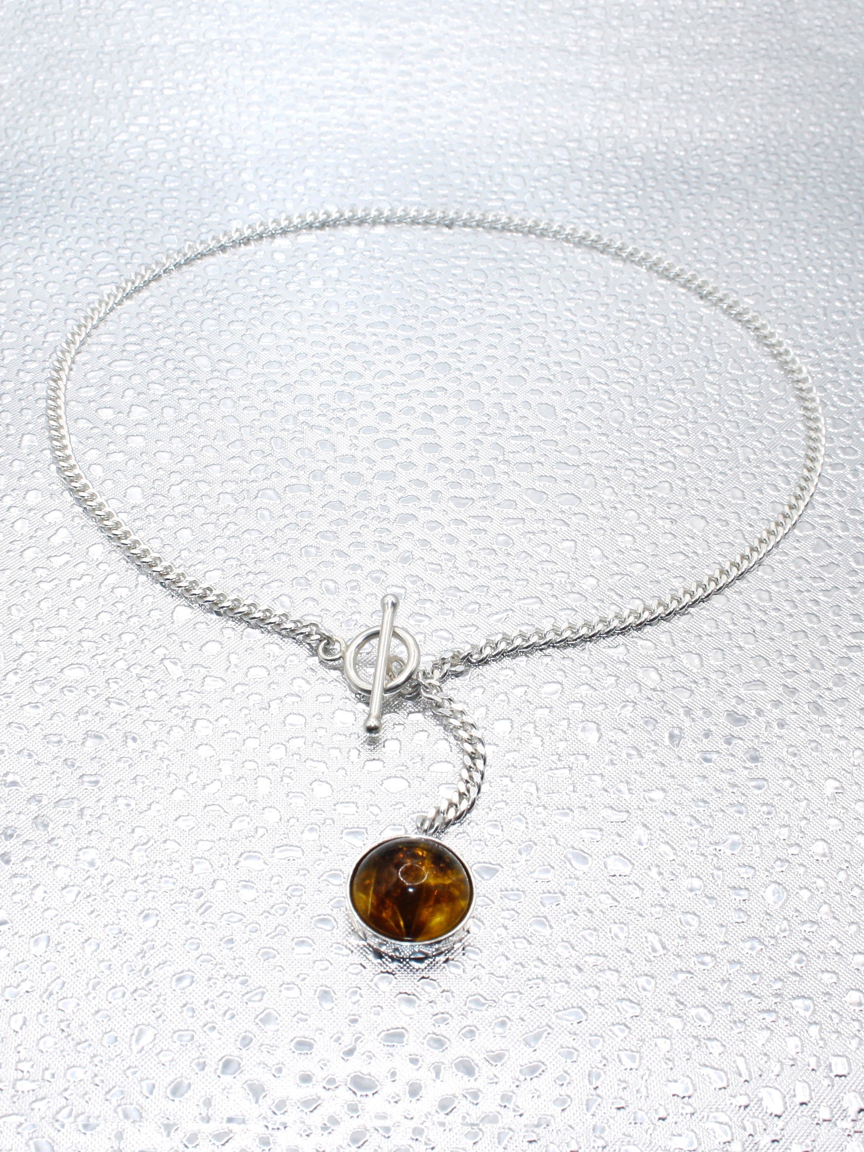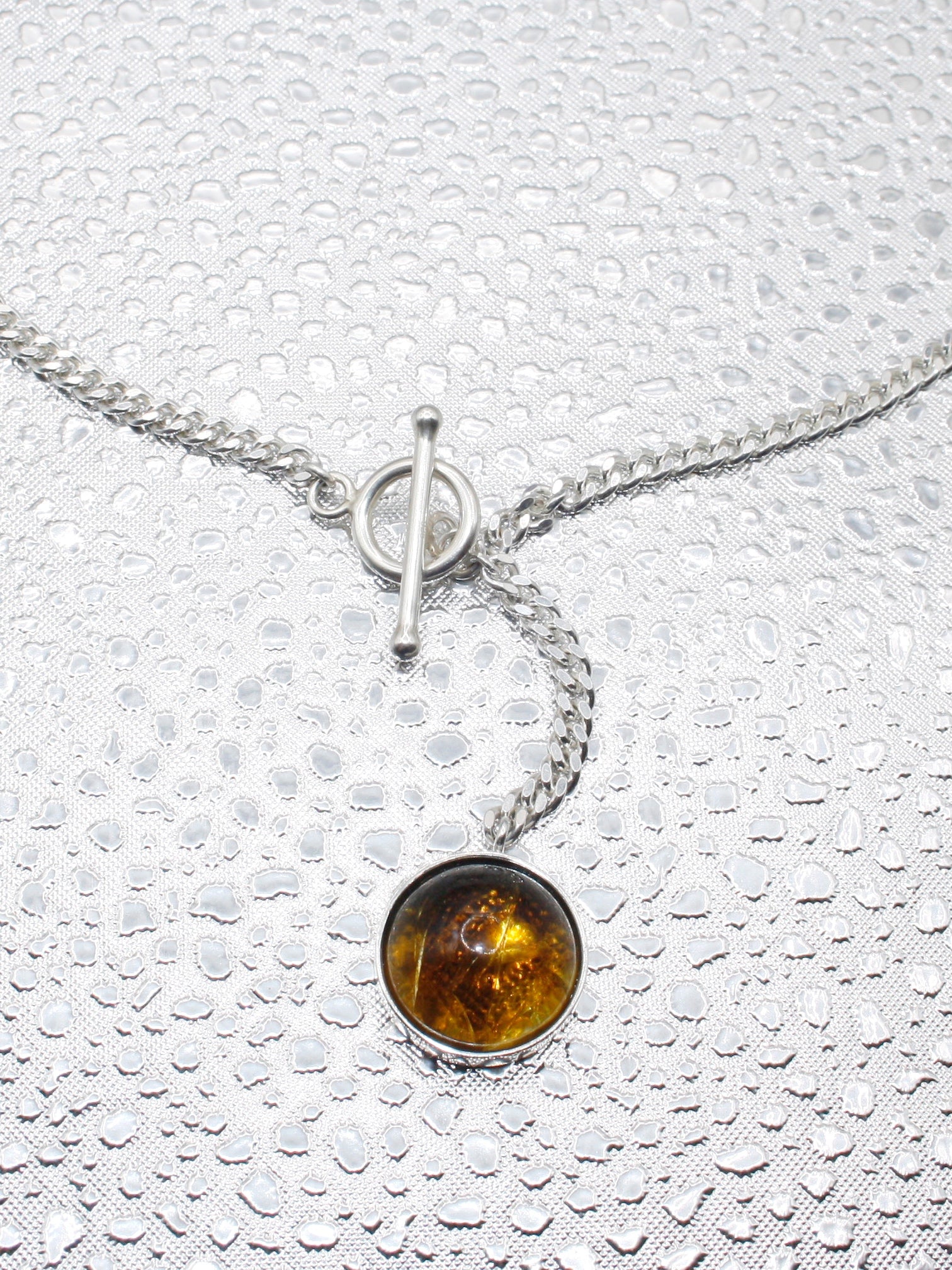 Sterling silver, glass, epoxy resinHandmade necklace crafted from recycled sterling silver, featuring a round cast stone made from recycled beer bottles and resin. The piece is finished with a bold 3 mm wide curb chain and toggle clasp, designed to sit elegantly at the neckline for a contemporary statement look.