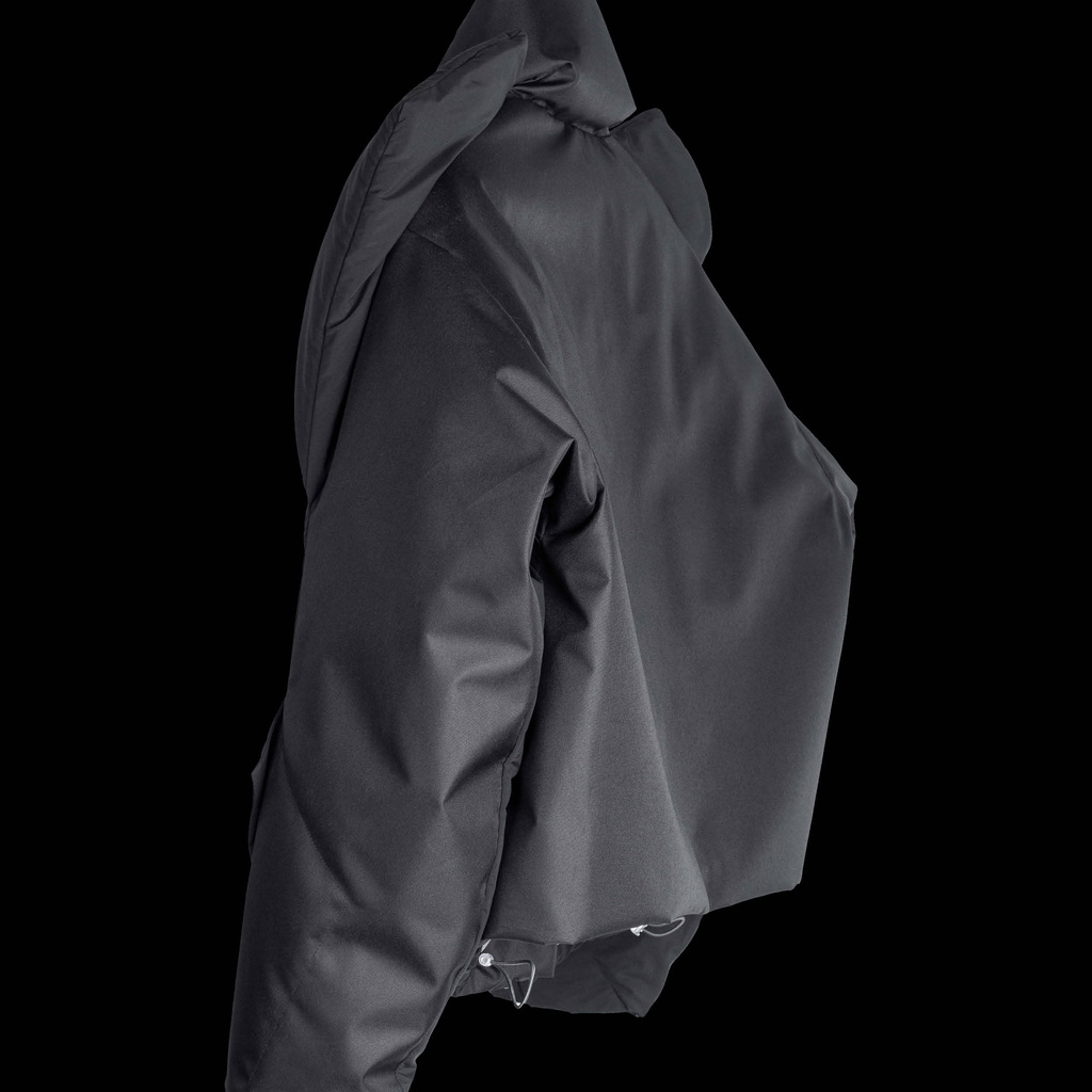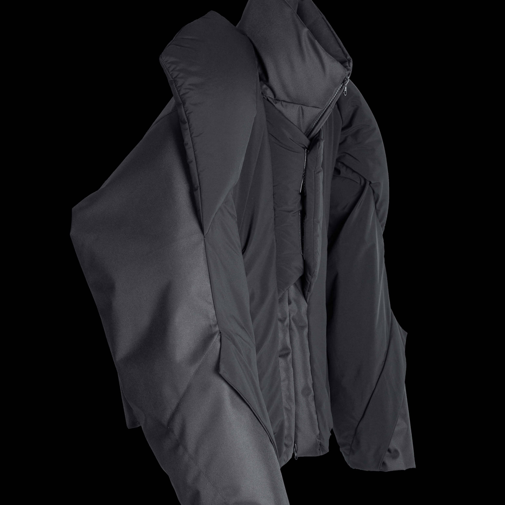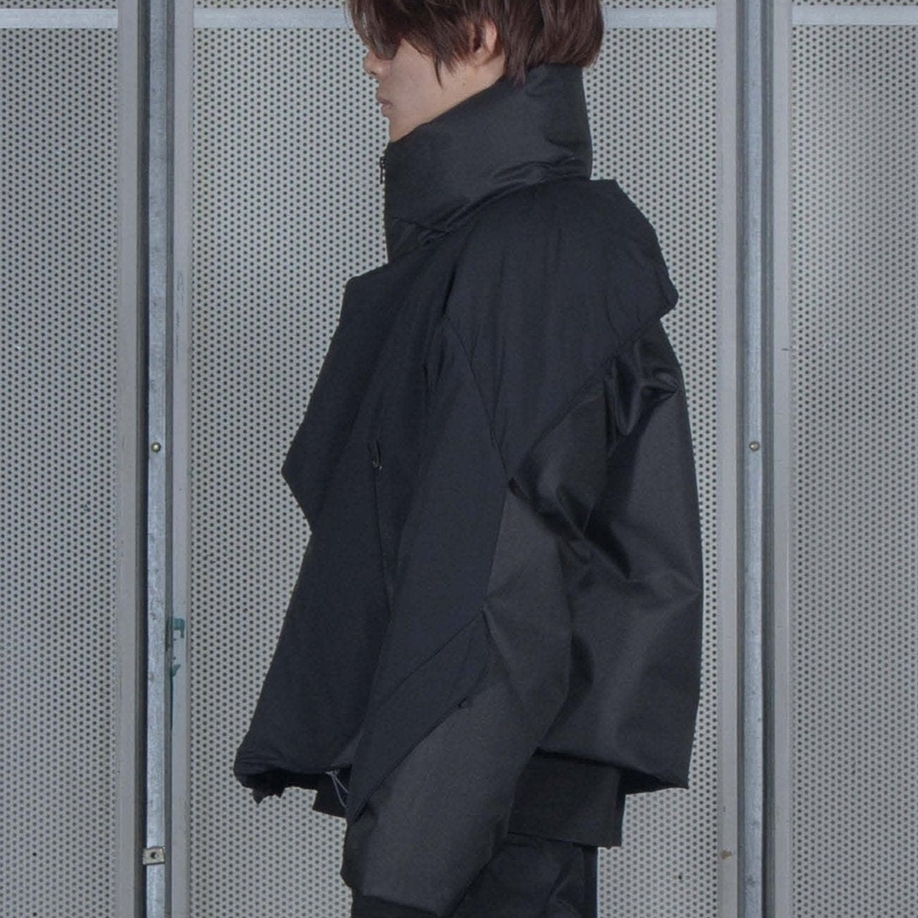 The NOTINLIST black down-filled jacket, LV.0 Down Jacket Y, features a YKK 2-way zipper closure with a placket at the front, a front pocket with a YKK zipper, and a water-resistant & windproof design. It also includes a stand collar, hidden elastic hem, and zip pockets on the wrist position.