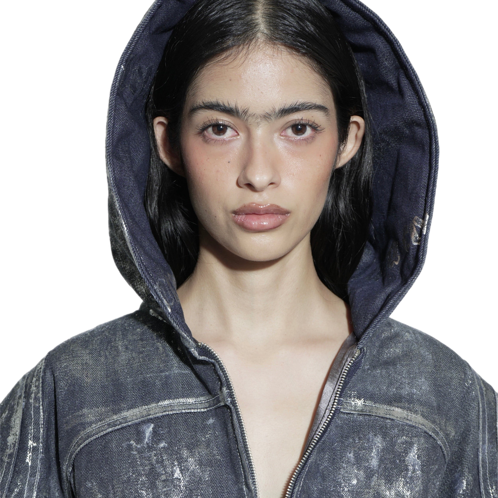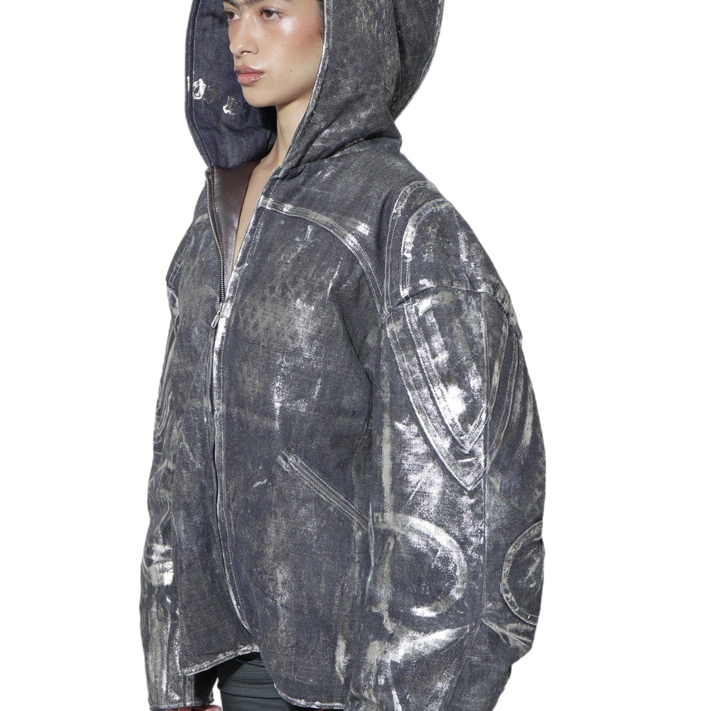 Bomber jacket with wadding, stylelines, hoodie that zips open, front zipper, two outside pockets, lining pocket, fleaur de lys back detail.