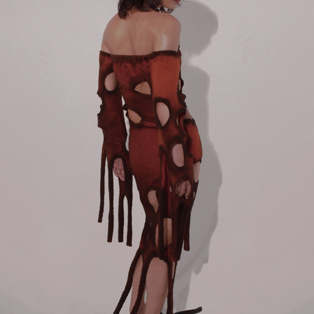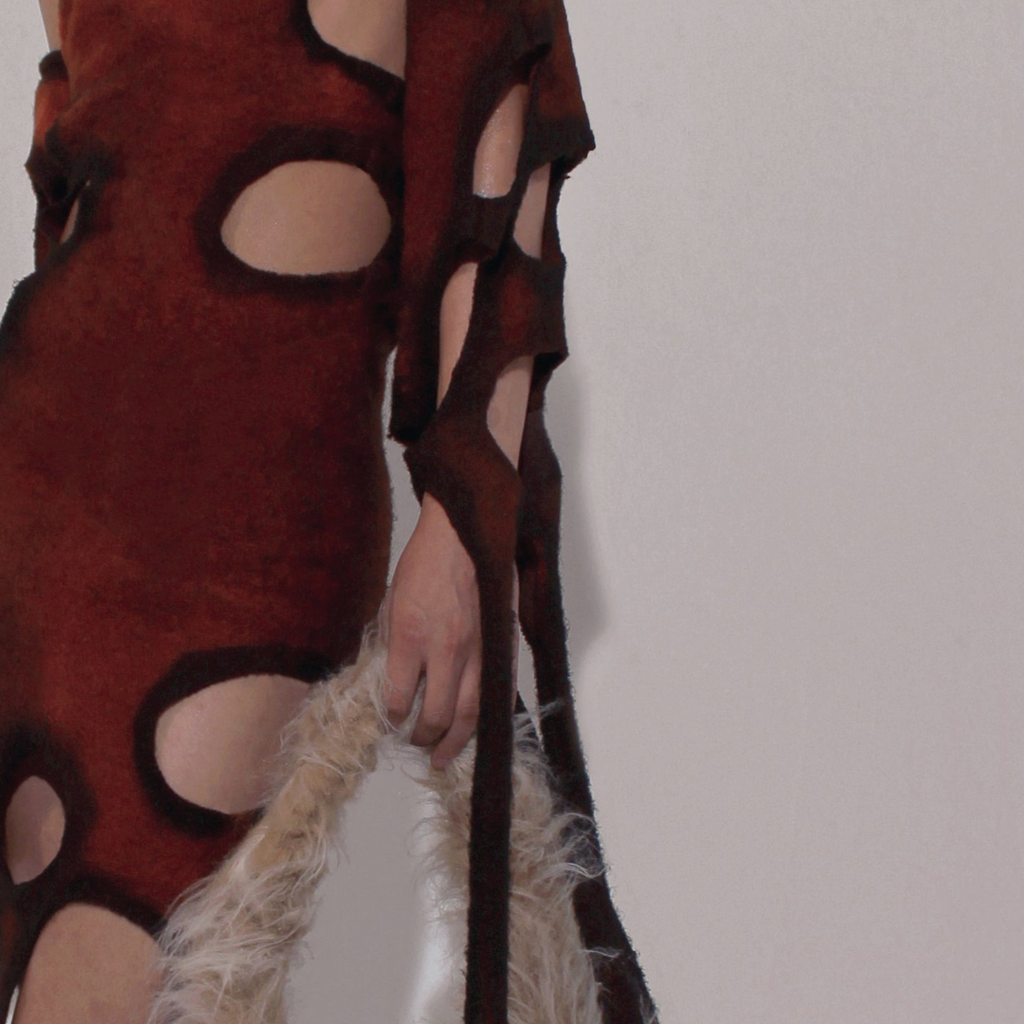 Textiles and tactics find new harmonies through the work of Jules Bramley, replicating natural uniqueness and earthly splendour. This capsule is an exploration into rebirth and transformation. Featuring organic textures, deconstructed shapes, drapery and asymmetrical features. 100% wool fabric is manipulated through deconstructing, felting and sewing with some pieces dipped and coated in natural rubber latex.