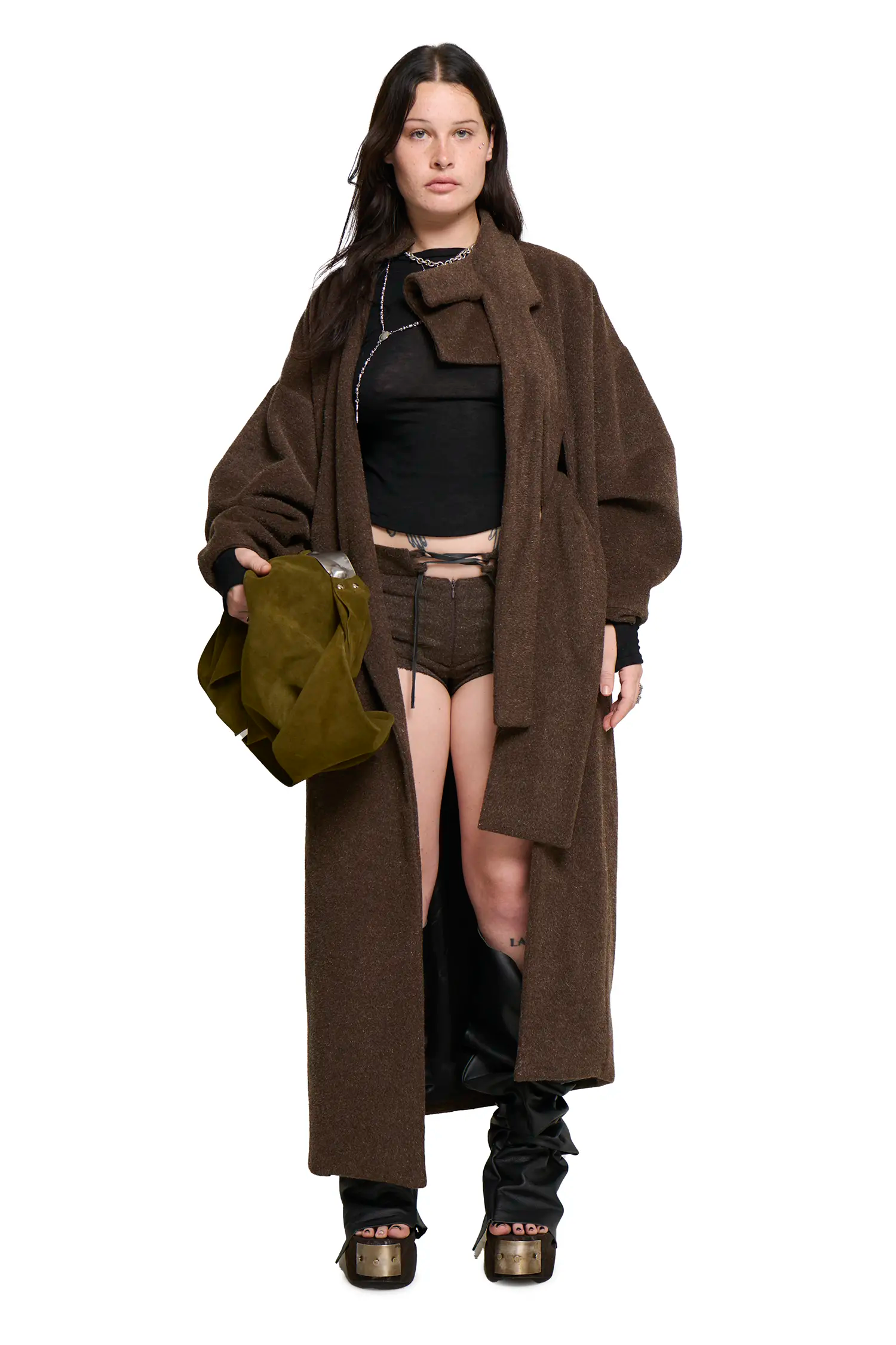 Textured wool fabric. 4 belt holes, for belt to weave through. High neck collar. Slit on collar for lapel to thread through and wrap around. Oversize sleeves. Asymmetric hemline. 2 side pockets. Full lined