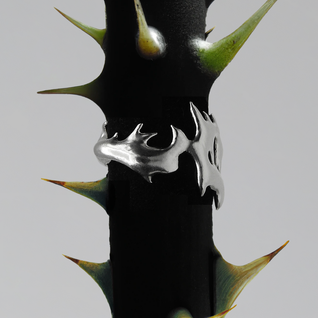 Silver ring with sharp thorns while keeping a fluid shiny shape.