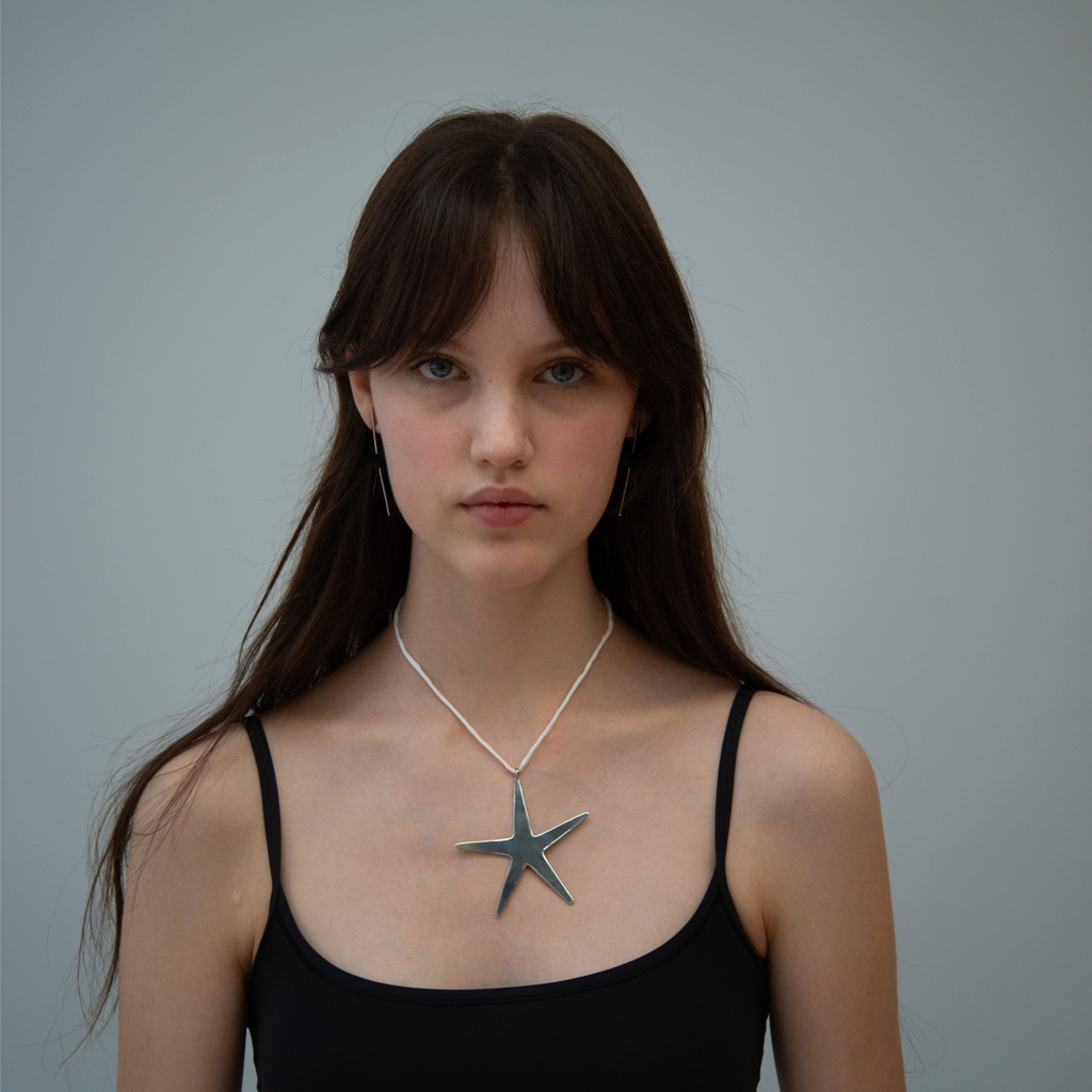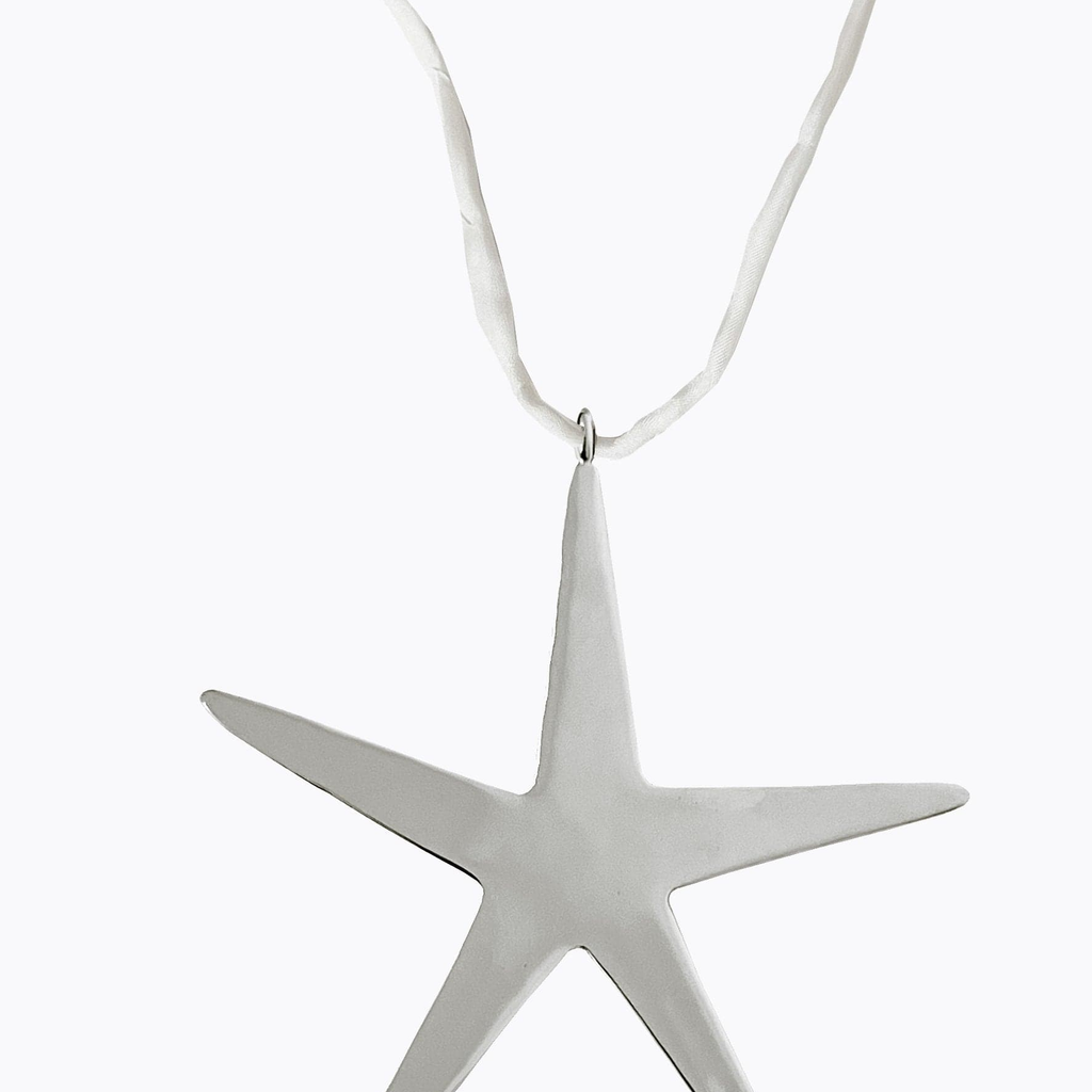 Rhodium Coloured Brass Star Pendant On White Habotai Silk Cord