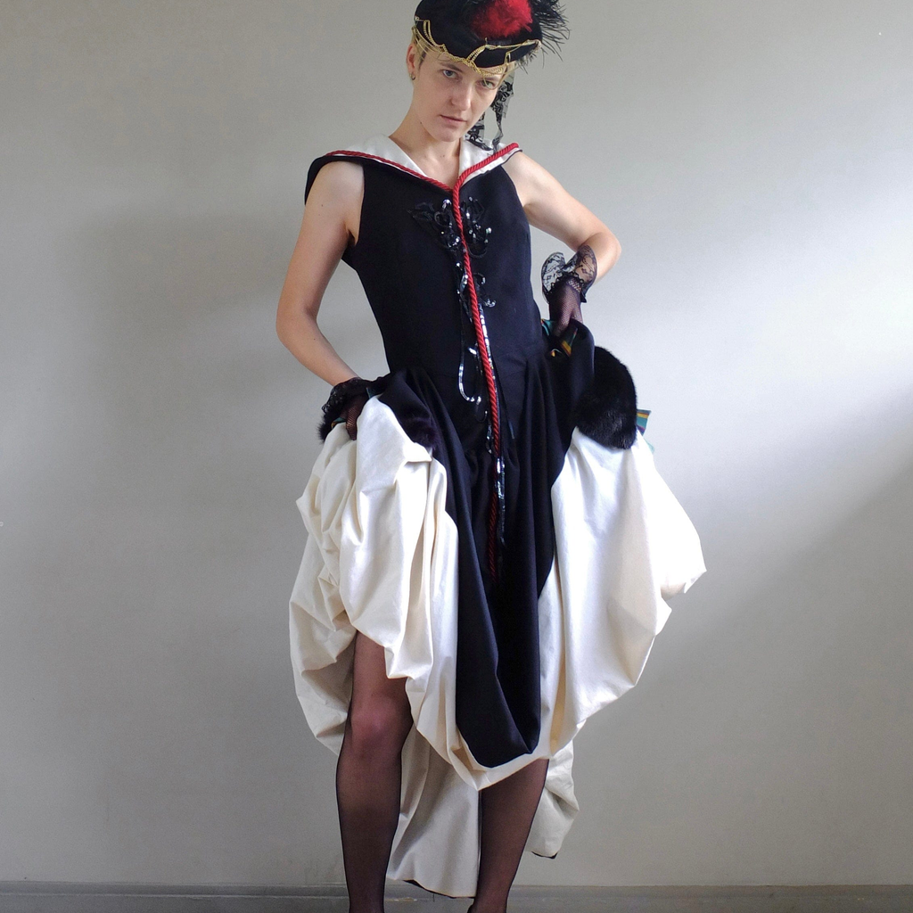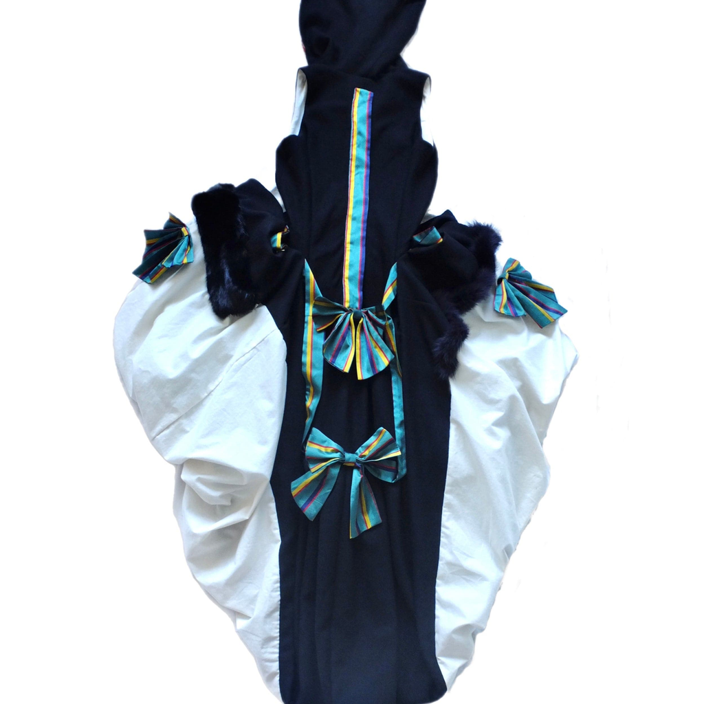 Evening dress from the Opera collection, made of the finest black wool with contrast cotton lining. Finished with a voluminous hood, featuring red canat rope, sequin appliqués, and pieces of vintage fur and silk striped bows.