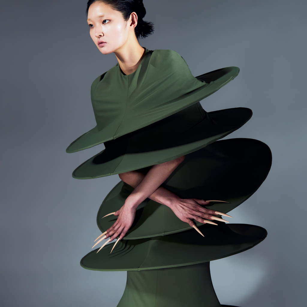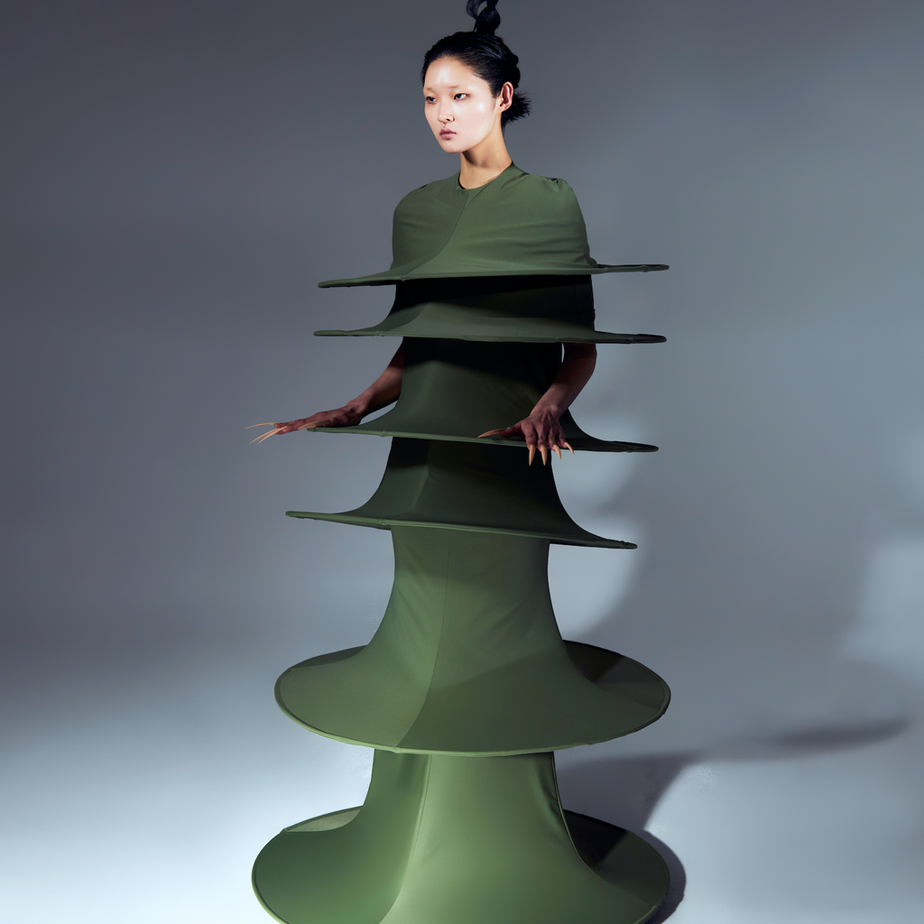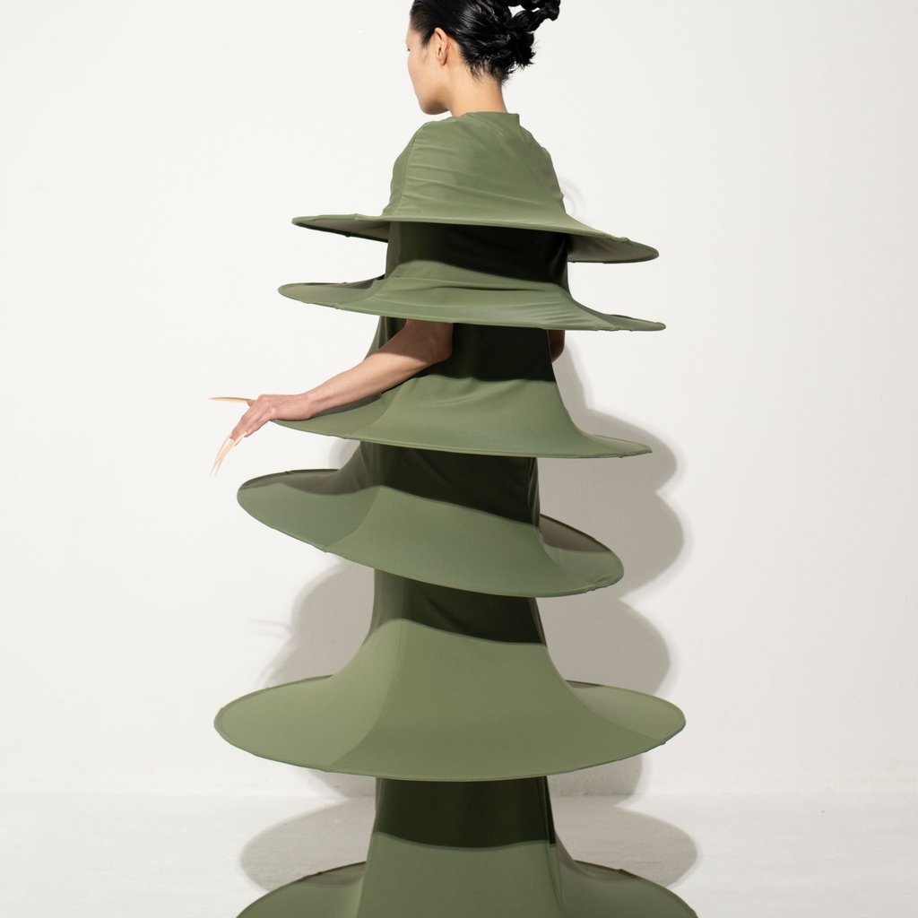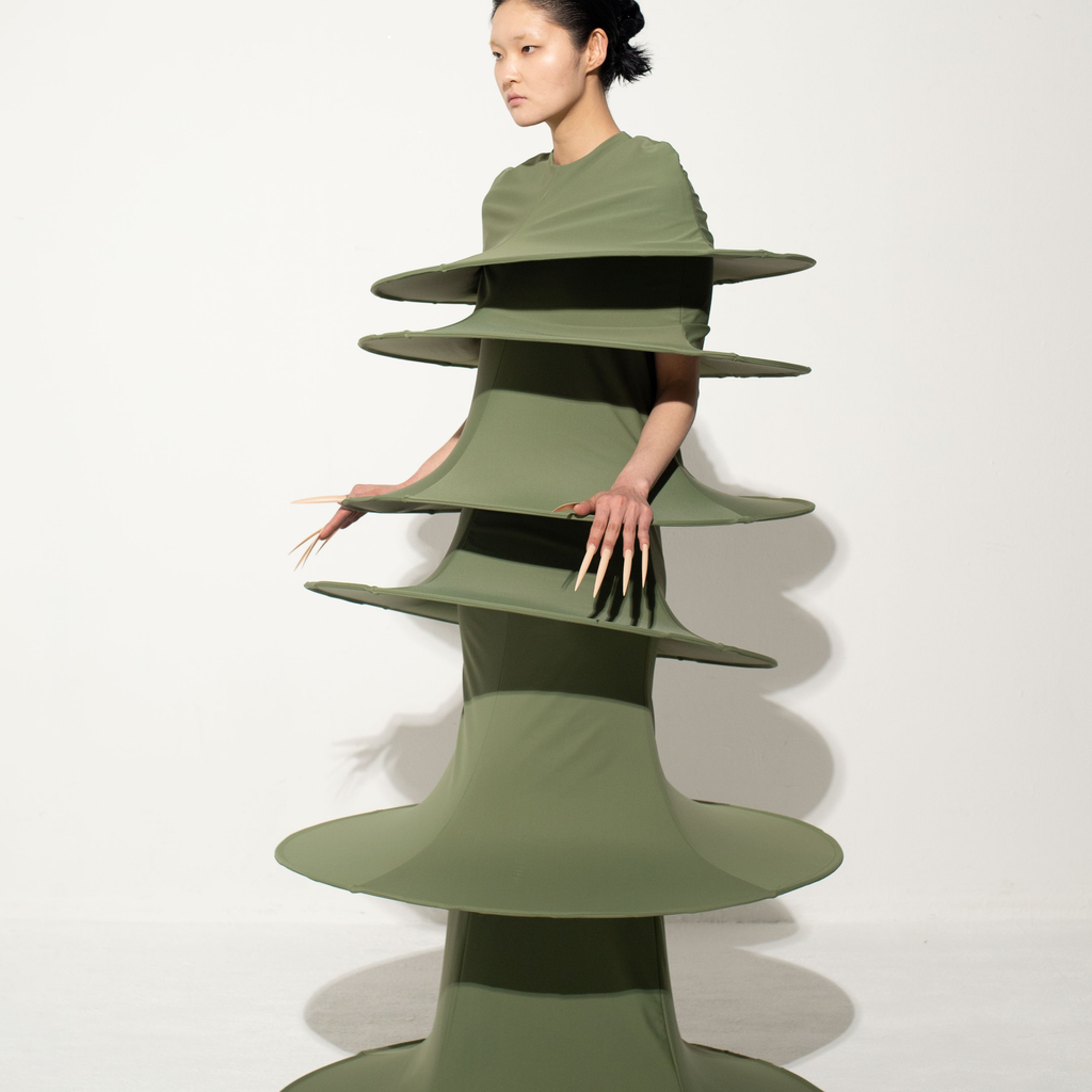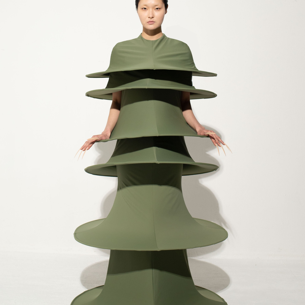 Matryoshka look, inspired by a Matryoshka doll, has meaning of a figure that looks like a mother brooding a child, can be dressed by layering a dress, skirt, two pieces of top, and two pieces of cape. This creates a silhouette that covers and protects the whole body and that also shows two characteristics of fashion, protection and expression. At the same time, it pursues to create a image of a tent when the audiences think of “SUN WOO” just like the word, “a pop-up tent” that leads to a typical image of it.