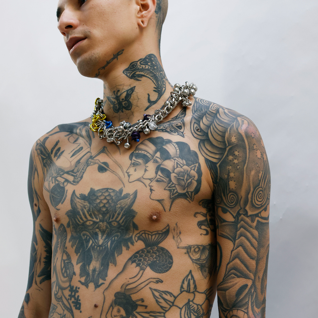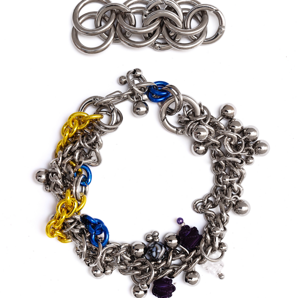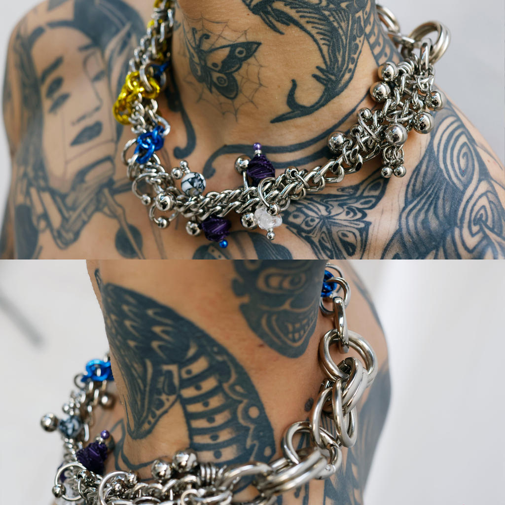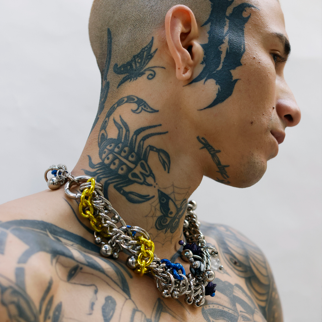 Material: Steel and aluminium chains, glass beads, mother of pearl, resin and Colonião grass.