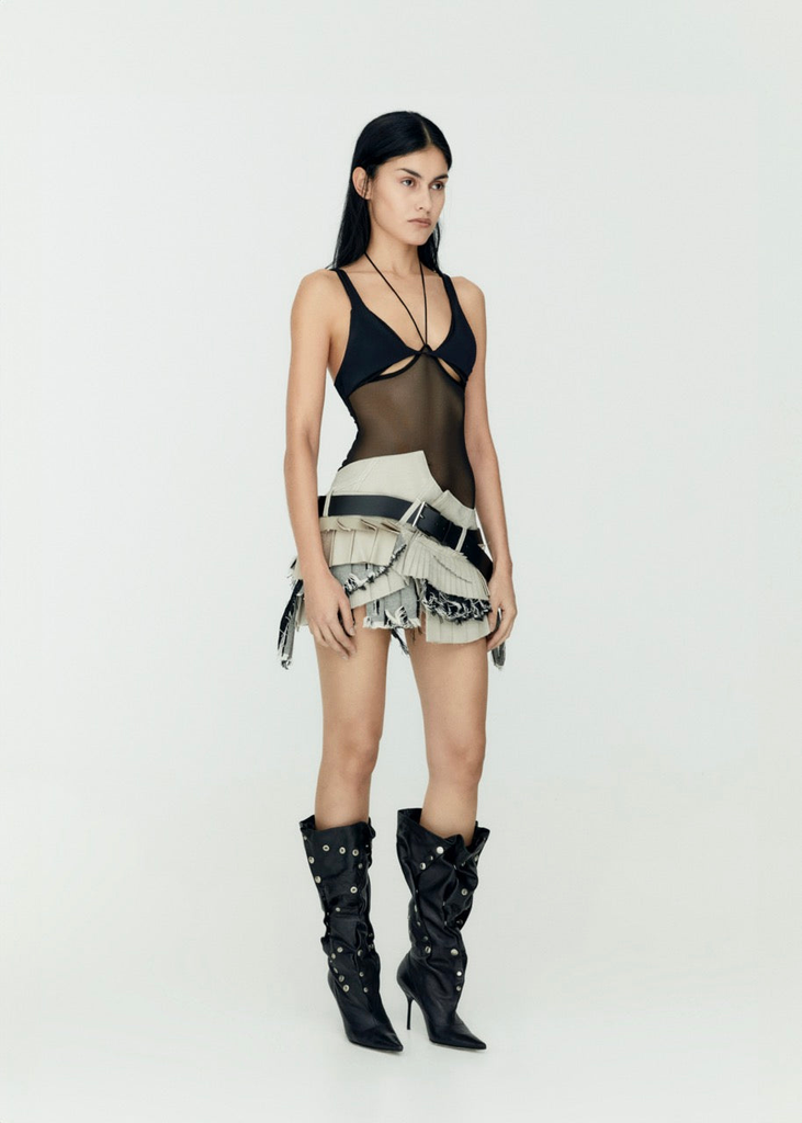 SS23 mesh and lycra bodysuit in black. Layering detail at bust. Cut away shape underbust. Elastic strap fits around neck with shoulder straps secured to centre back. No opening at crotch. Cut above hip.