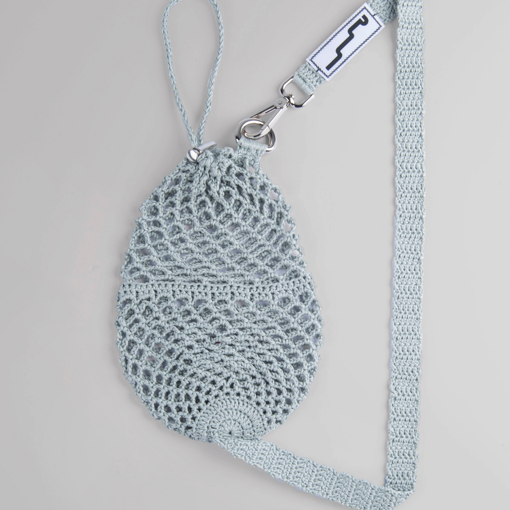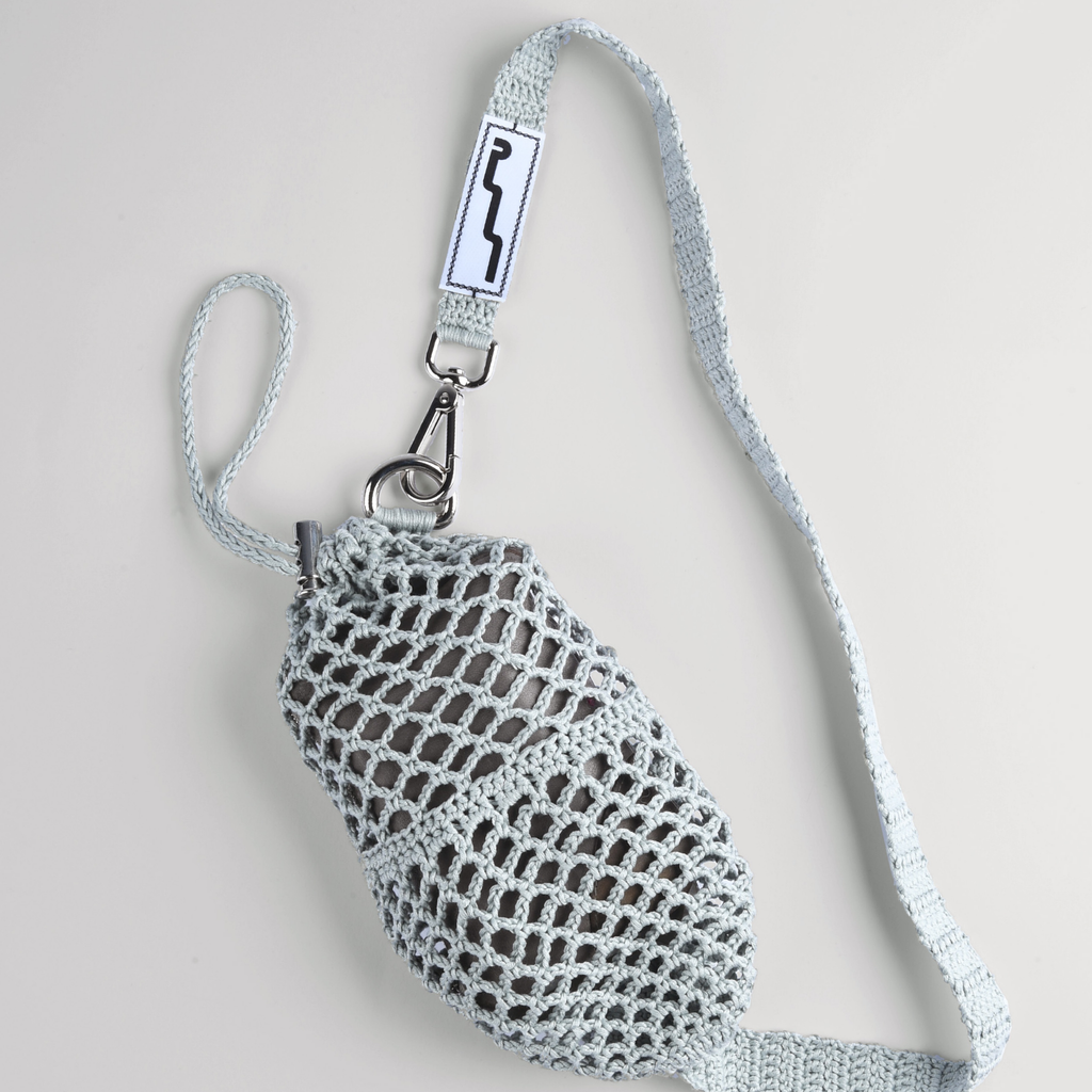 The sack features a metal cord lock closure. The belt ends with a keychain metal carabiner attached to a D hook.