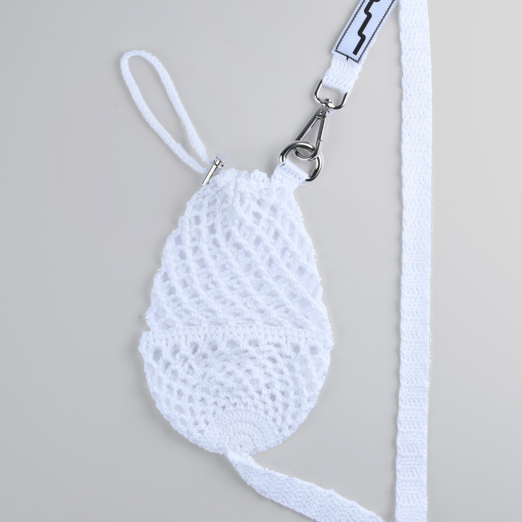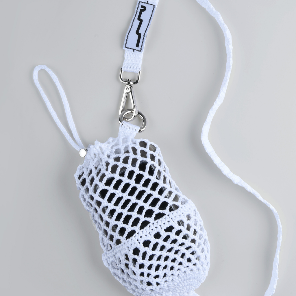 The sack features a metal cord lock closure. The belt ends with a keychain metal carabiner attached to a D hook.