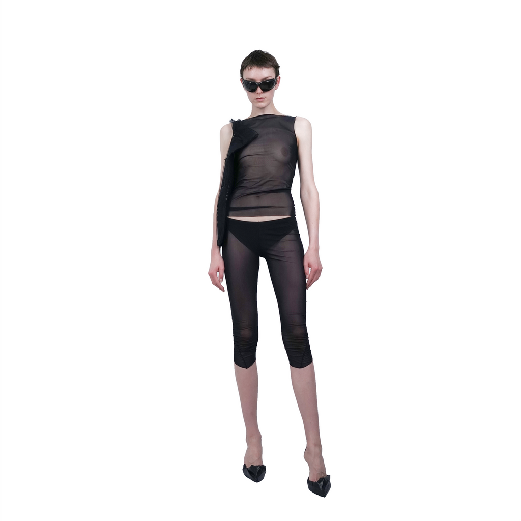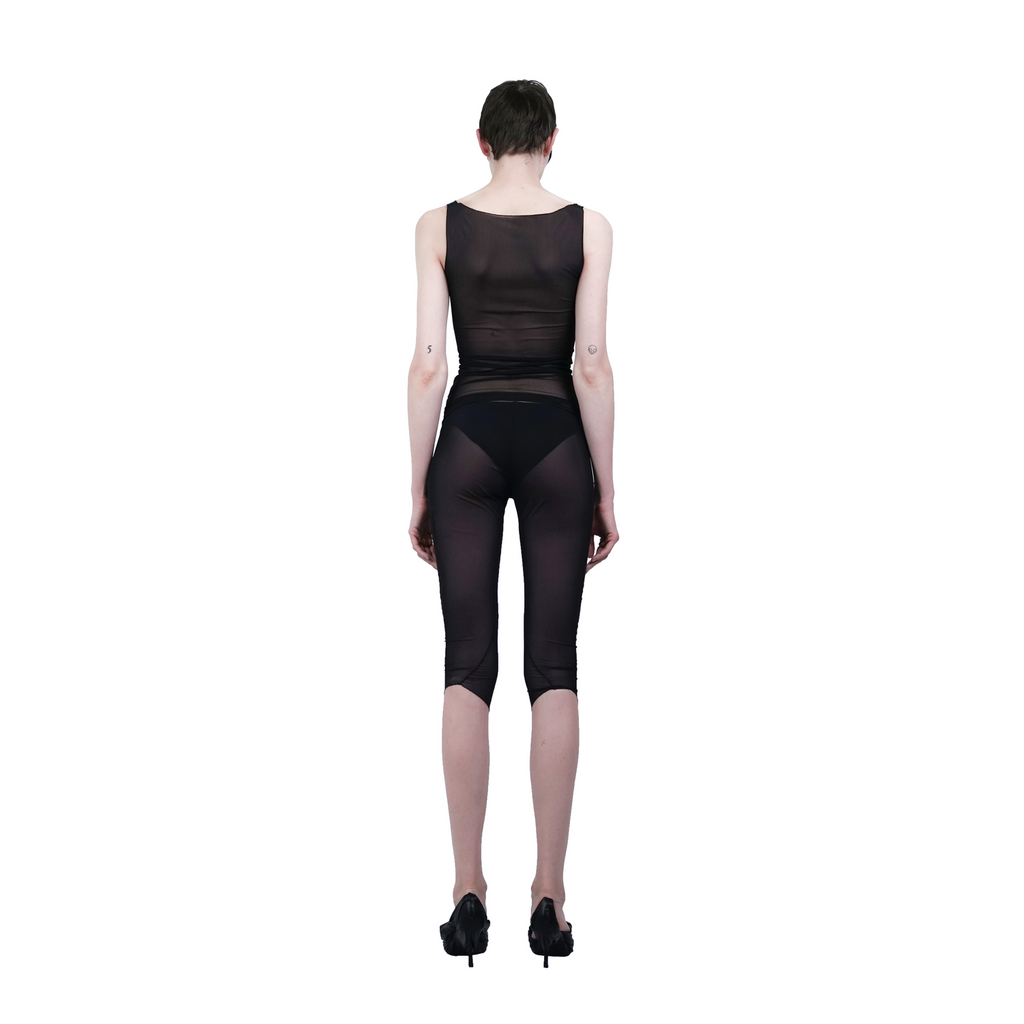3/4 fitted shorts, crafted from a tightly knitted mesh fabric. These shorts feature a double-layered 'panty' design, providing added coverage and comfort.