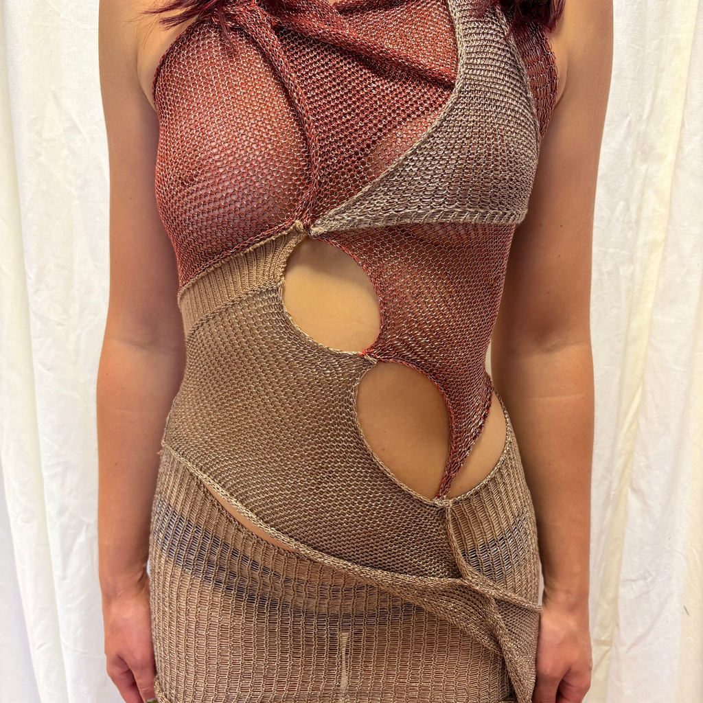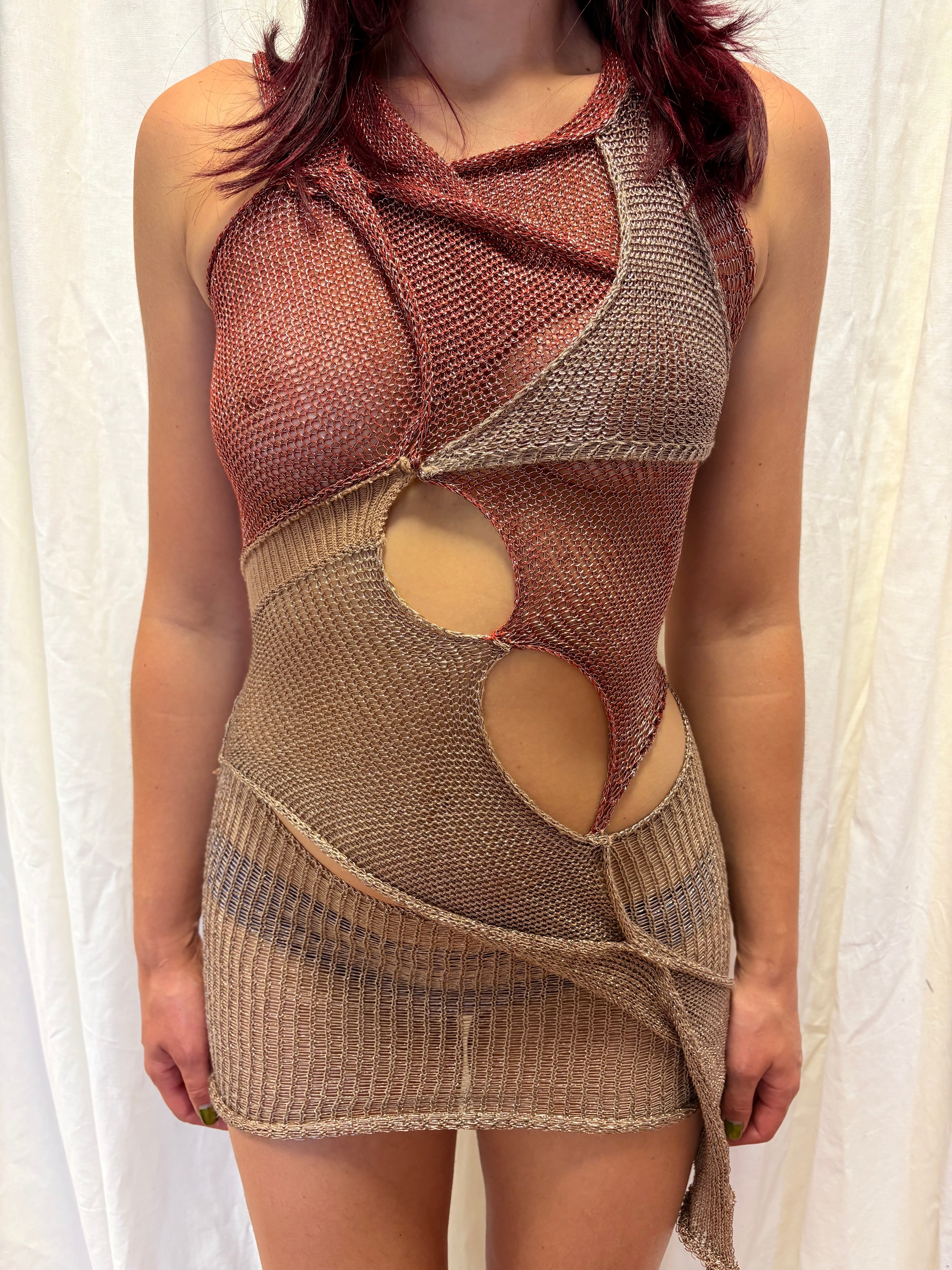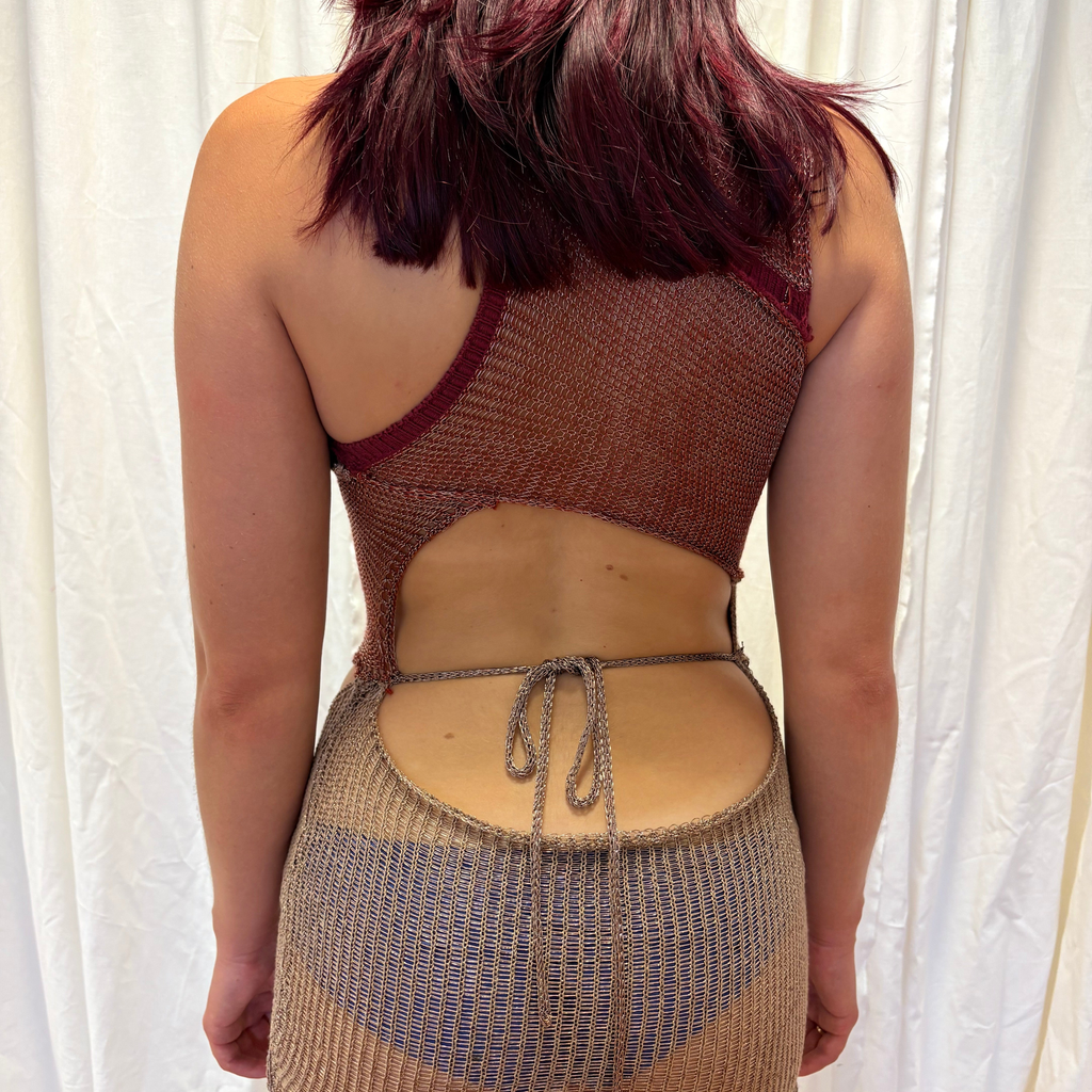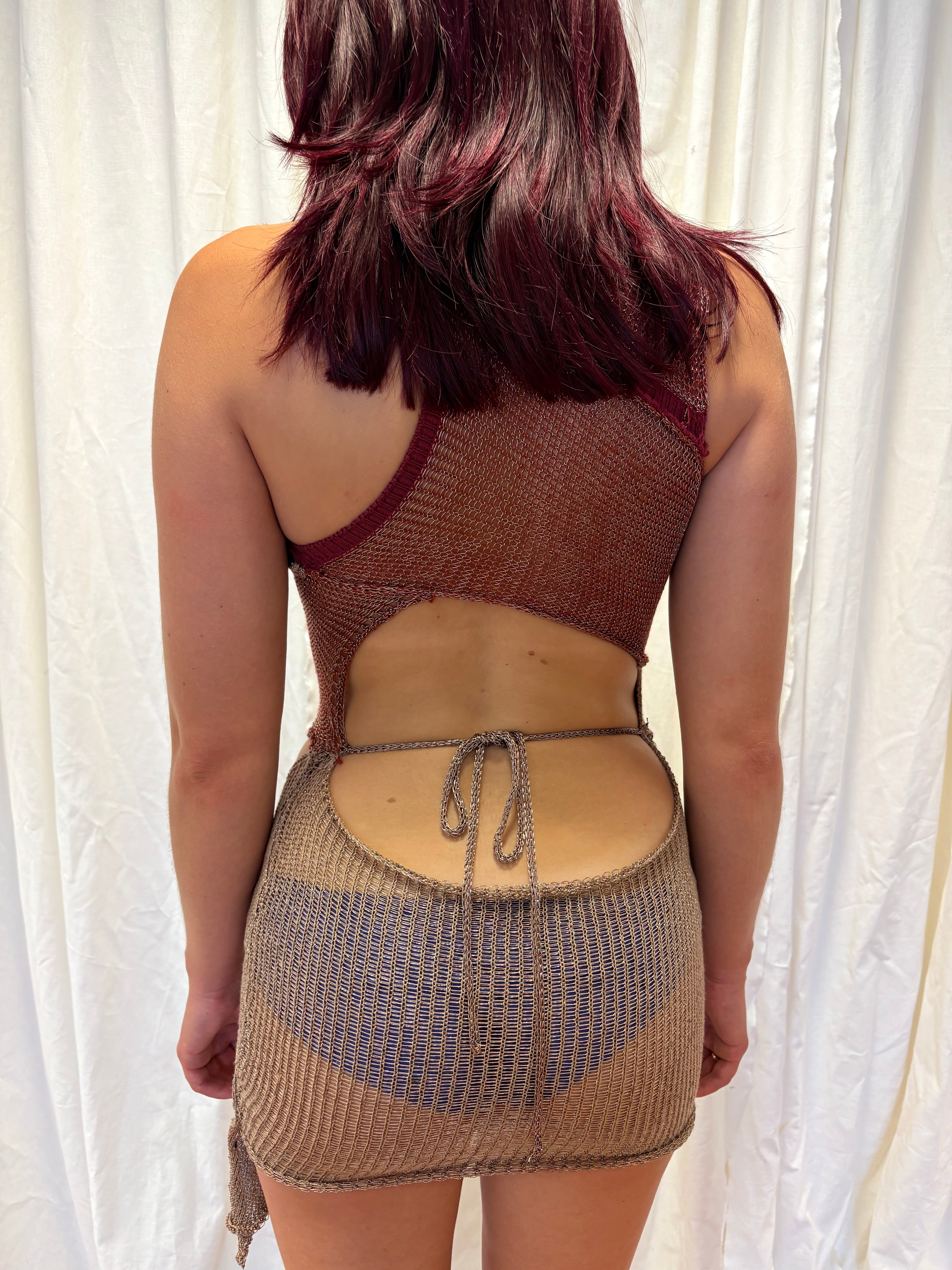 Knitted abstract mini dress. Burgundy and gold. Size XS Gold ties at the back for a closer fit. Hand wash only.