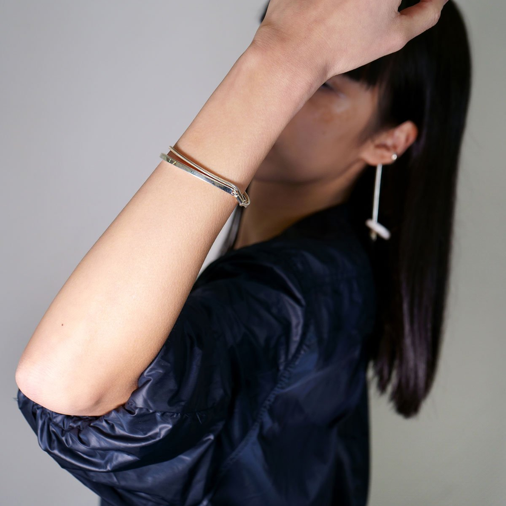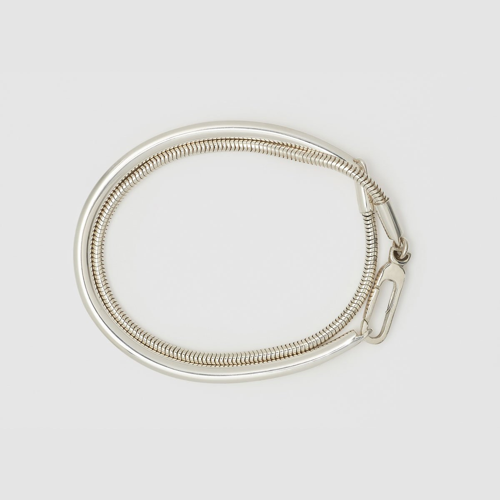 The Michel bracelet combines the silky snake chain with a silfer cuff. Can be worn with around your wrist or with the chain dangling from your hand.
